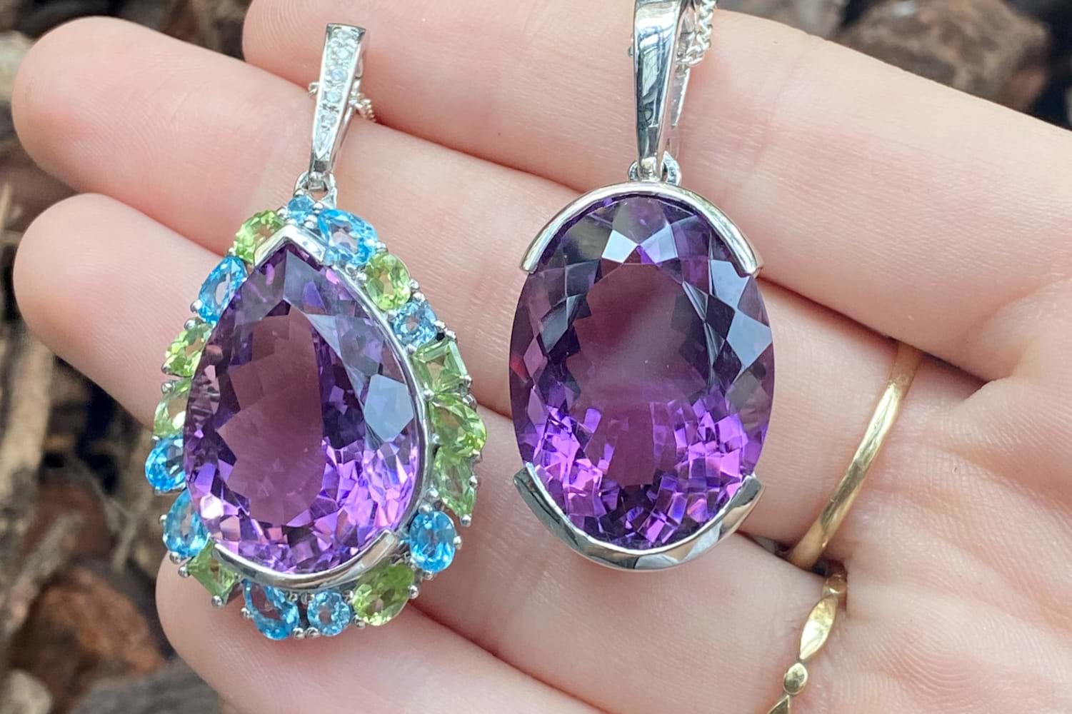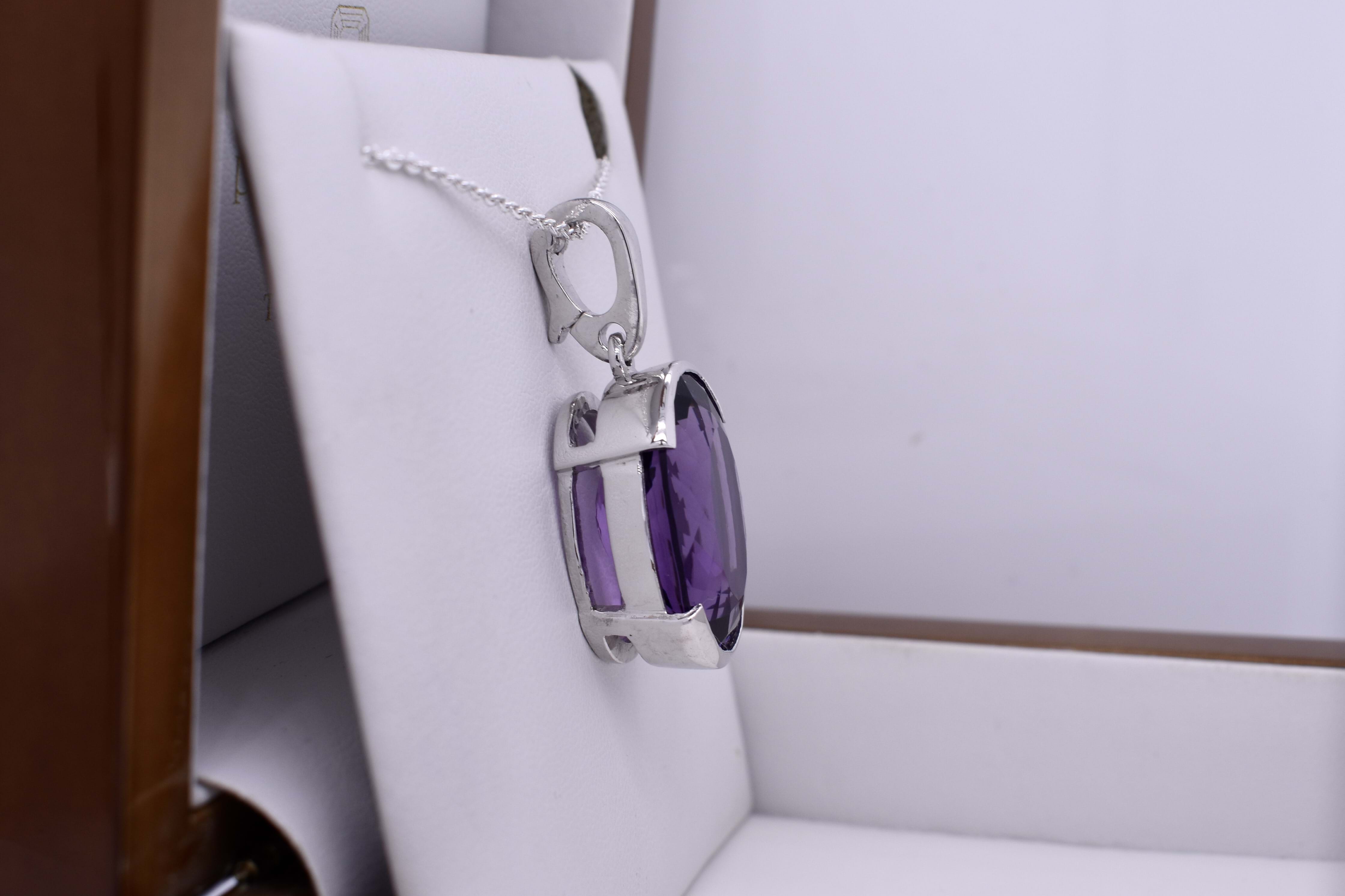 This simple yet vibrant oval shaped amethyst measures approx. 22.4x17.3mm, and is semi bezel set into sterling silver. Finished with a plain bale. Chains are available for separate purchase. Pictured in natural light with other pieces.