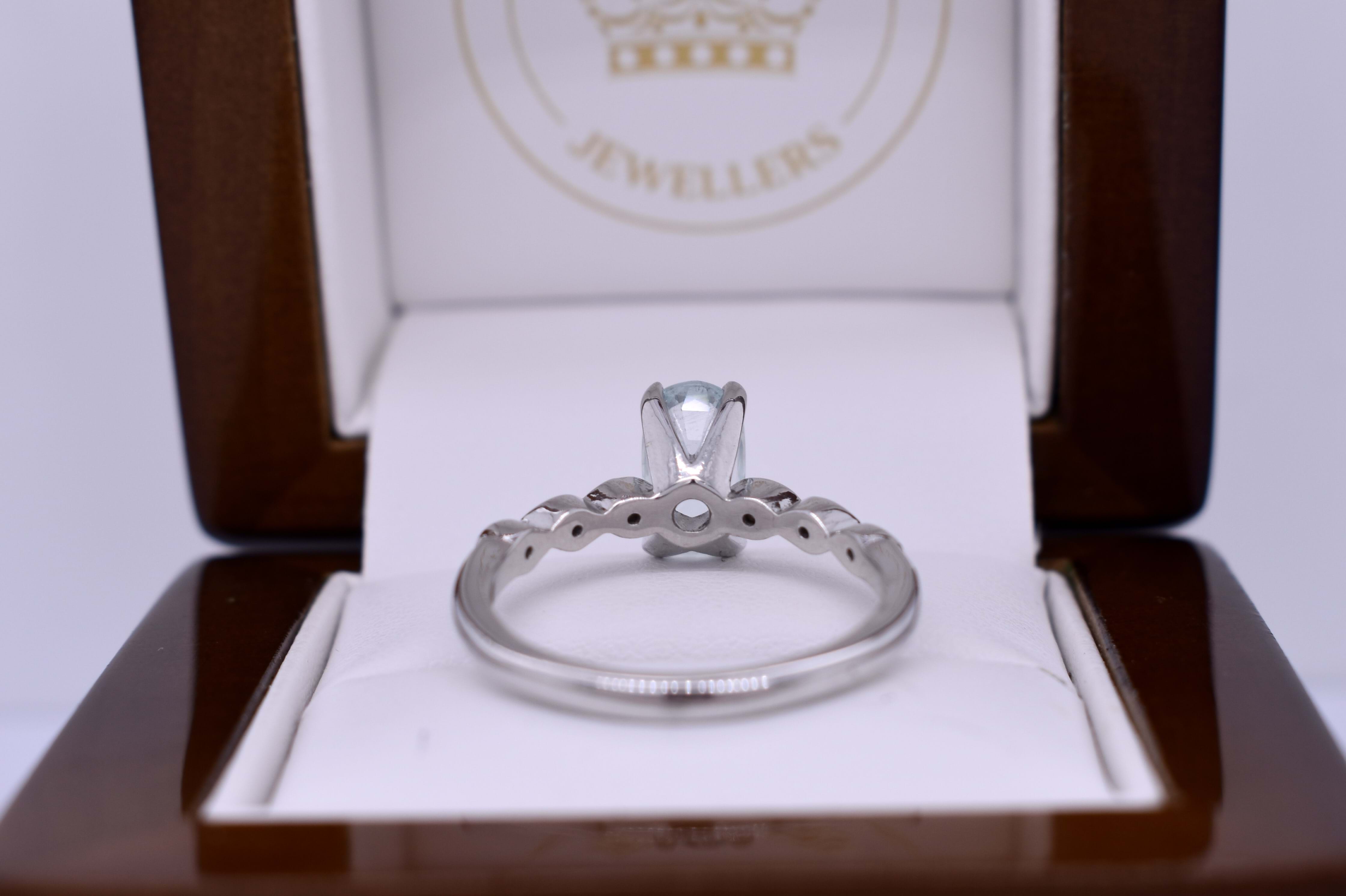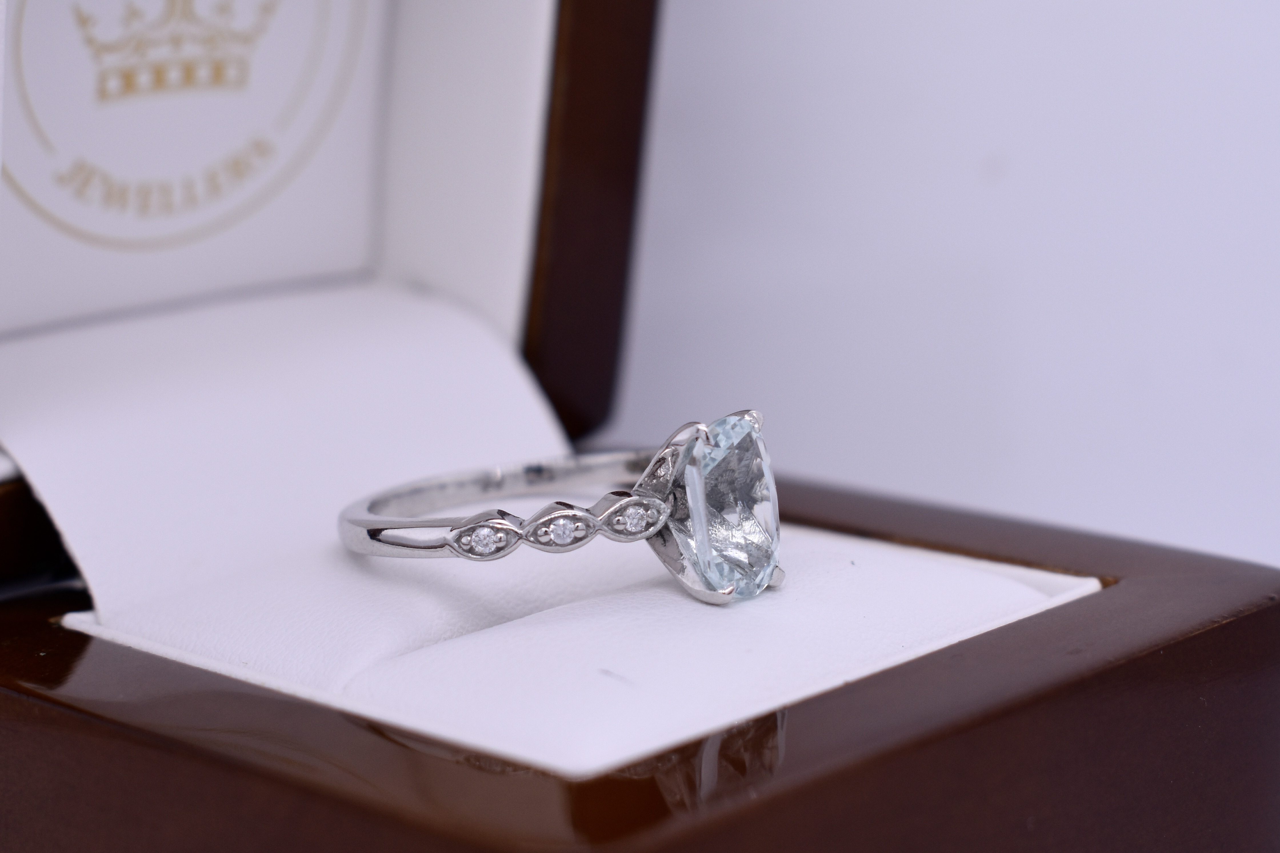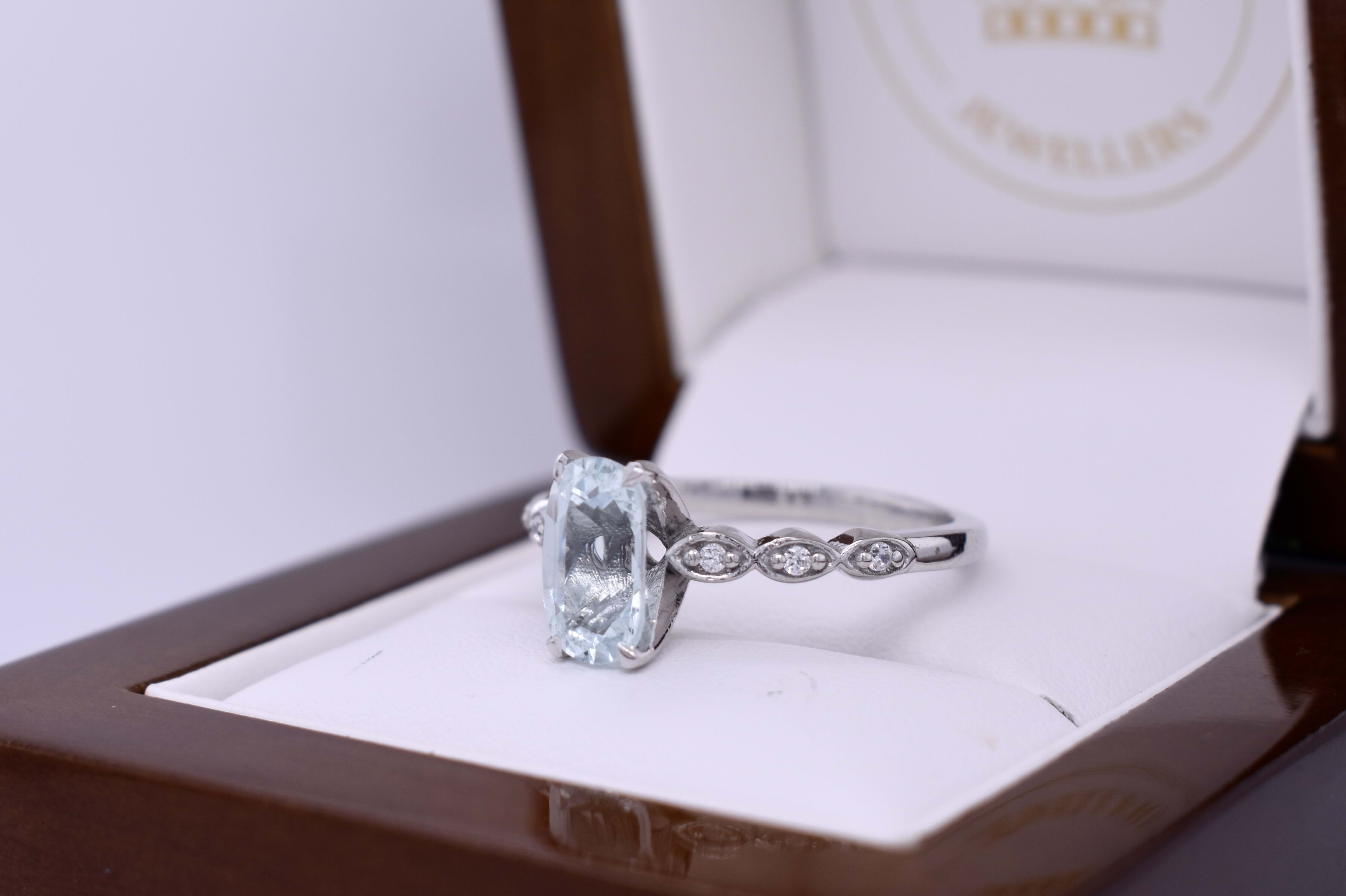 This pretty single stone ring features an oval shaped aquamarine measuring approx. 9.5x5.7mm, four claw set in sterling silver and finished on an art deco inspired CZ infused band. Finger size S.