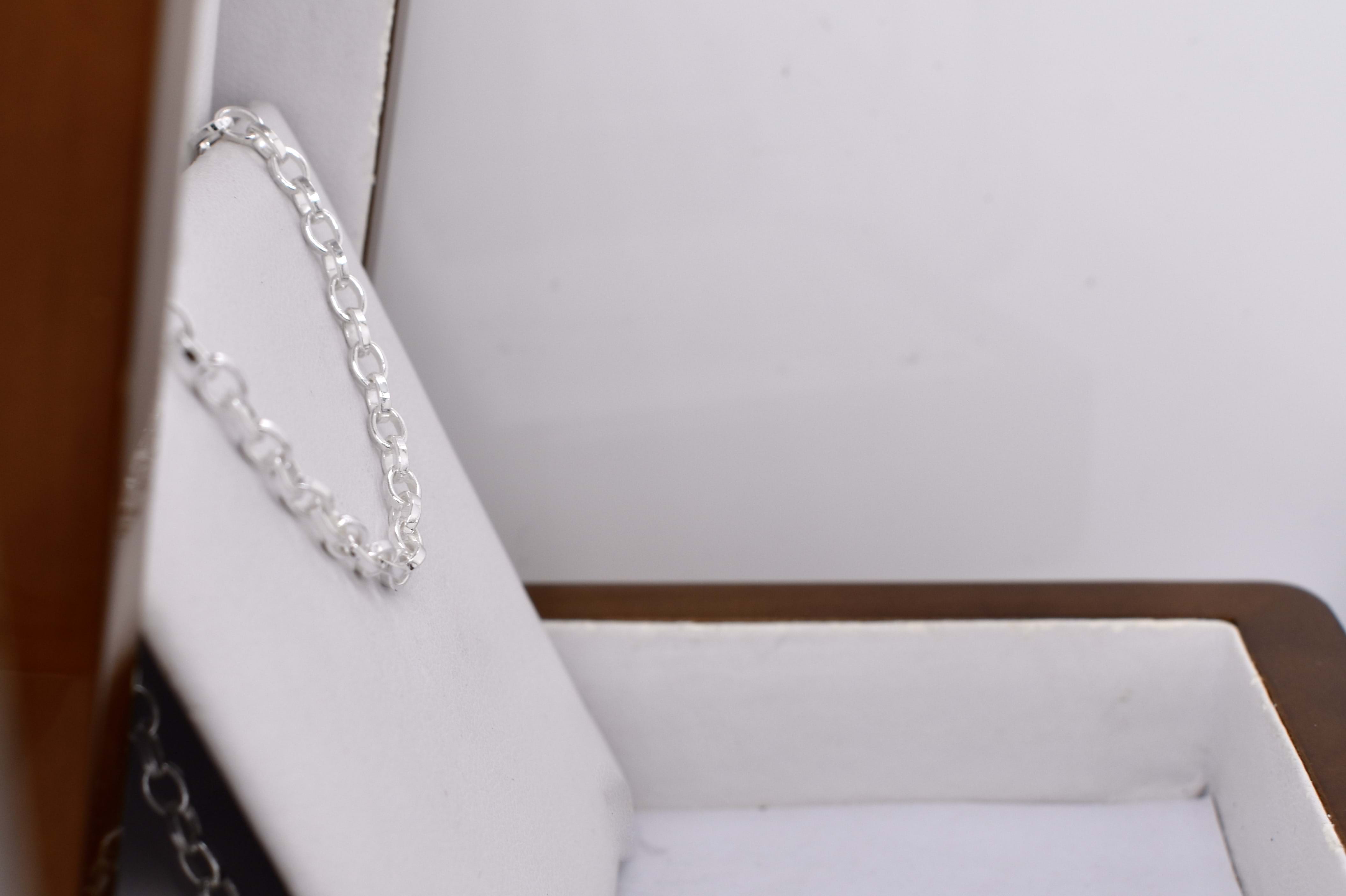 A simple oval belcher link chain, crafted in sterling silver, measuring 55cm long. Complete with a parrot clasp. Chain weighs 9.7 grams.
