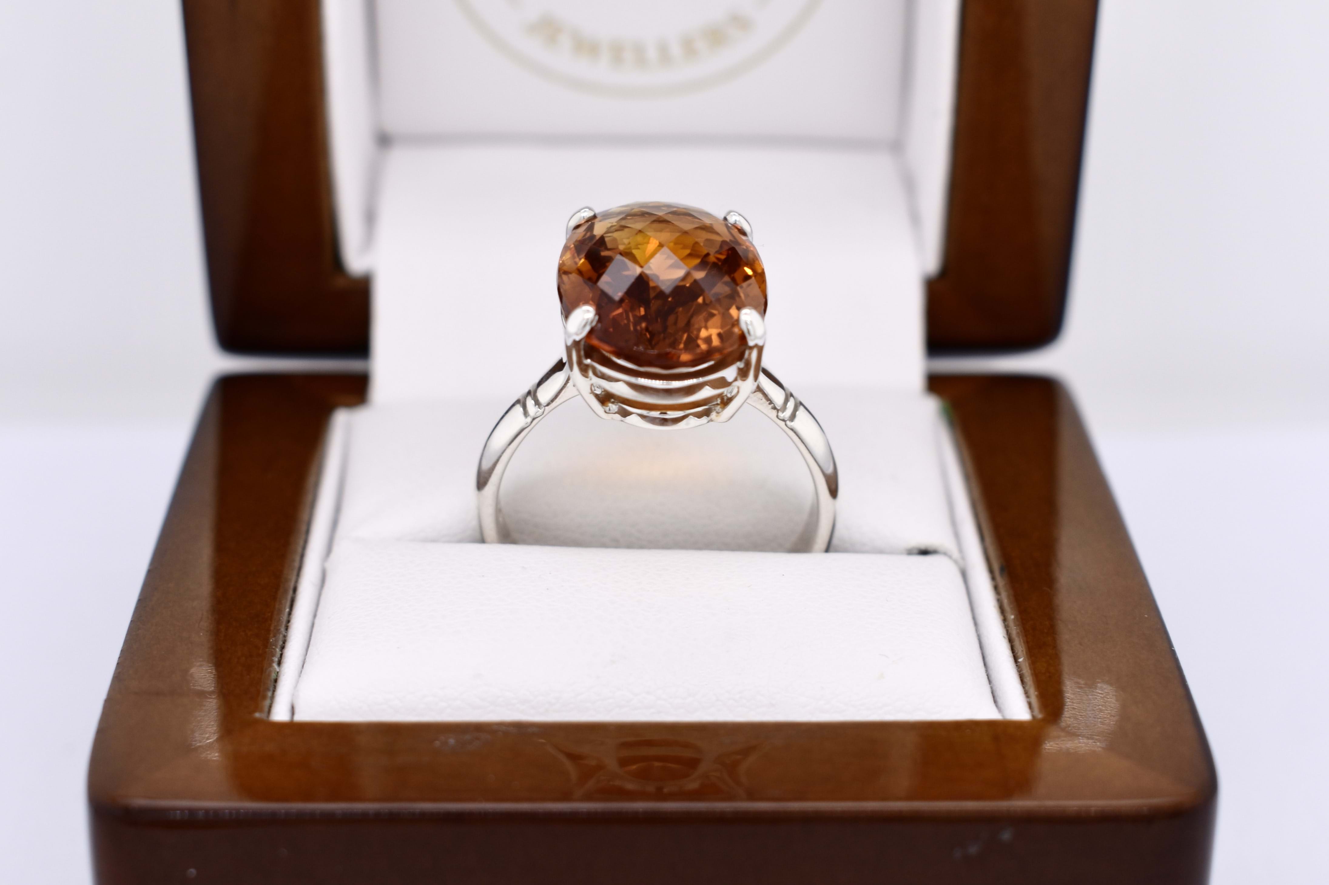 A stunning burnt orange oval shaped citrine ring, four claw set, in sterling silver. This handmade ring measures 17.7x12.4mm and is completed with a grooved silver band. Finger size T+.