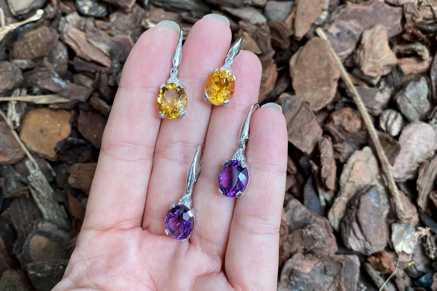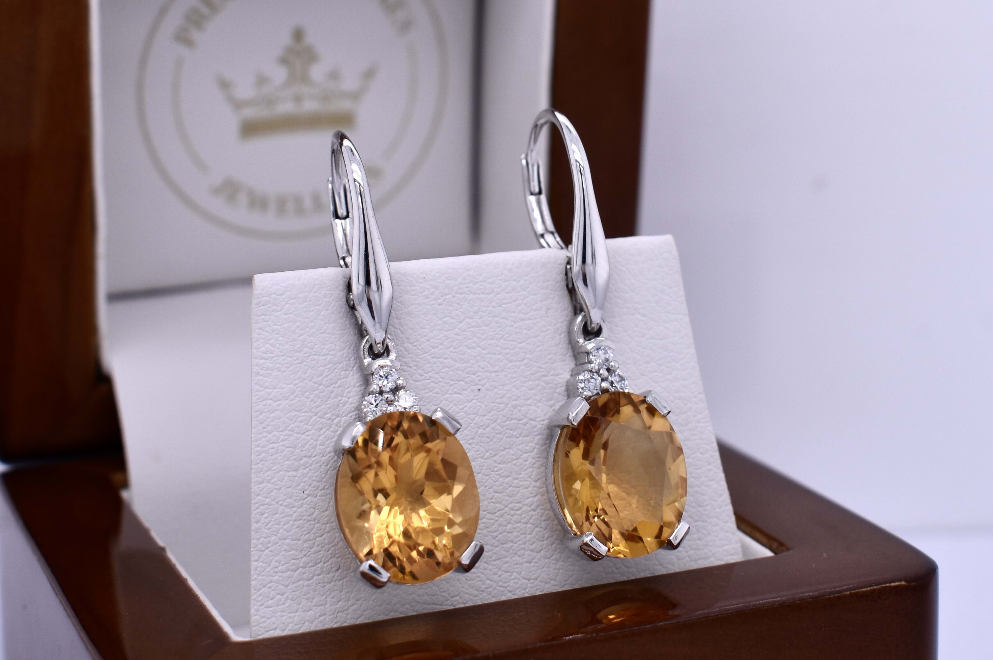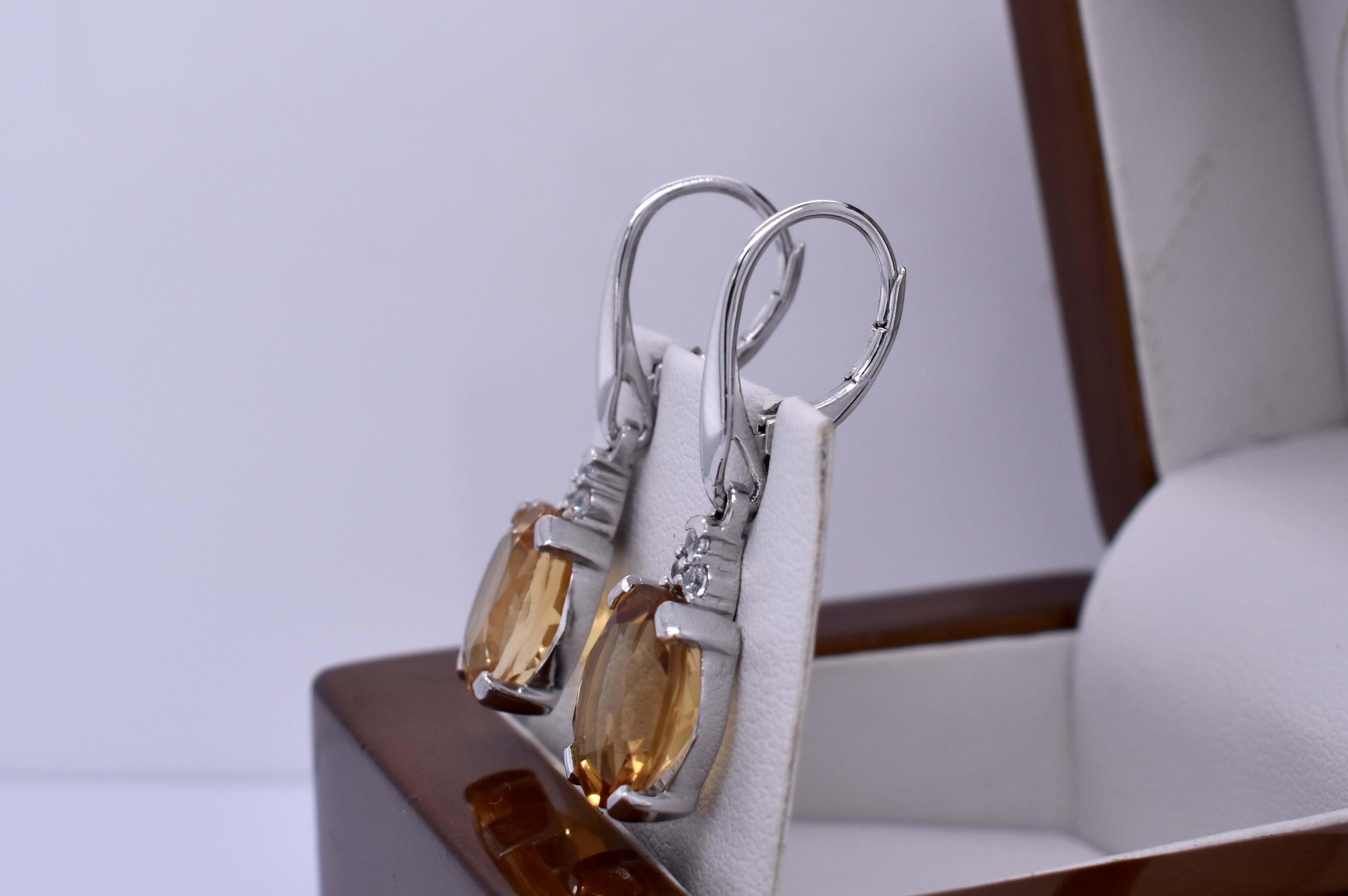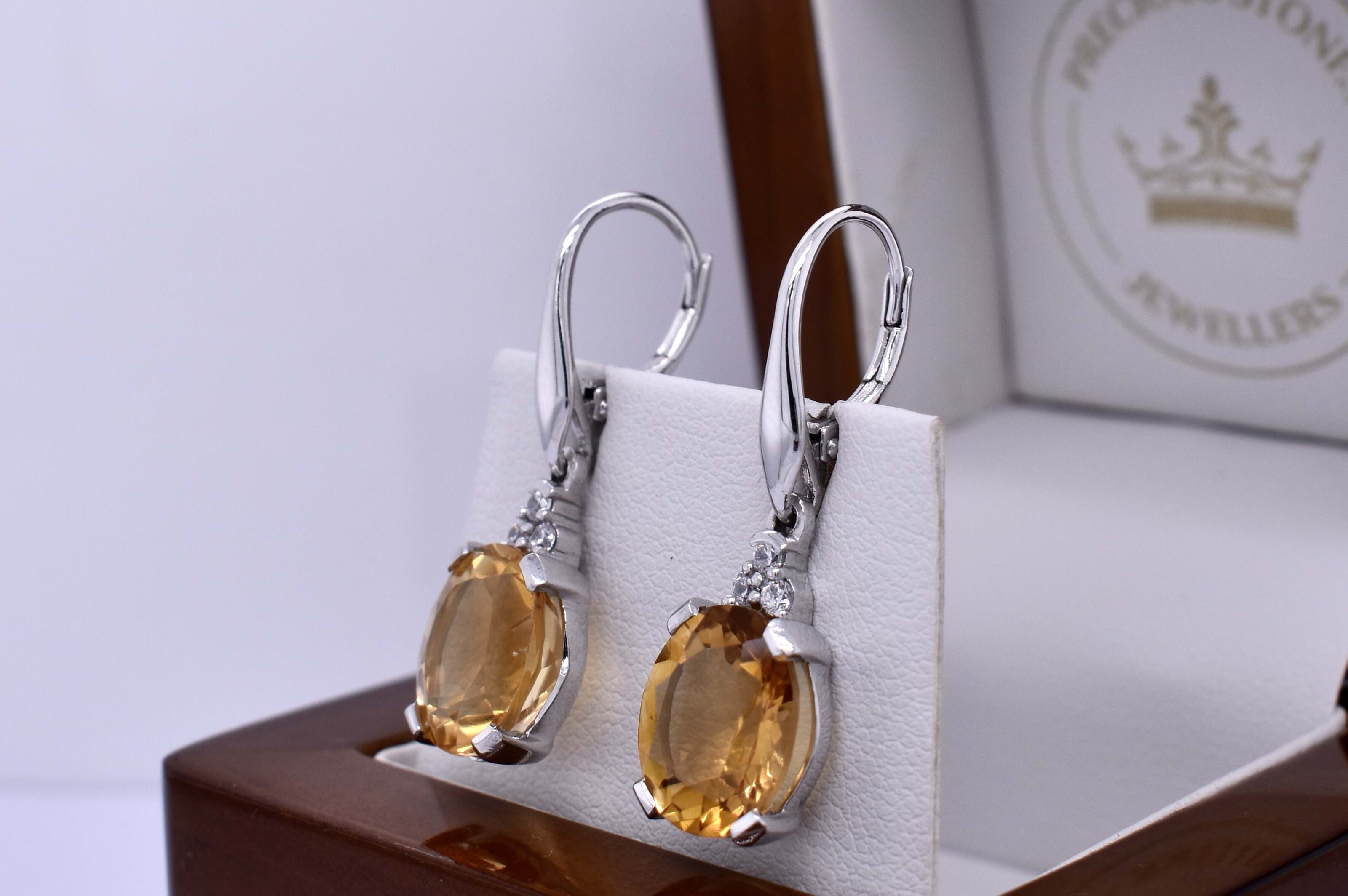 Bright and dazzling, these oval citrines measure approximately 11.8x9.7mm and are four claw set in sterling silver settings, complimented with sparkly CZ accents. Finished with continental clips for comfort and security. Photographed outside with other pieces (Available for seperate purchase)