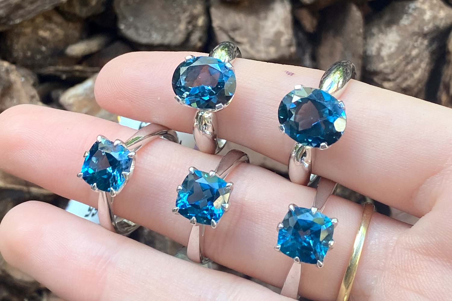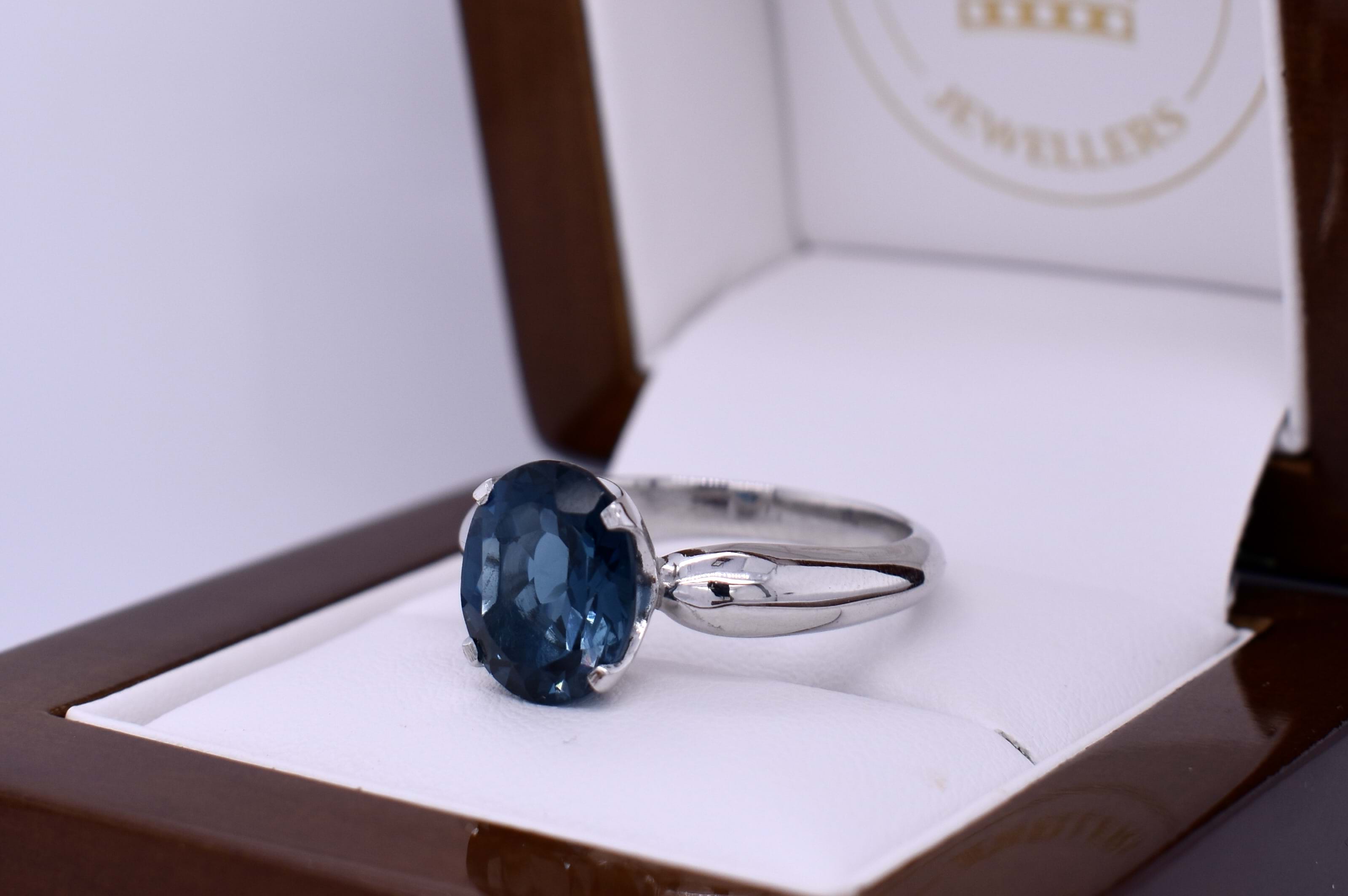 This dazzling ring features a 11.1x9.1mm London Blue Topaz, four claw set in sterling silver, it is finished on a plain sterling silver band. Finger size L. Photographed outside with other pieces (Available for seperate purchase)