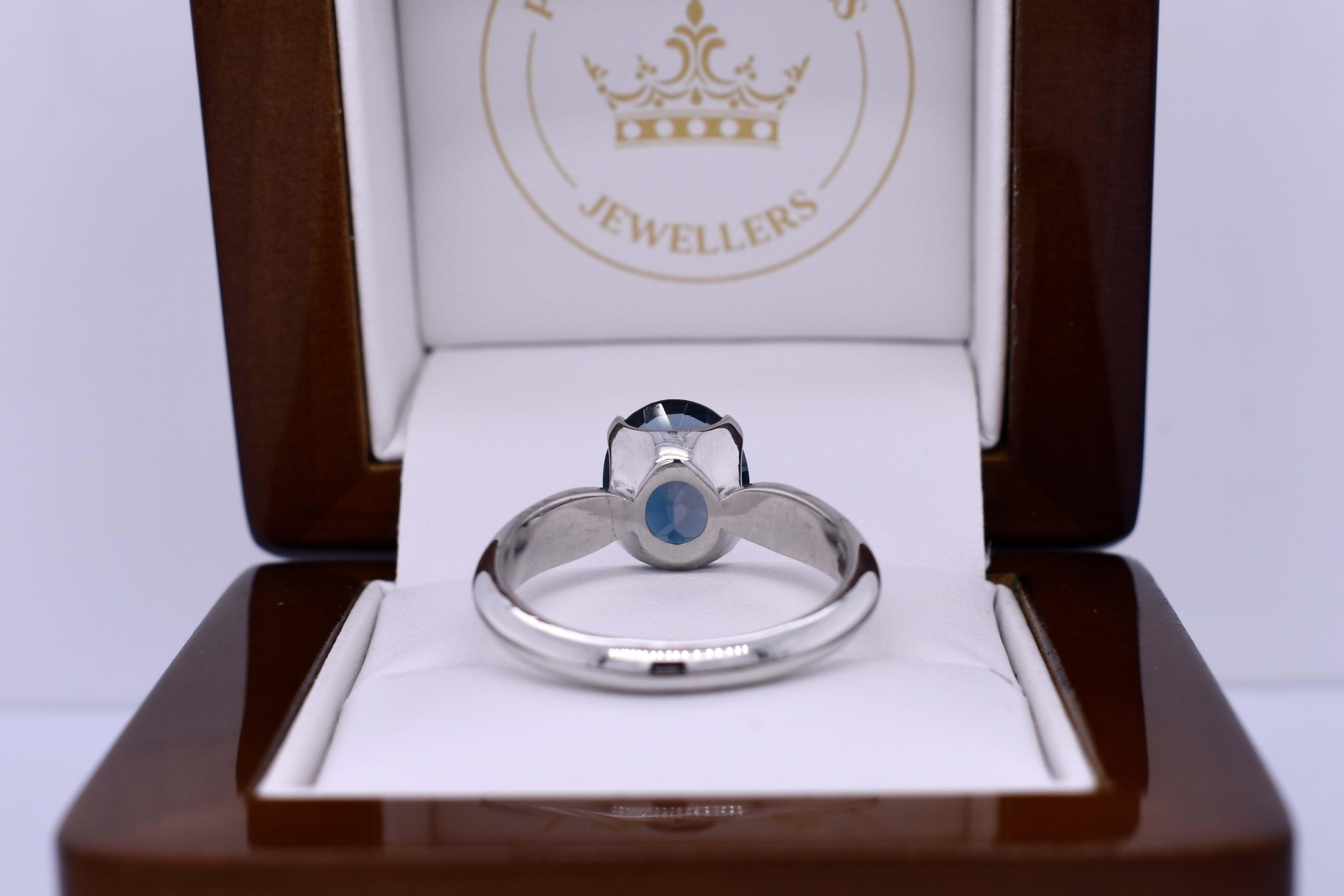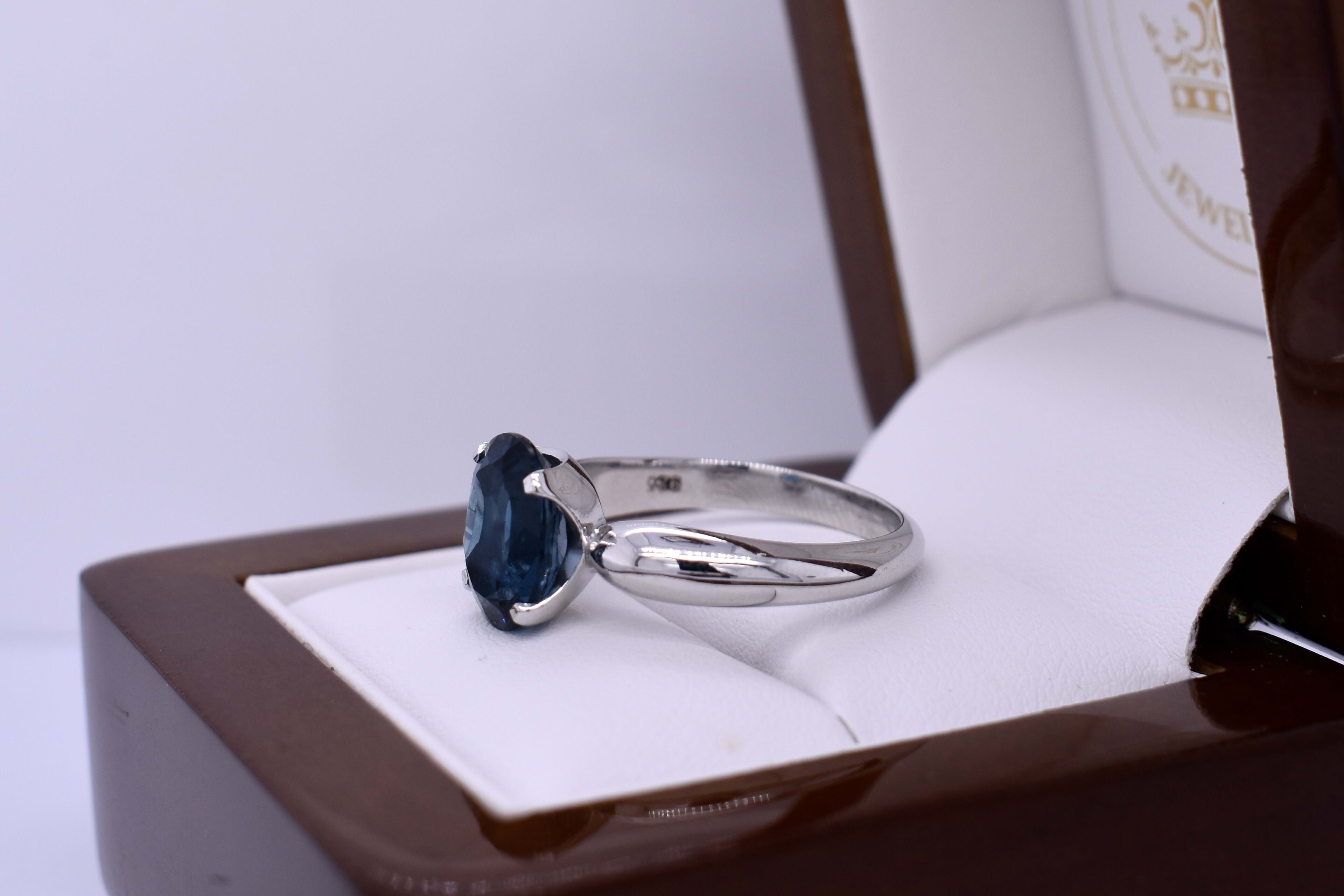 This gorgeous ring is straight out of a dream. Simple yet stunning, it features a 11.1x9.1mm London Blue Topaz, four claw set in sterling silver, and finished on a plain band. Finger size T. Photographed outside with other pieces (Available for seperate purchase)