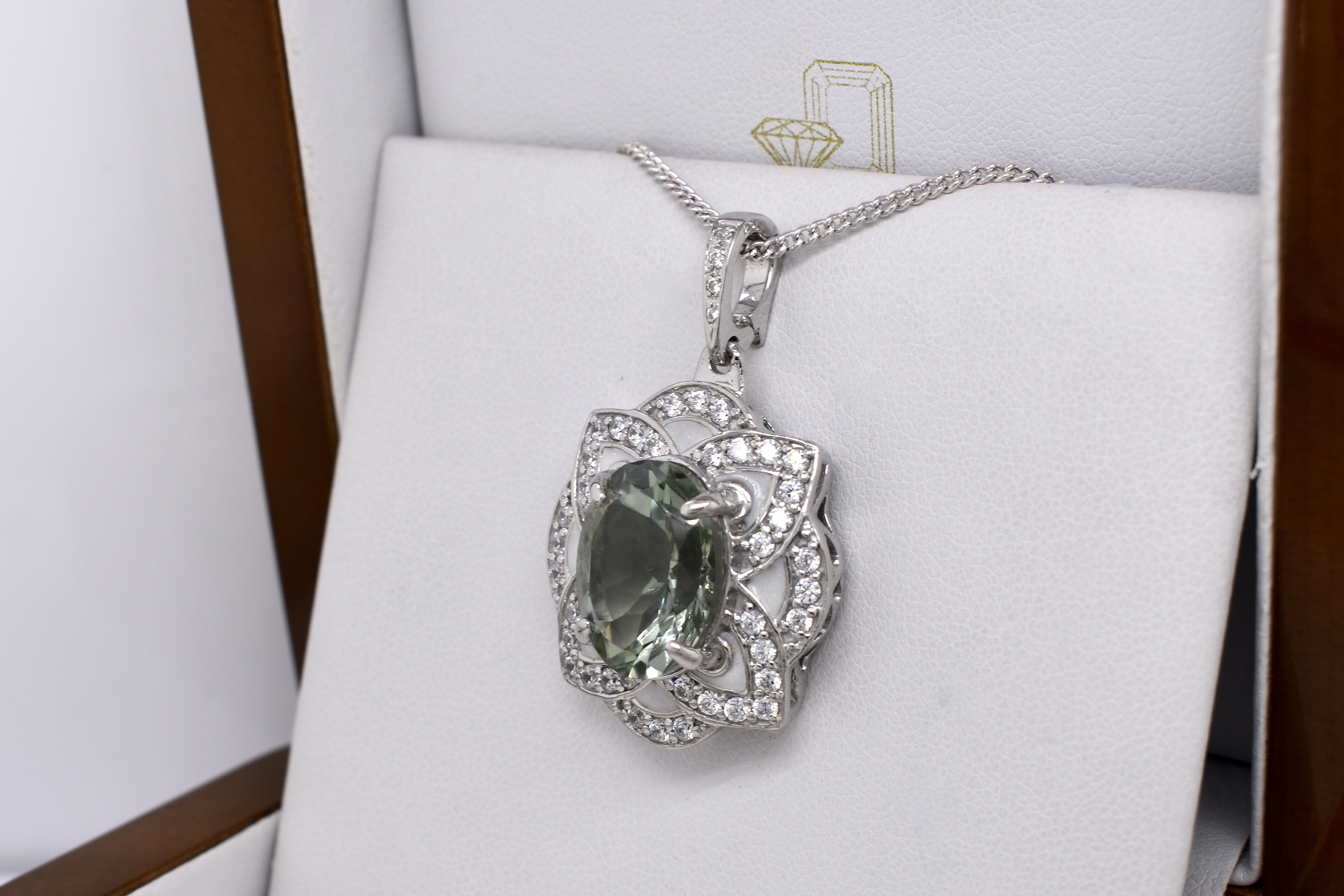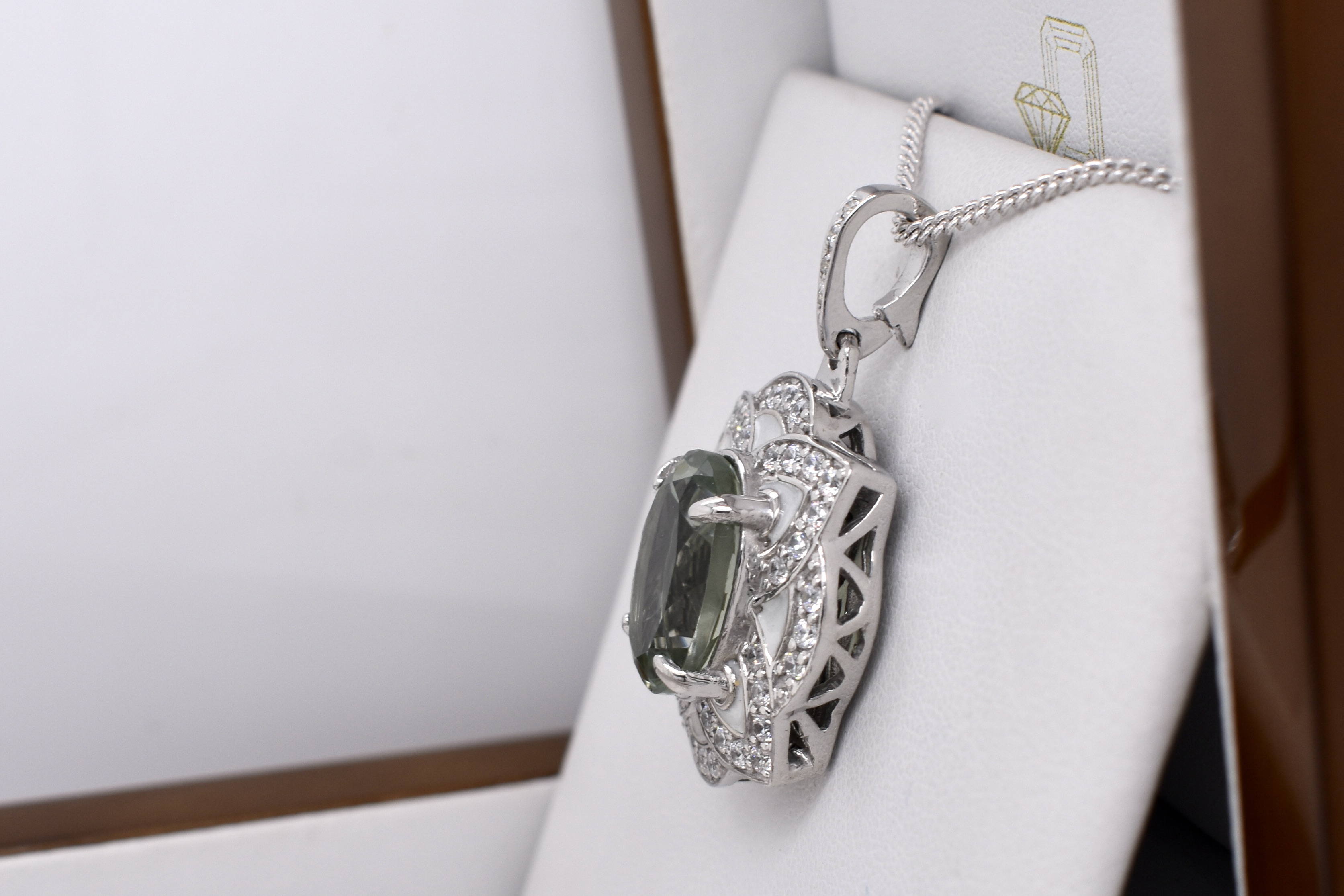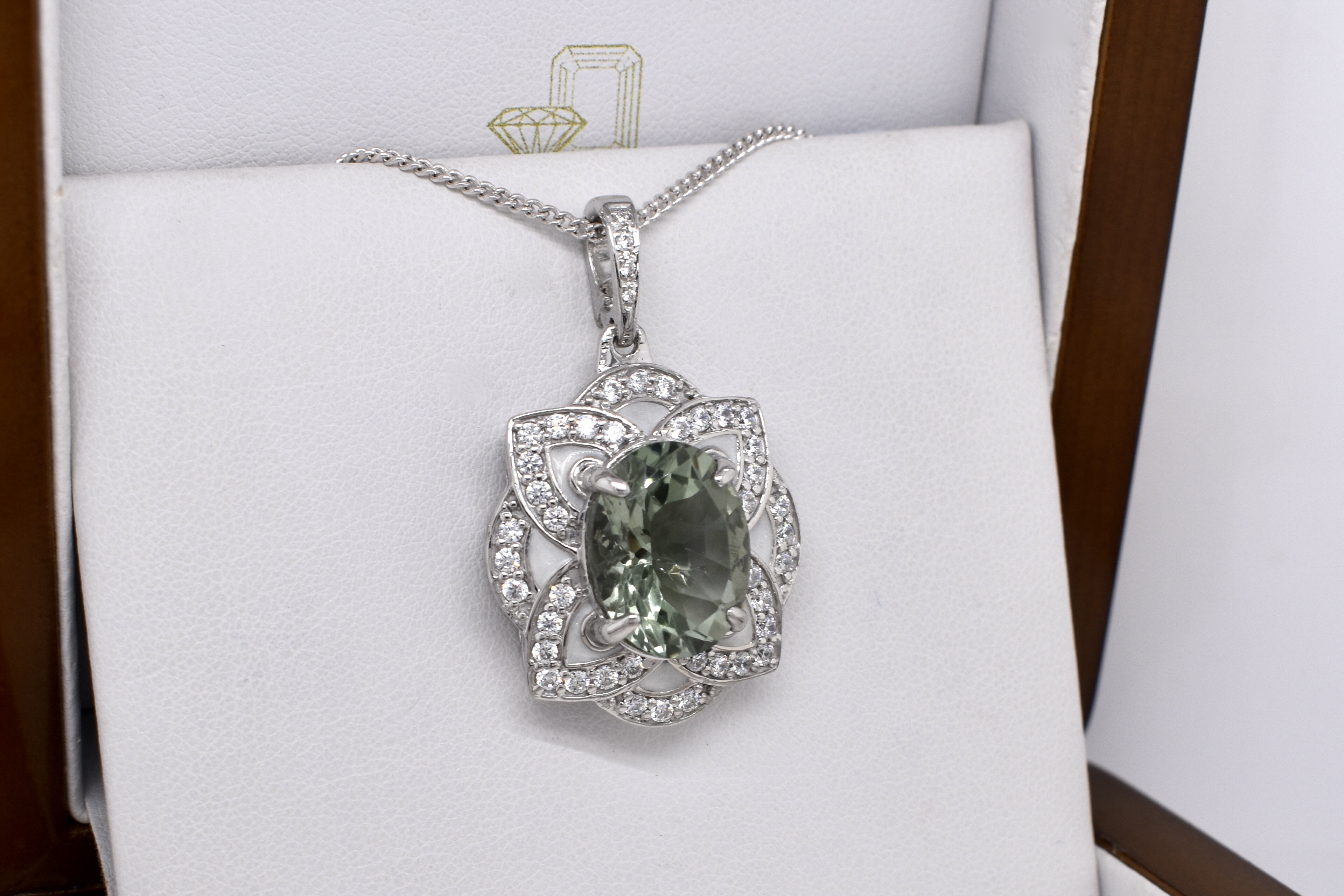 This stunning sterling silver enhancer, featuring a centre prasiolite oval shaped stone, measuring 15.55x11.87mm, 4 claw set. The border is made up of white enamel detailing and cubic zirconias, in this floral design. The enhancer bale is also studded with shimmering CZs. The enhancer bale allows the piece to be worn on a fine chain as well as being clipped onto pearls, bolt rings and heavier link chains.