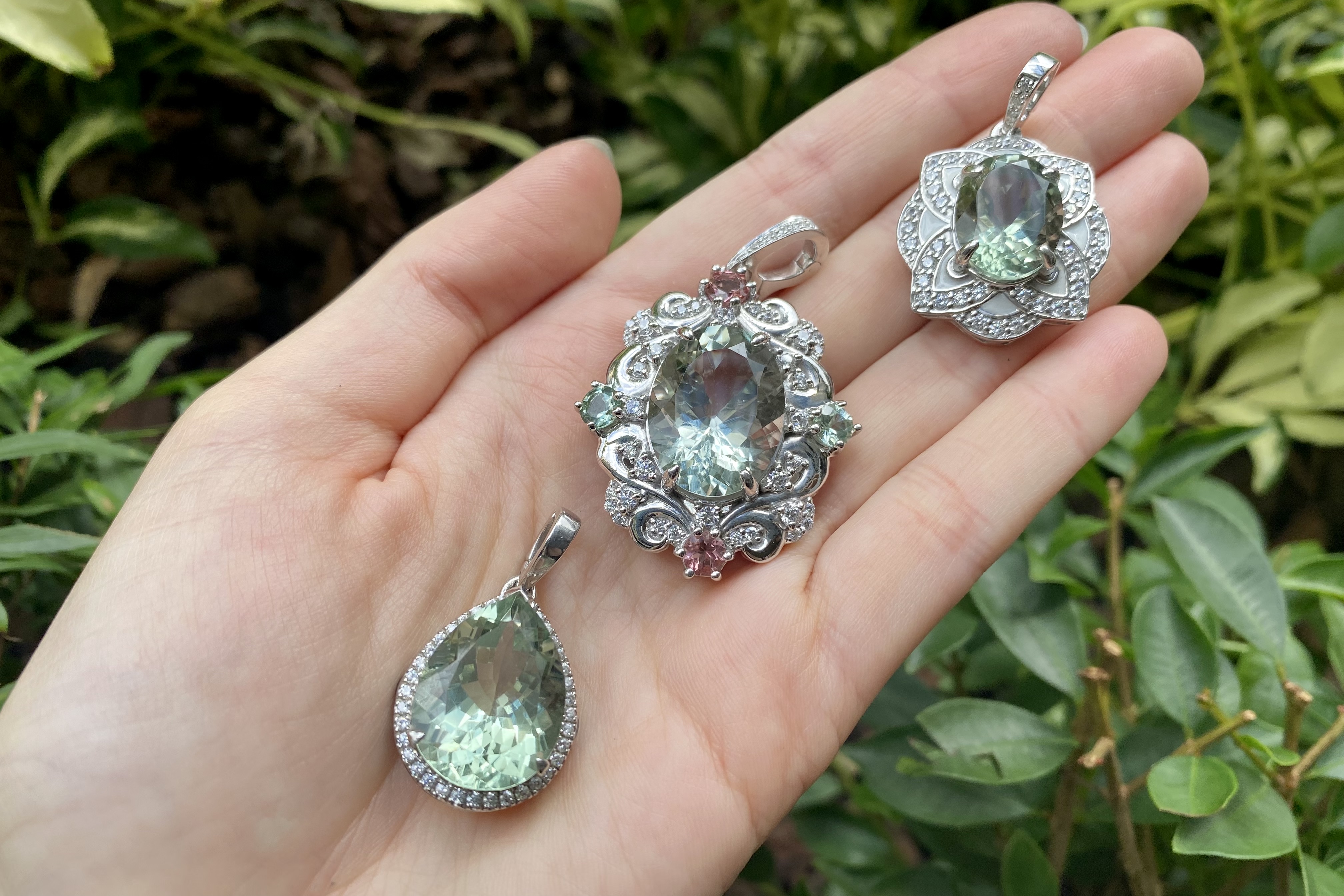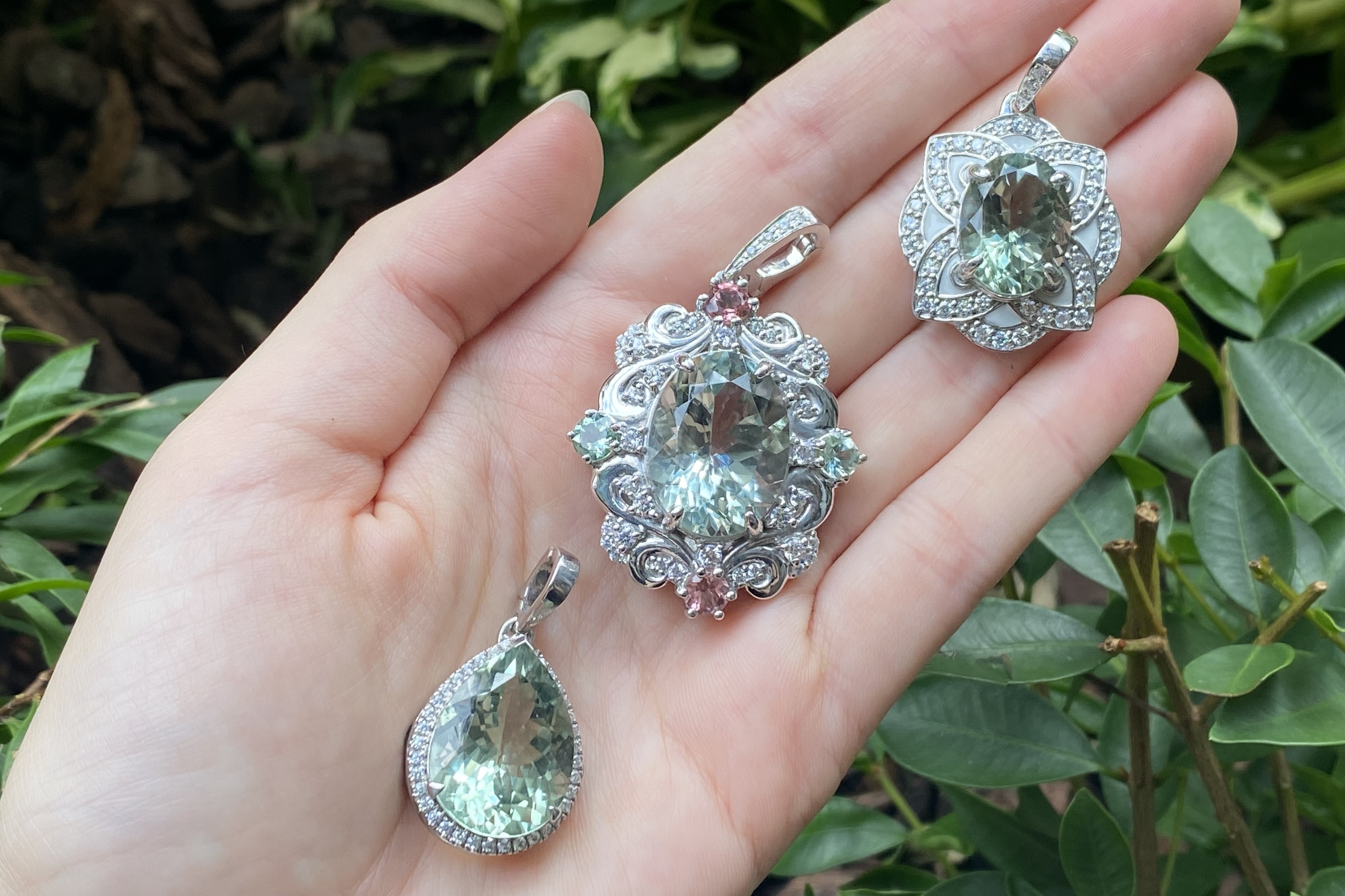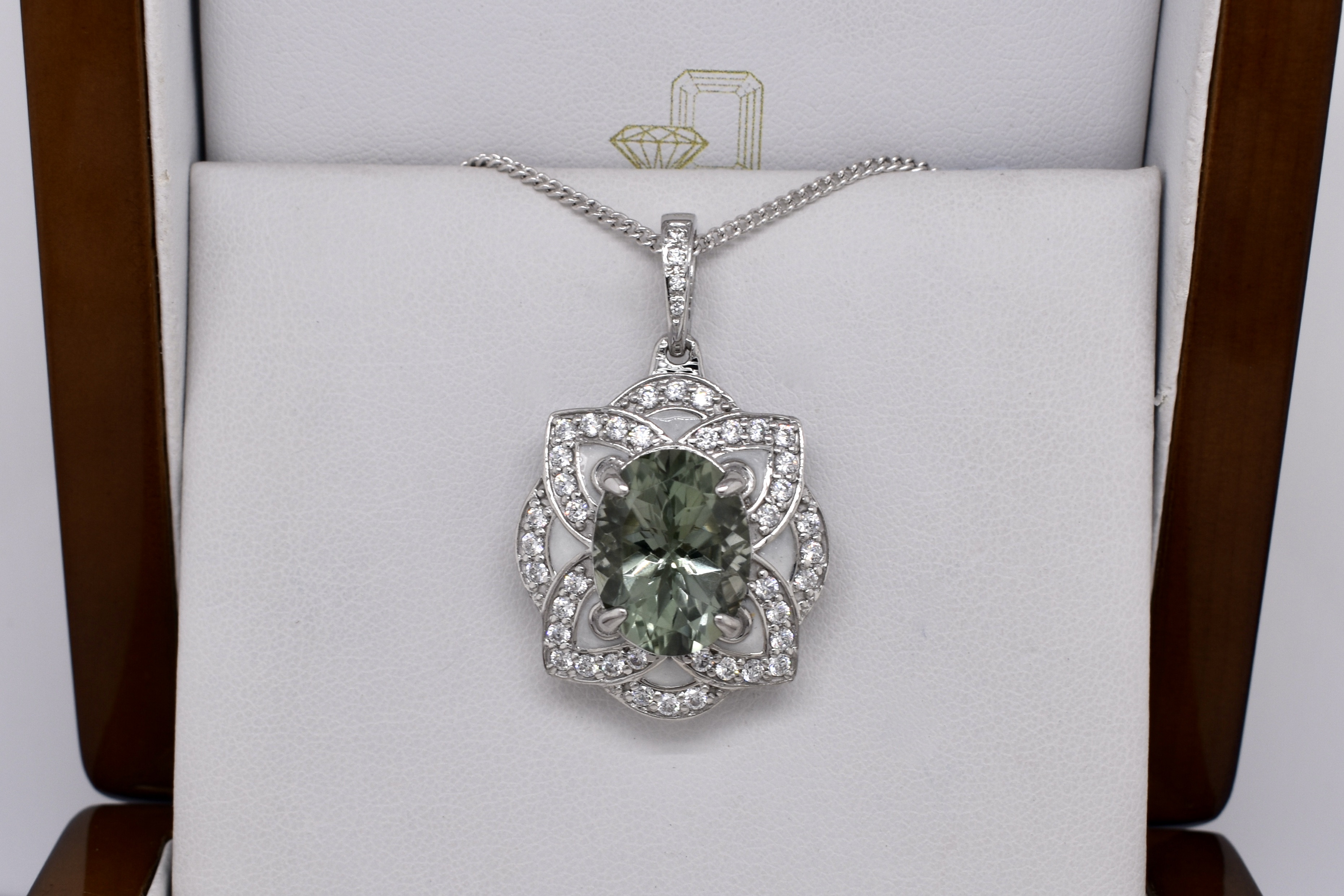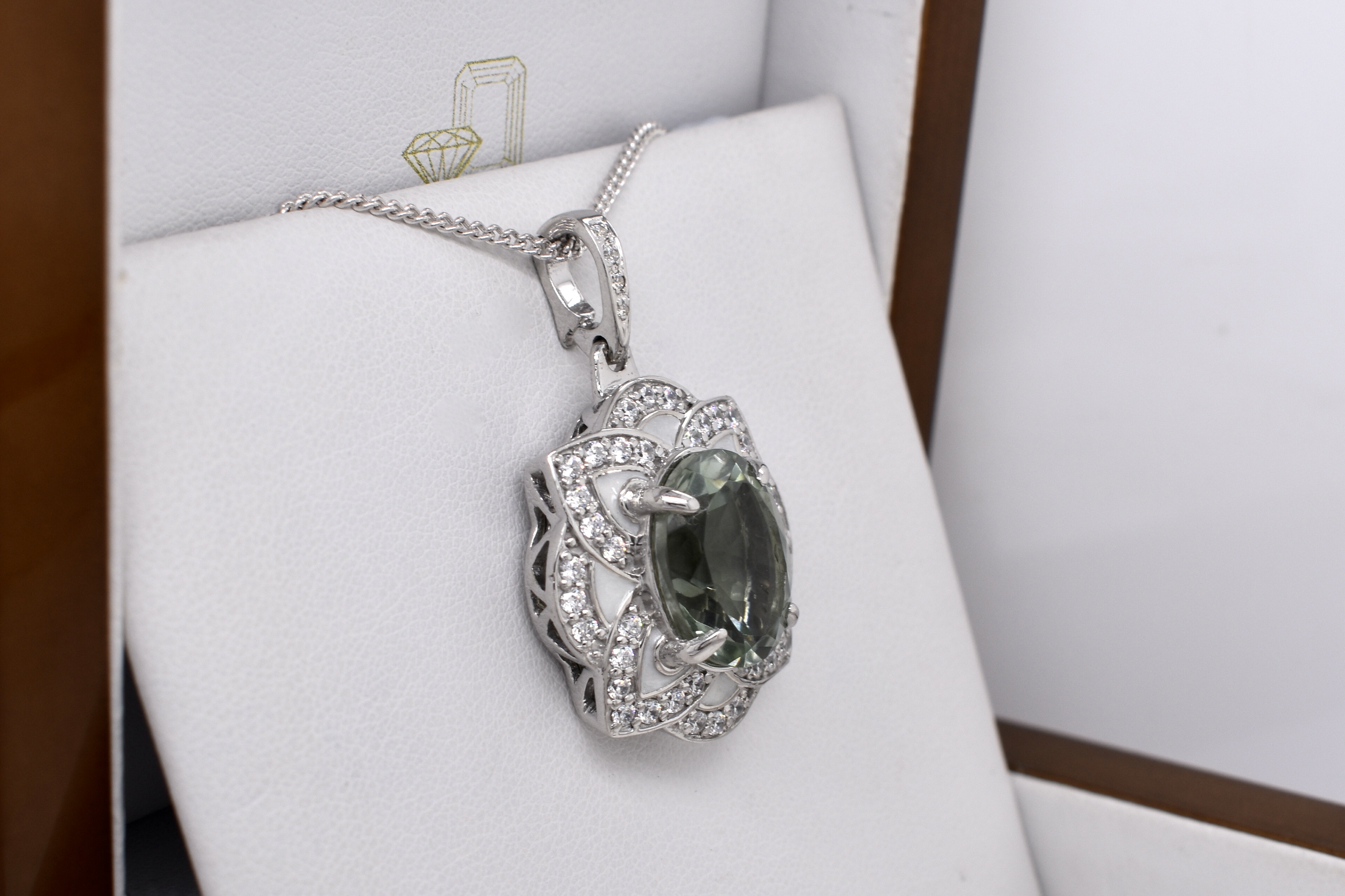This stunning sterling silver enhancer, featuring a centre prasiolite oval shaped stone, measuring 15.55x11.87mm, 4 claw set. The border is made up of white enamel detailing and cubic zirconias, in this floral design. The enhancer bale is also studded with shimmering CZs. The enhancer bale allows the piece to be worn on a fine chain as well as being clipped onto pearls, bolt rings and heavier link chains.
