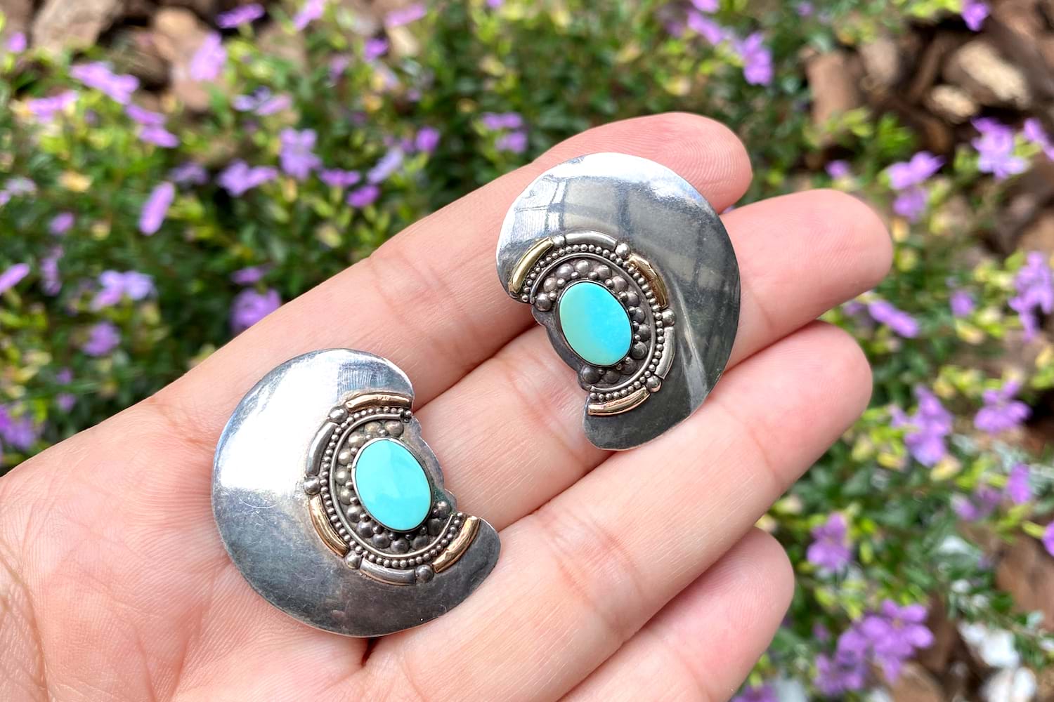 These vintage Native American earrings feature 9x6mm turquoise in the centre and measure a total of 32x25mm. They are made in sterling silver and have an array of detailing around the turquoise with some being 18ct rose gold. Total weight 6.9 grams. Finished with clipped post and butterfly fittings.