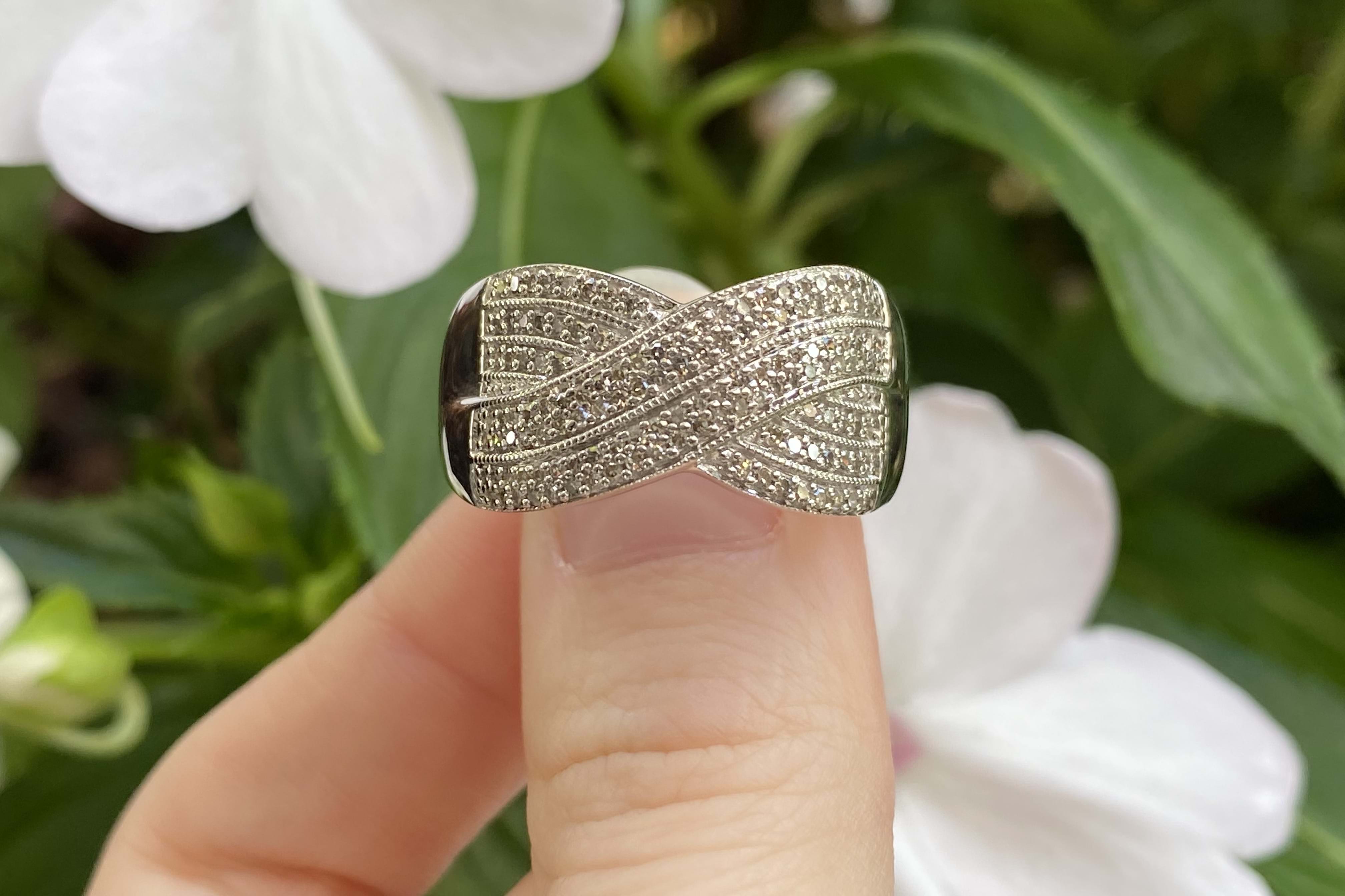 Beautiful 10ct white gold vintage ring, featuring 136 single cut diamonds, bead set, in a wide swirl crossover design. Diamonds measuring 1.1mm, totalling 0.91ct JK VS-SI. Finished on a half round tapering 12-13mm band. Finger size V+. Independent Valuation Supplied.