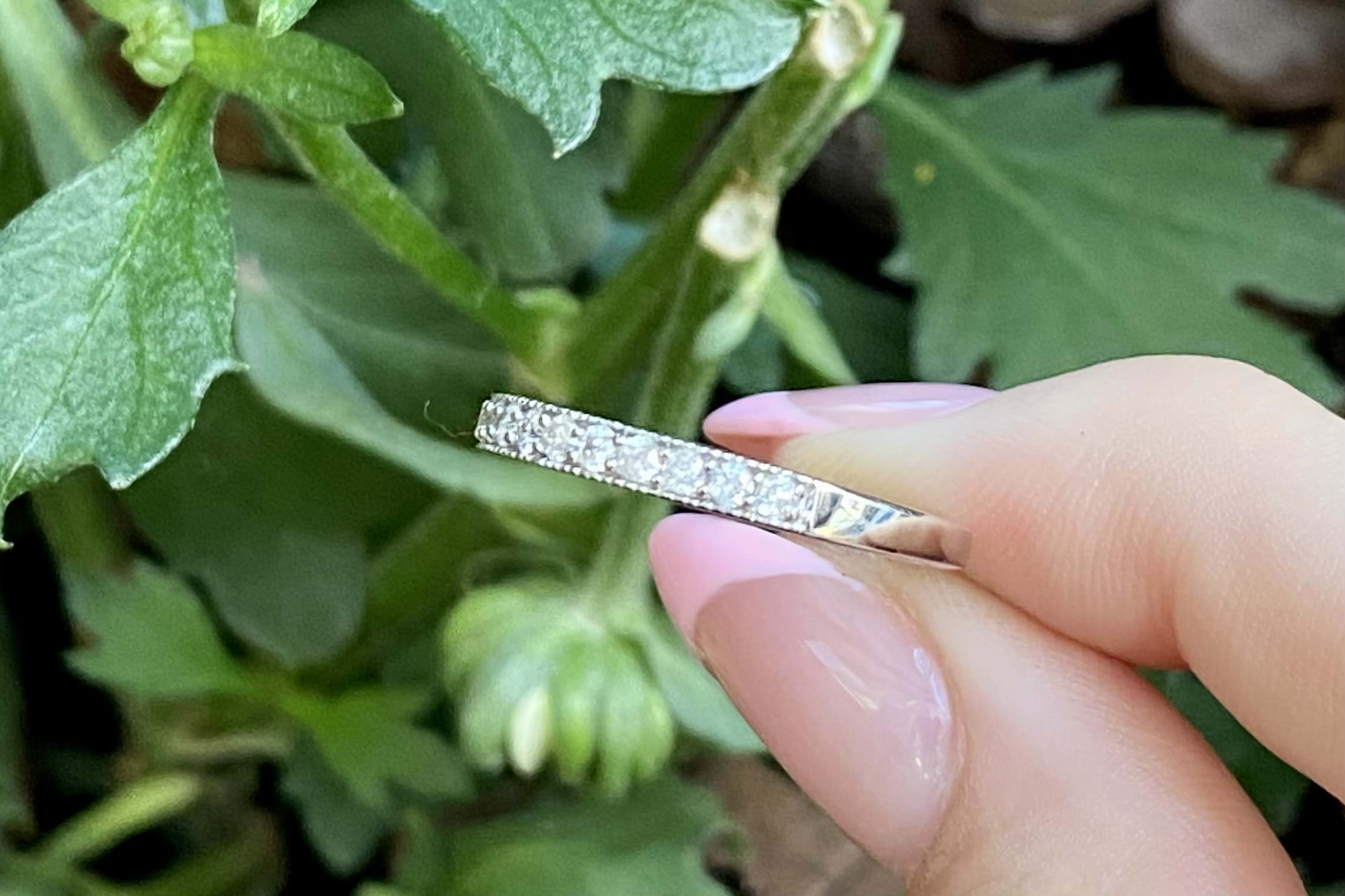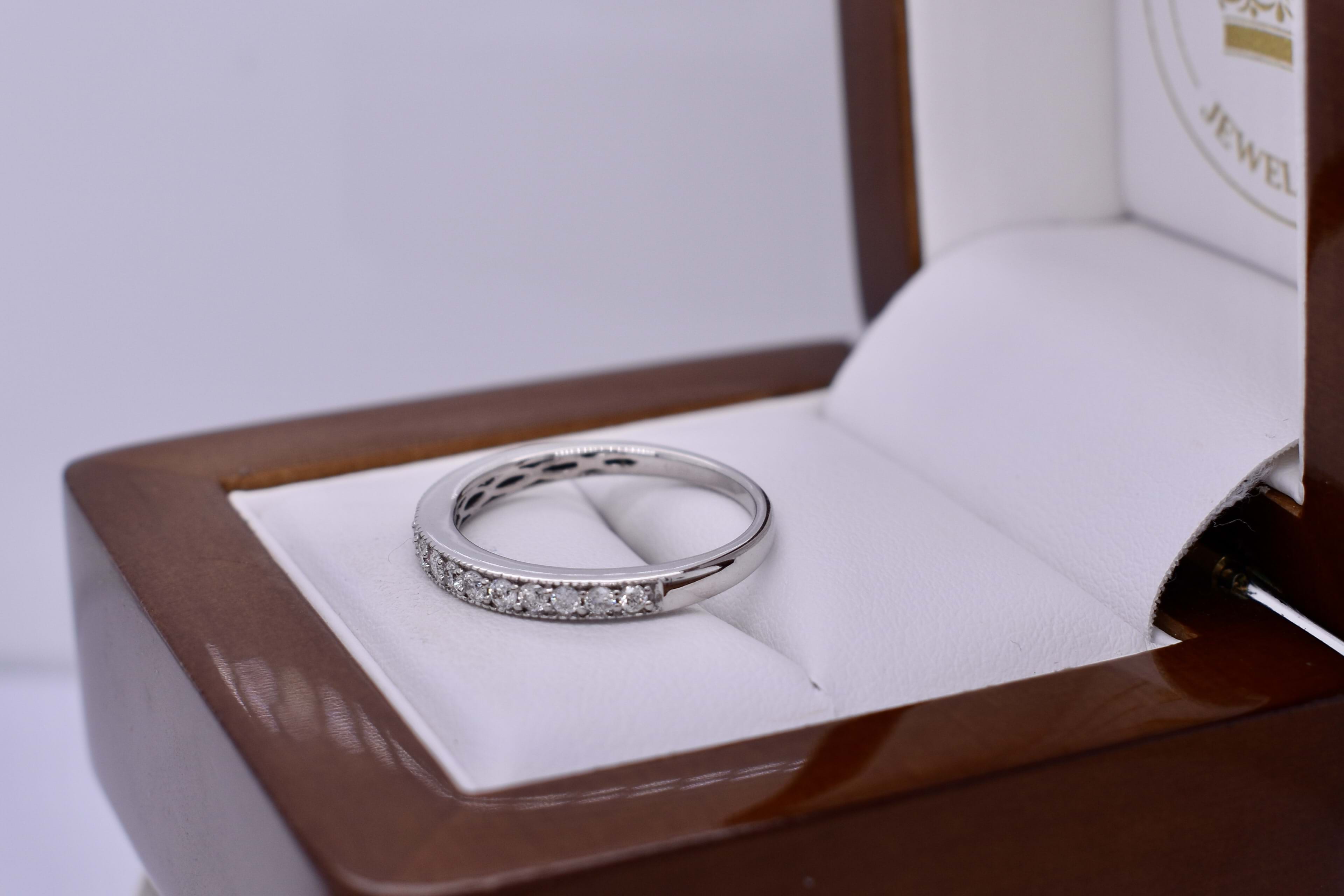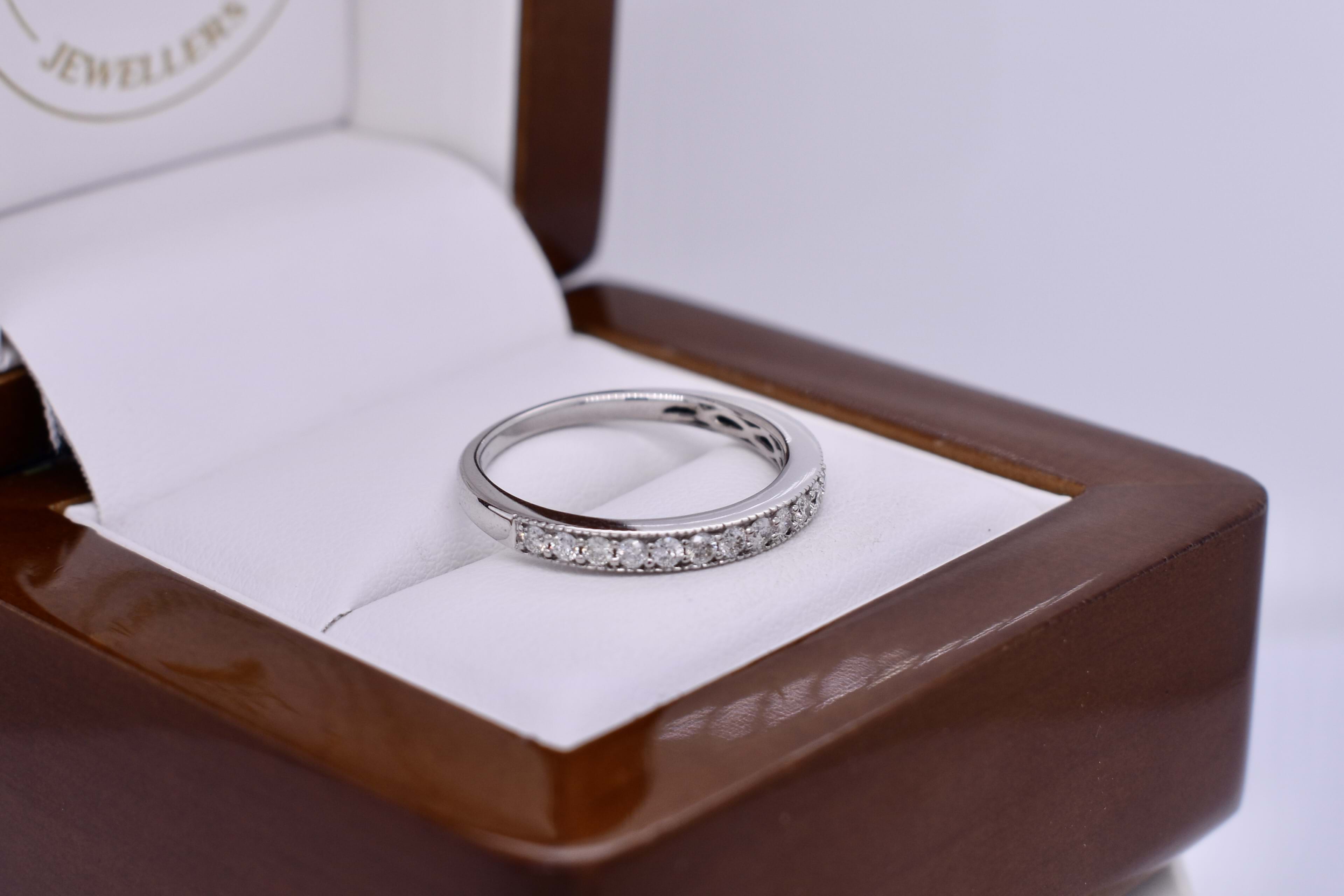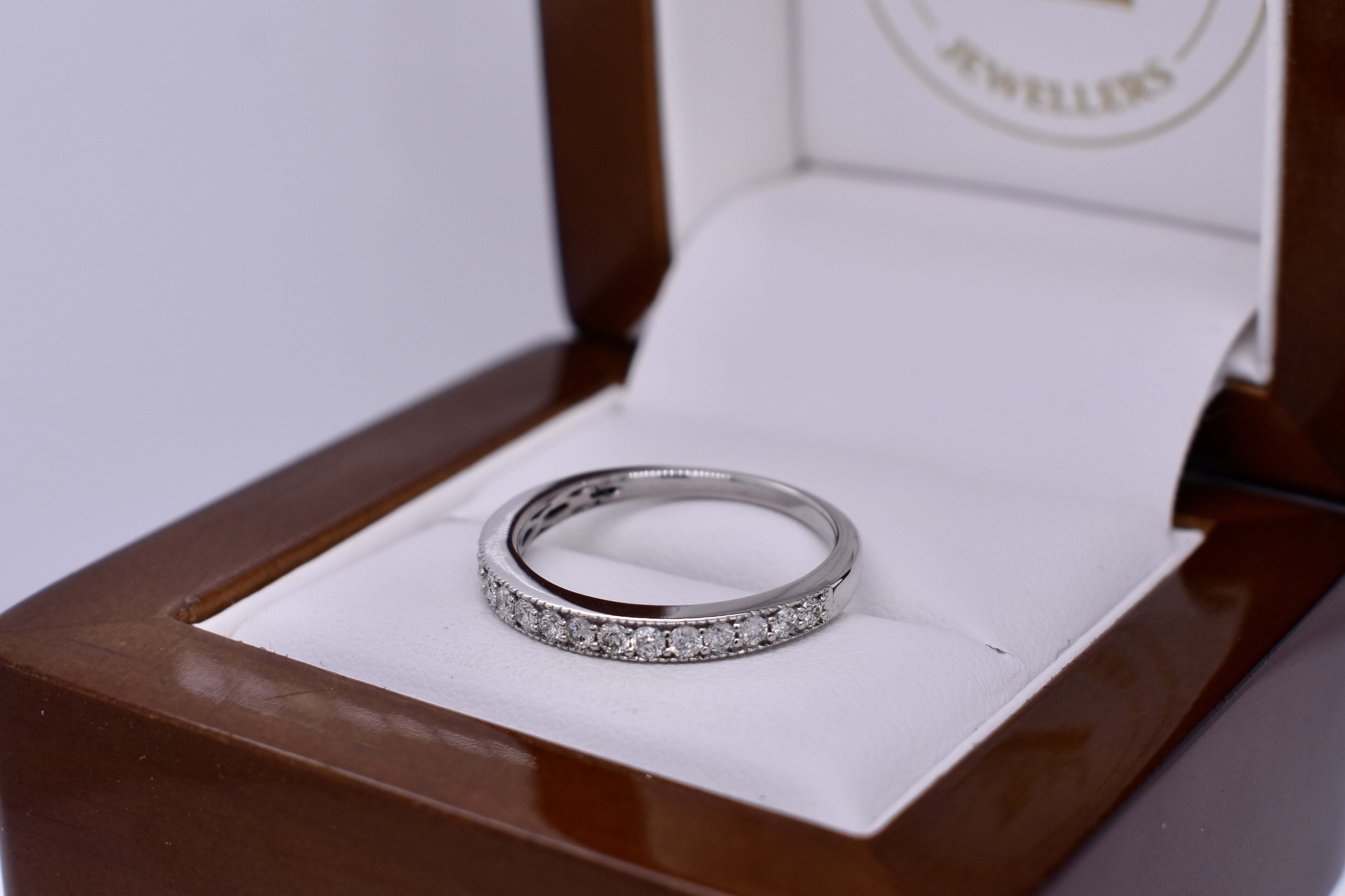 Crafted in 14ct white gold this gorgeous vintage diamond band features 16 scintillating round brilliant cut 1.85mm diamonds bead claw set totalling 0.40cts HP2. A perfect wedding, eternity or dress ring. Finger Size N. Independent Valuation Supplied.