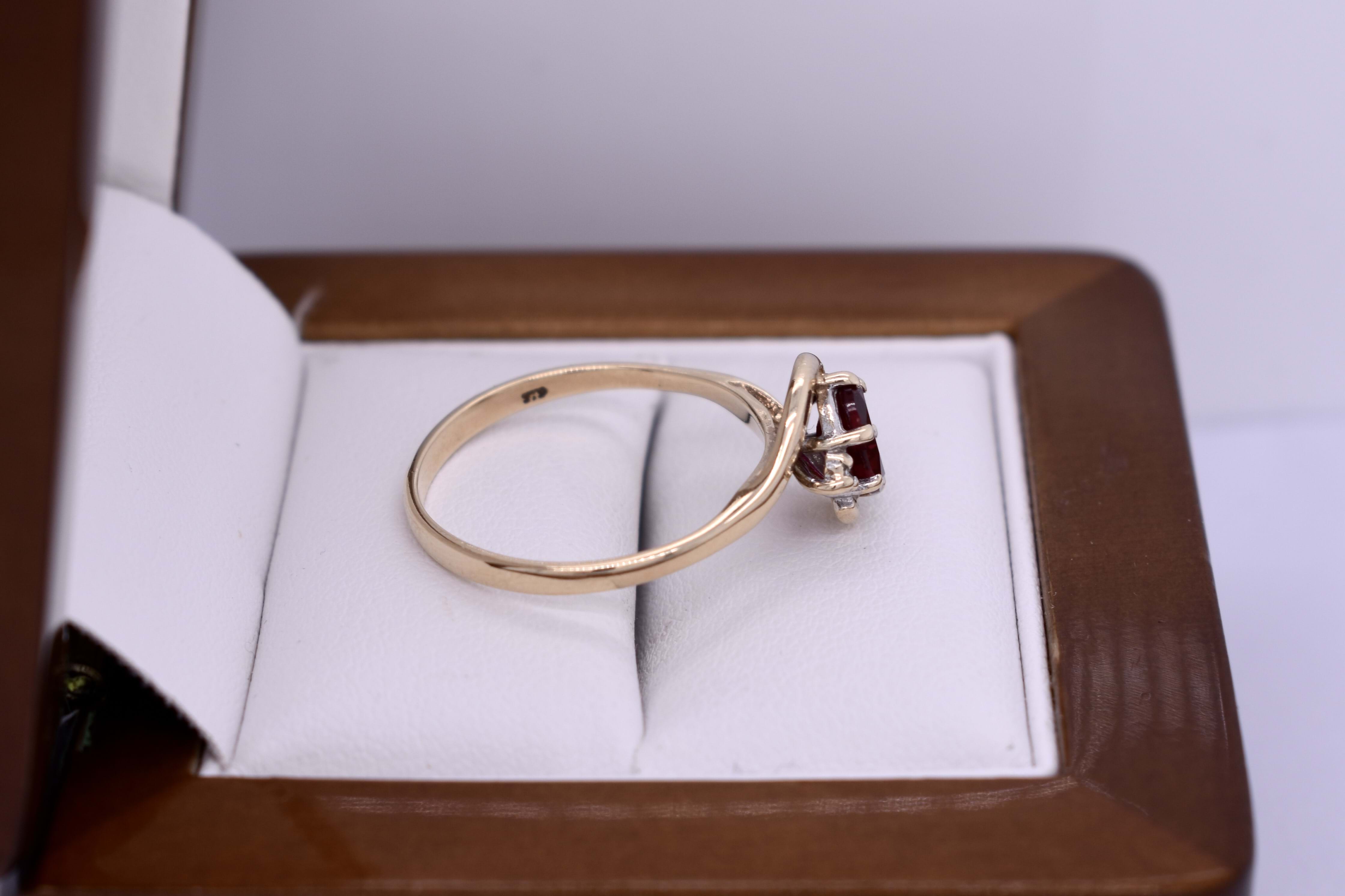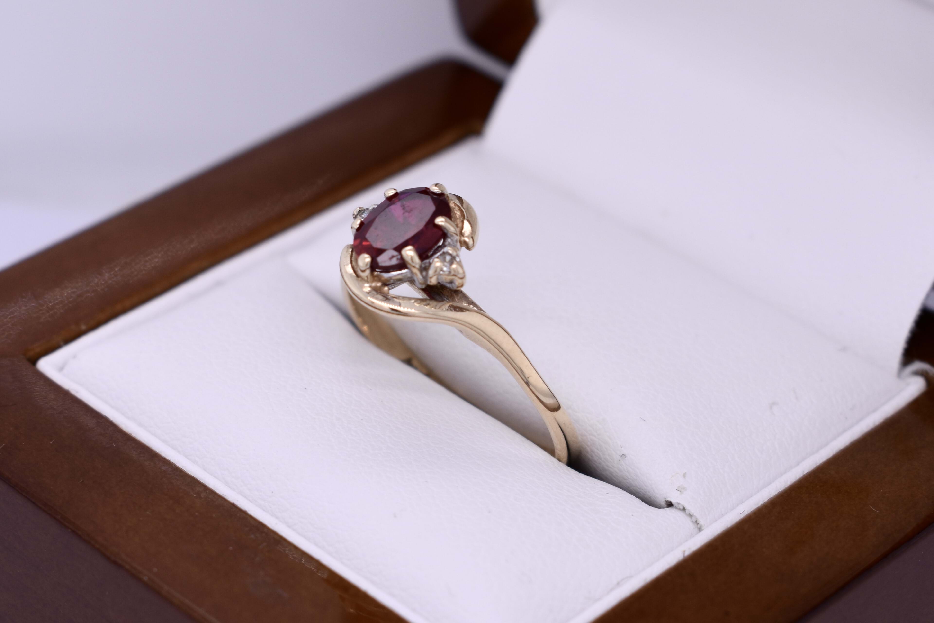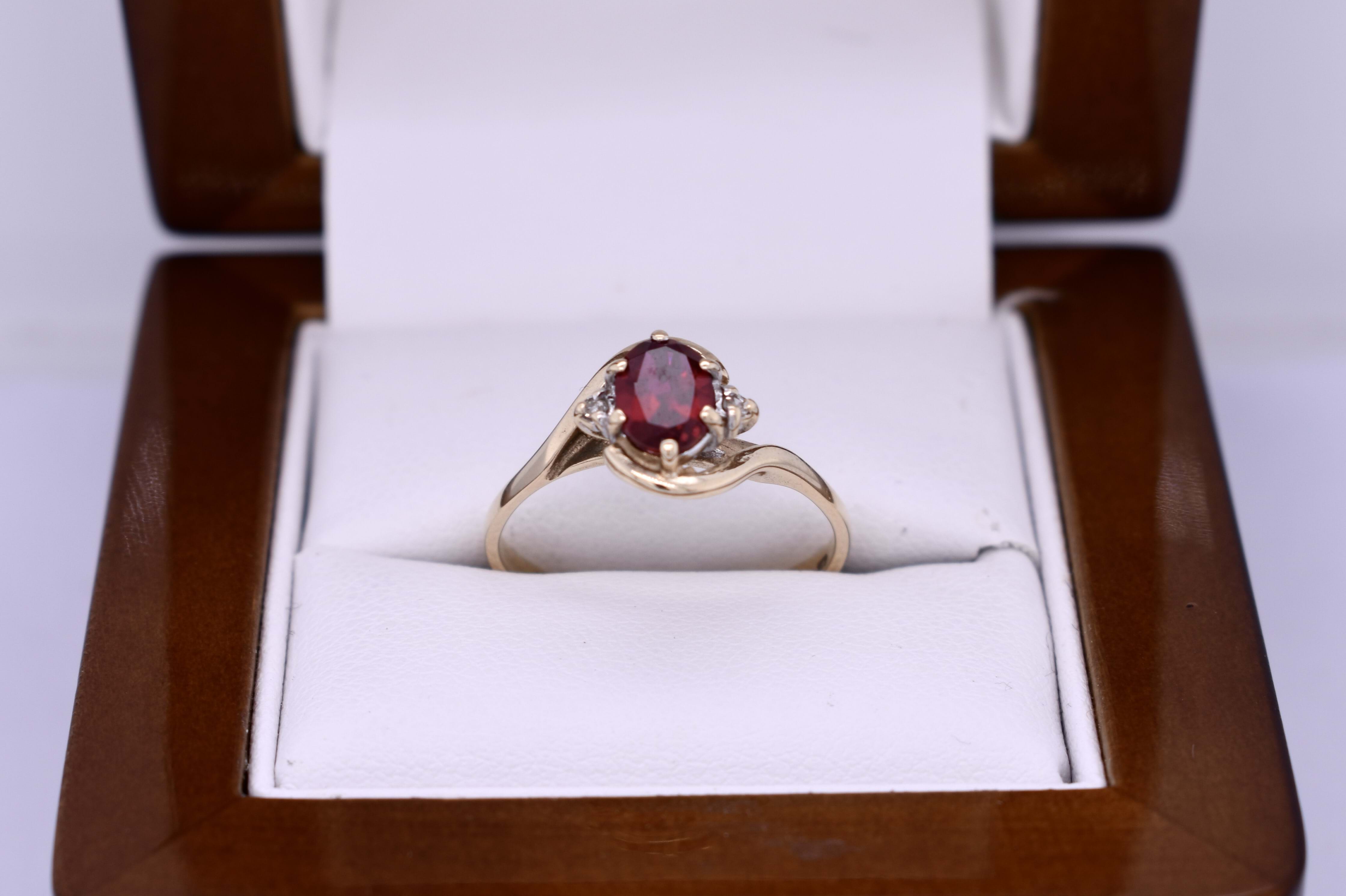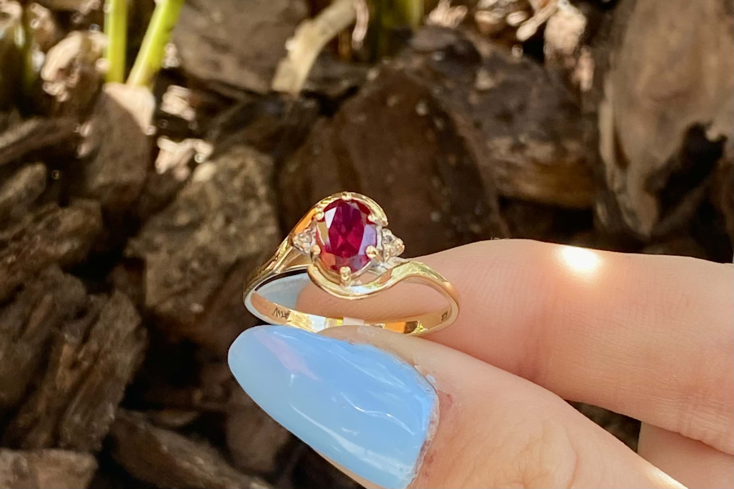 This cute vintage ring features an oval 6.6x5.0mm synthetic ruby, six claw set with two round brilliant cut diamonds in a swirl design. Completed on a plain band. Finger size P.