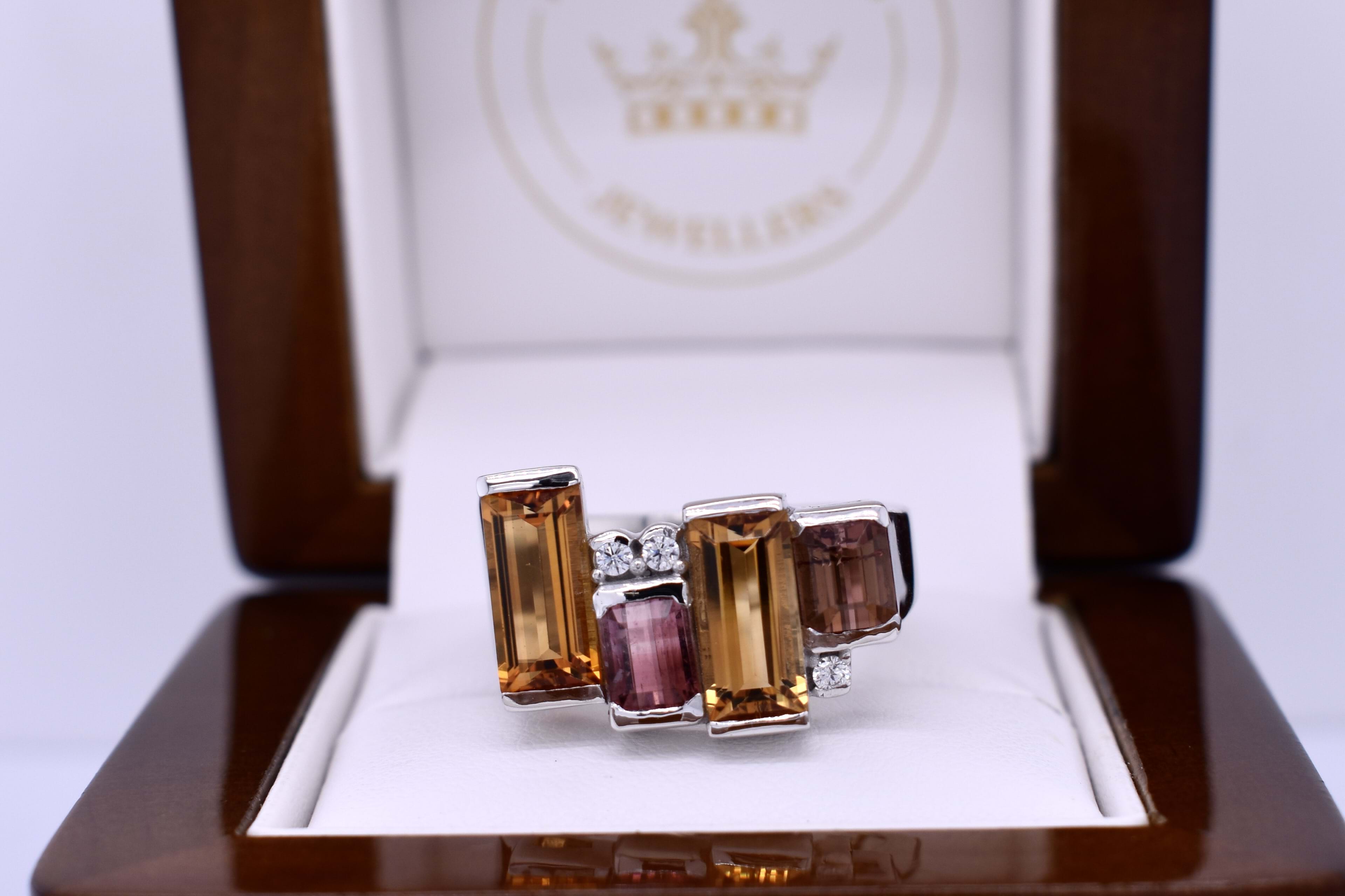 Sterling Silver Geometric Citrine, Tourmaline & CZ Ring (Q)