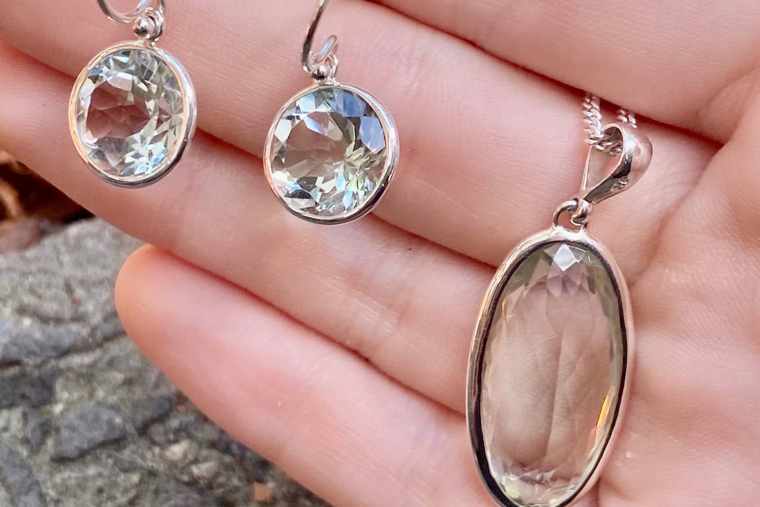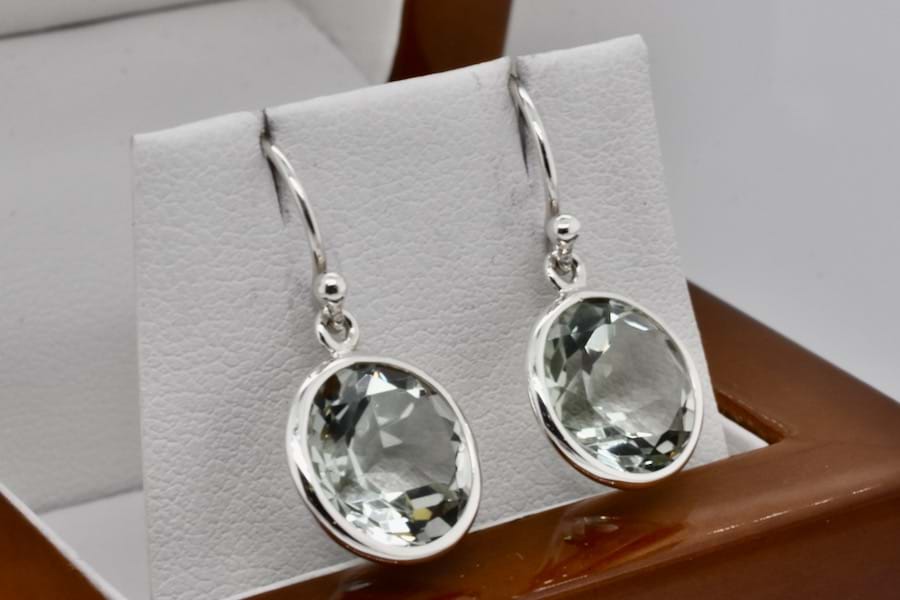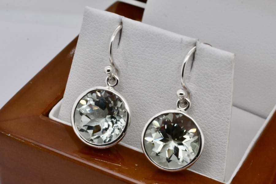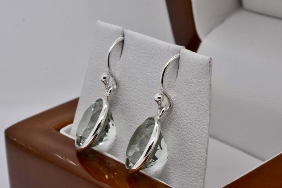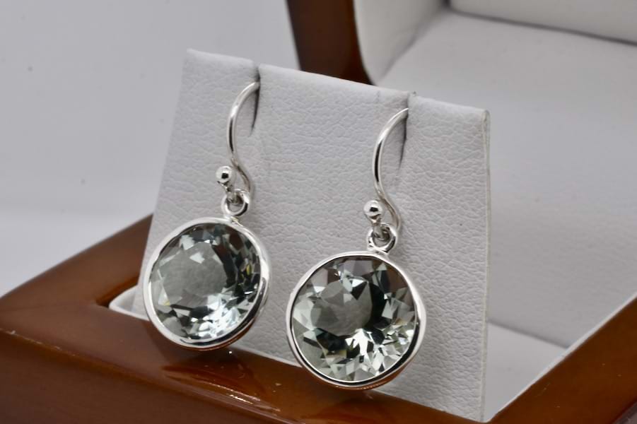 A pretty pair of handmade sterling silver earrings, set with round prasiolite measuring approx. 12mm in bezel settings with shepherd hooks