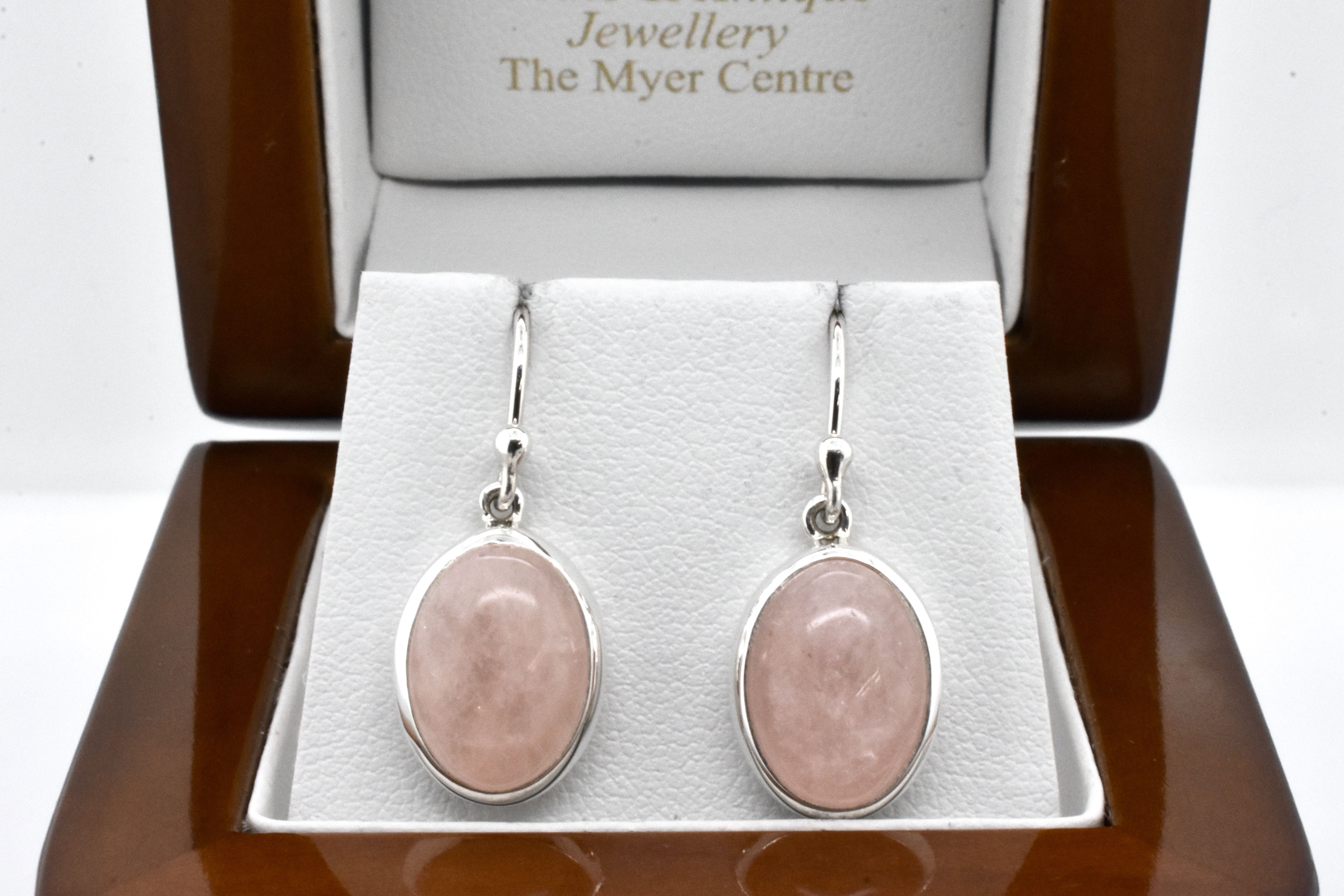 Handmade sterling silver earrings set with gorgeous pink toned cabochon morganite measuring approx. 14 x 11mm, bezel set with shepherd hooks