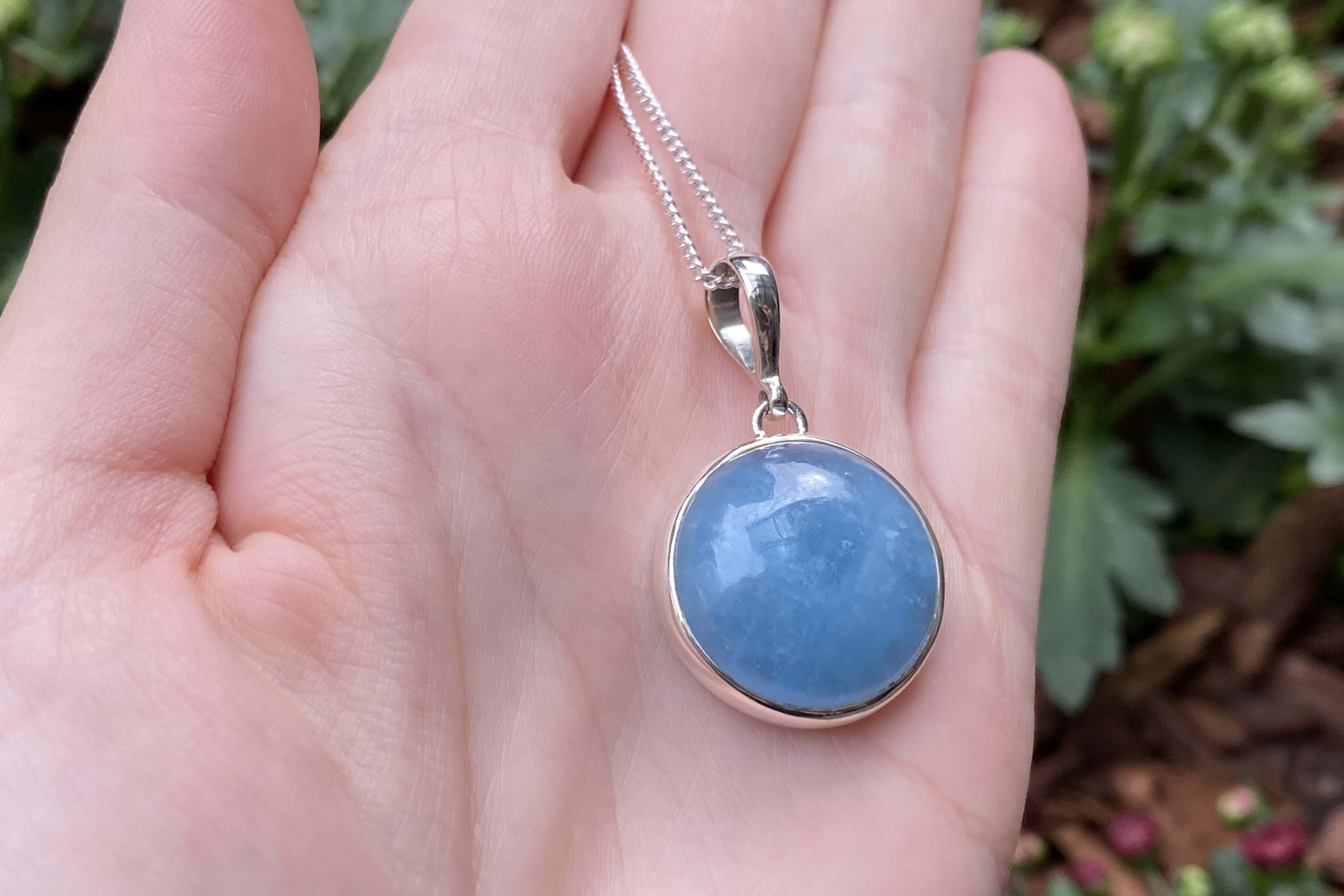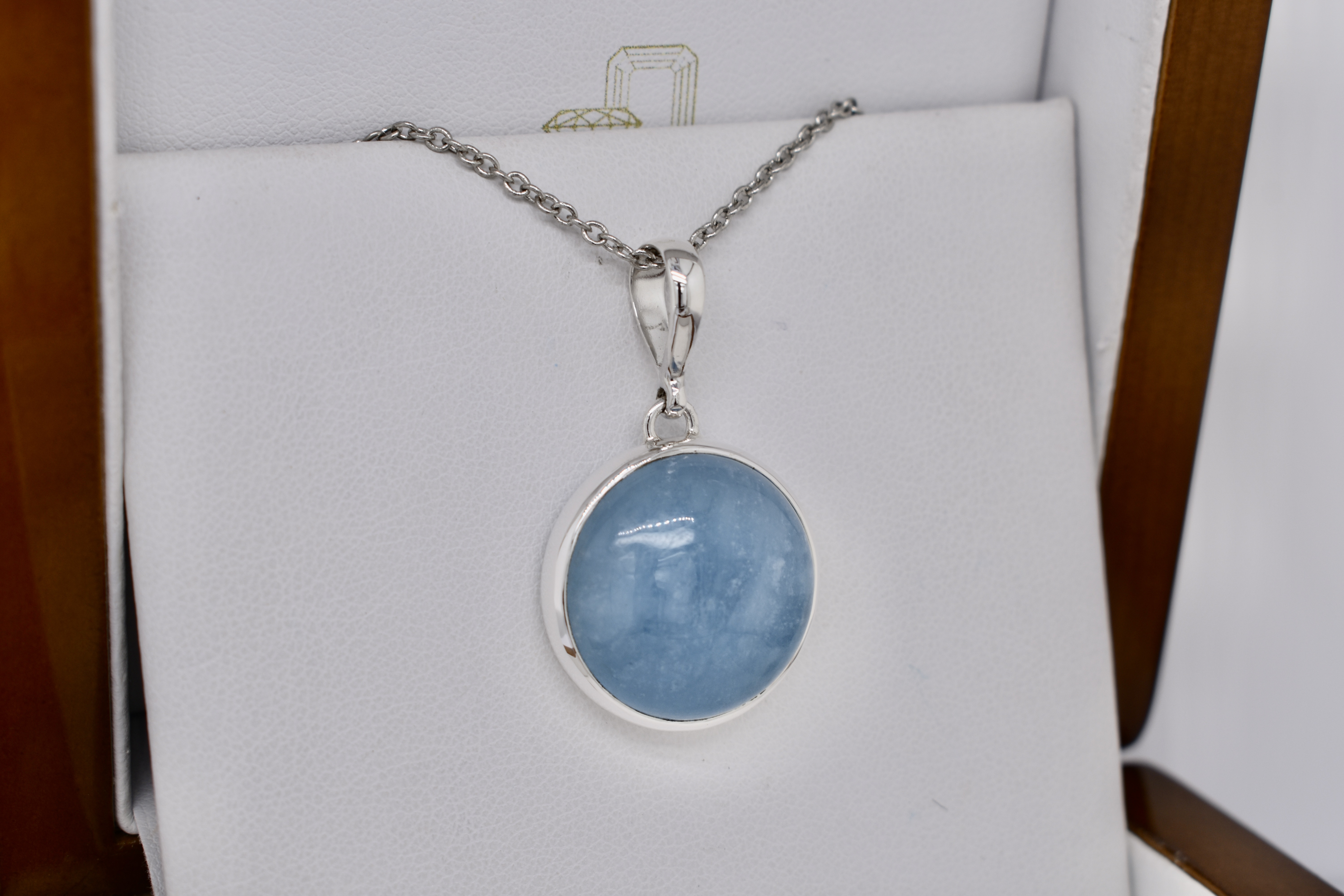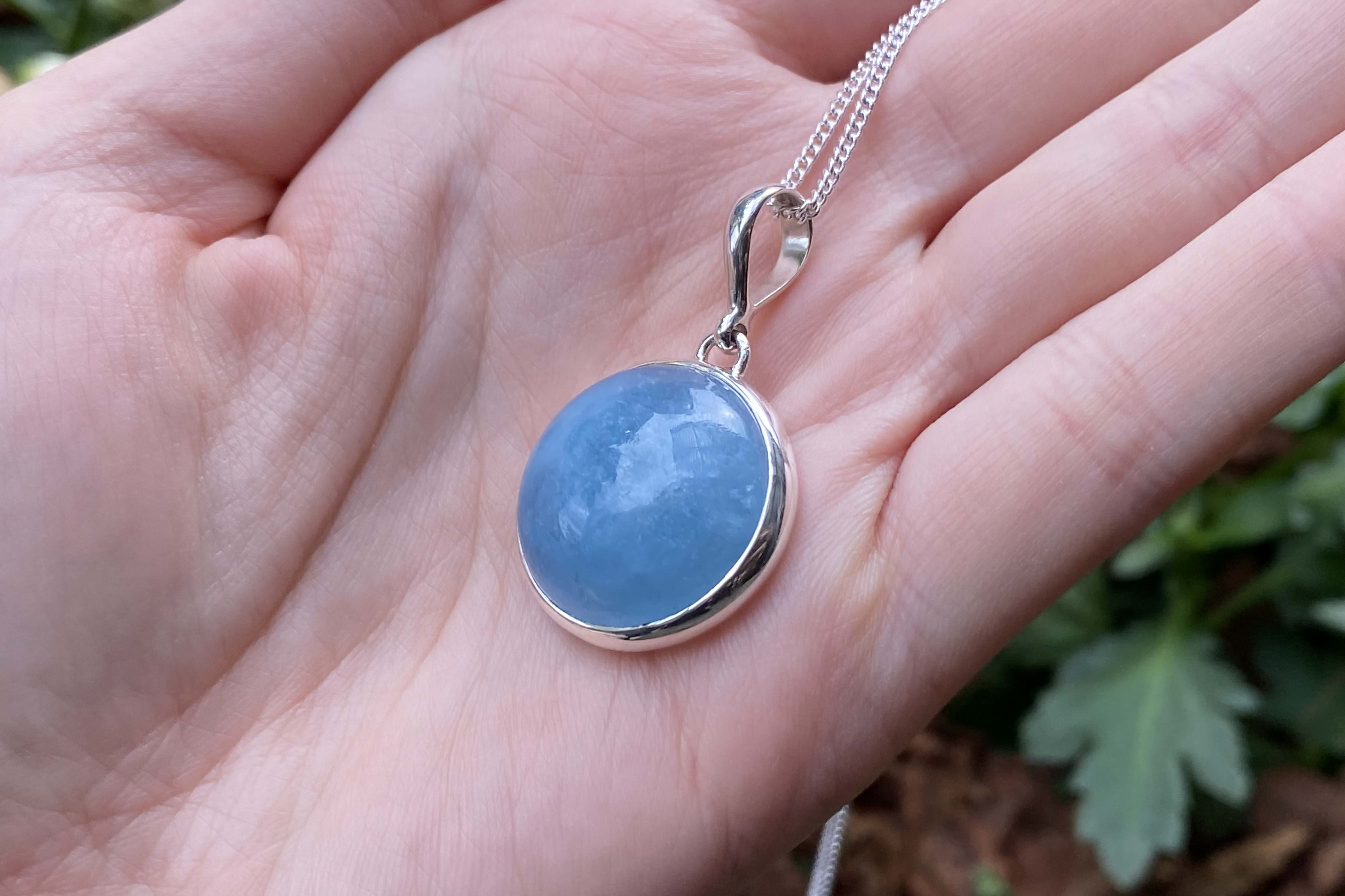A stunning round aquamarine pendant, bezel set, in sterling silver. This handmade pendant measures 21.8mm and is completed with a plain silver bale. Chains available for separate purchase.
