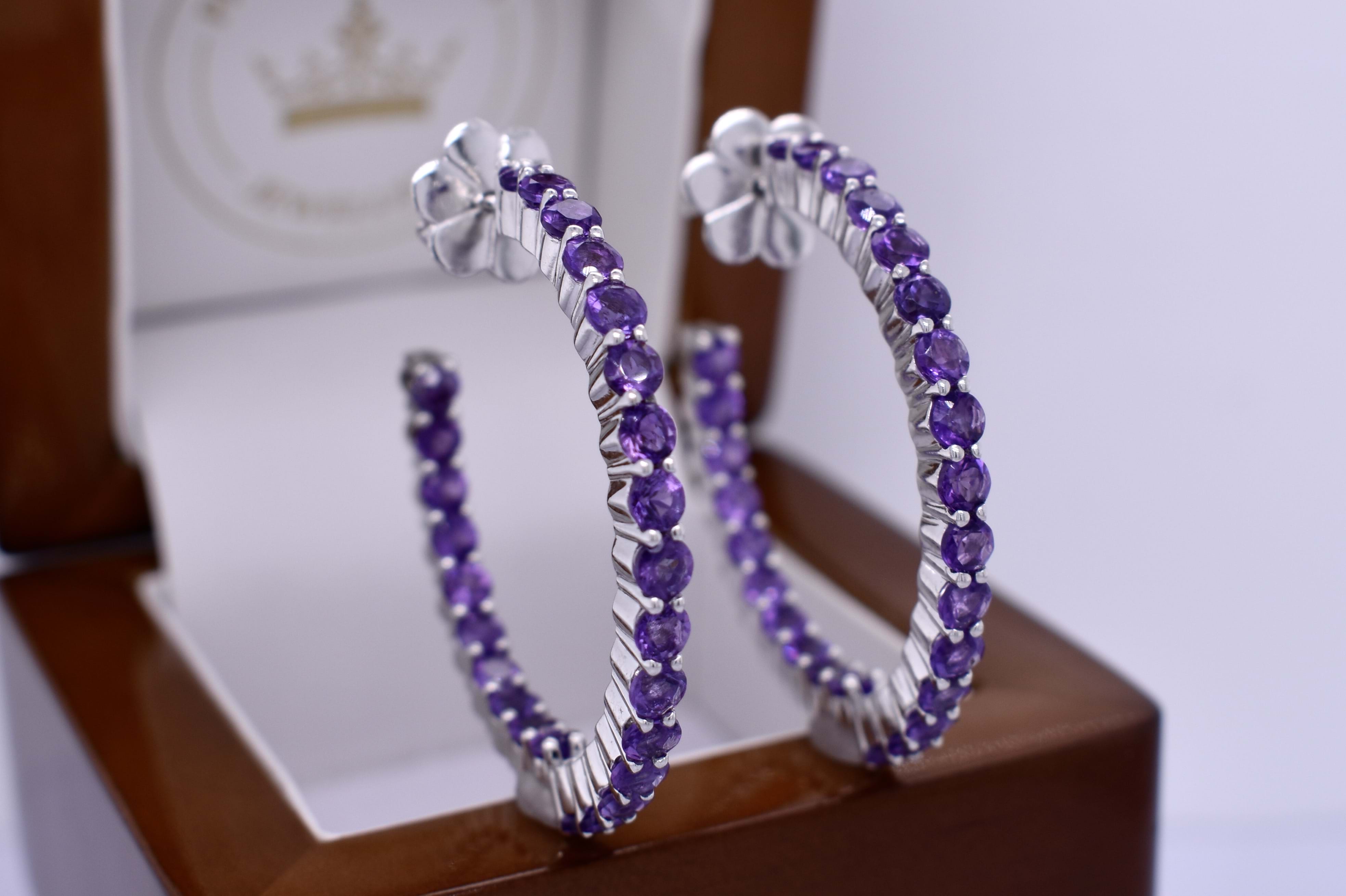 Perfect pop of purple, these amazing amethyst set hoop earrings, measure 36mm round and are shared claw set with oval 3.00mm amethysts on the front and inside. Completed with post and butterfly fittings.
