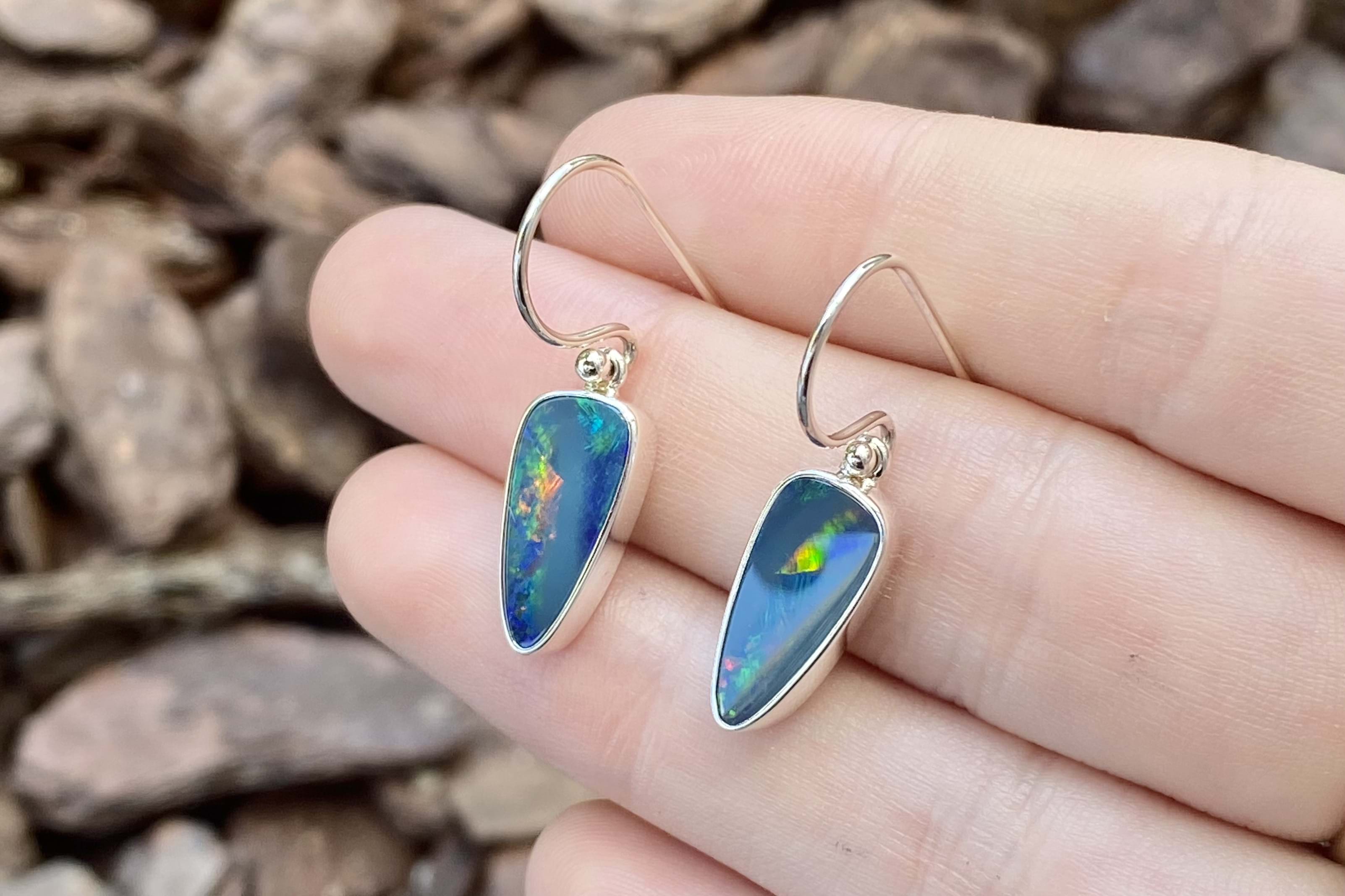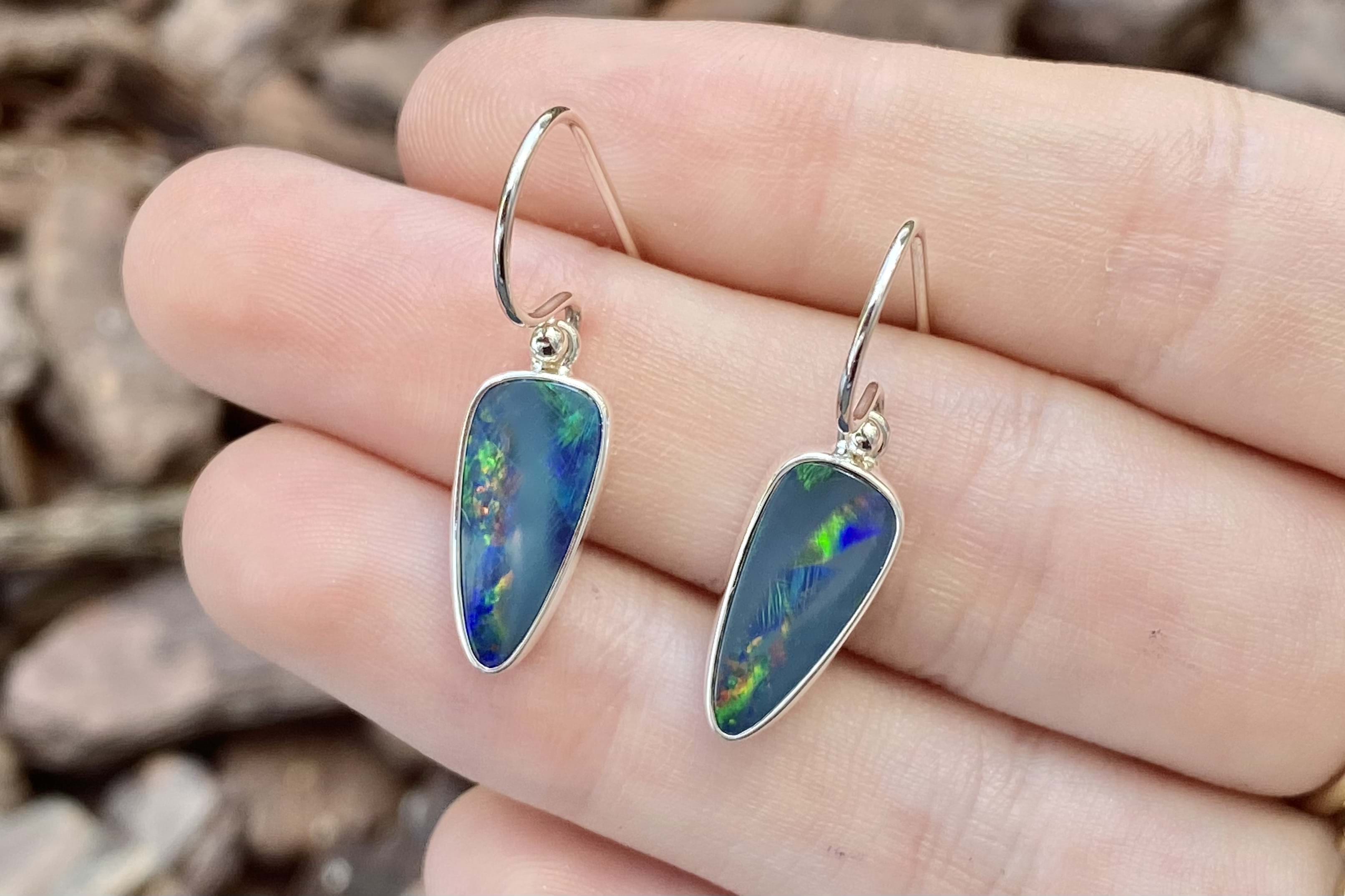 Gorgeous pair of freeform shaped drops, featuring approx. 15.3x7.5mm Coober Pedy opal doublets. The doublet consisting of Coober Pedy crystal opal (on top) with a boulder opal backing. These opals are dark with pretty flashes of red, orange and green throughout. They are bezel set in sterling silver with shepherd hook fittings.
