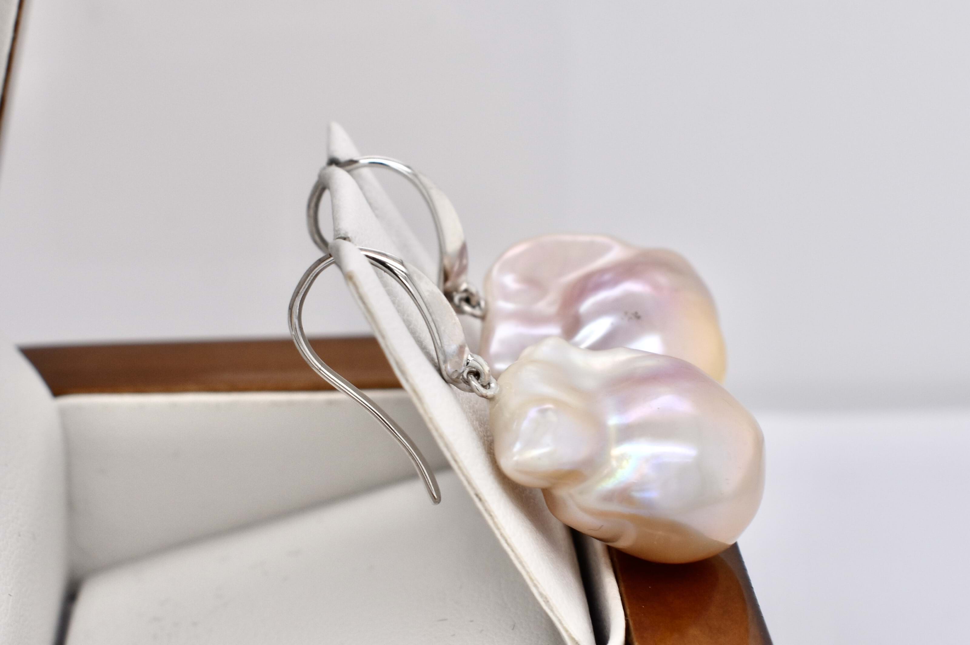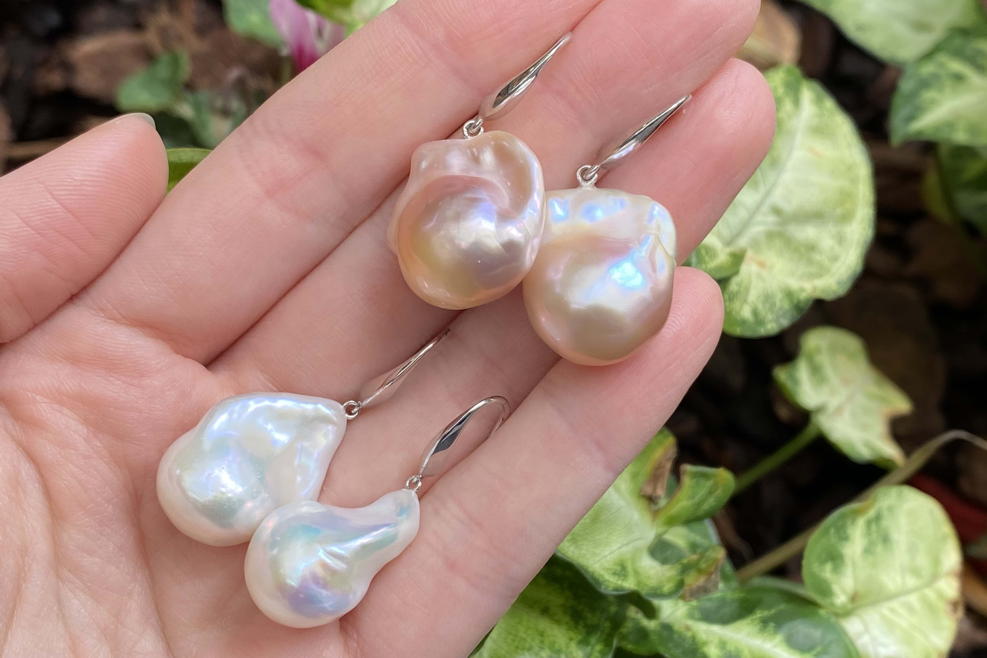 Pretty and pink, these lovely baroque freshwater pink pearl drops, measuring 14-15mm, are set in sterling silver with a shepherd hook fittings.