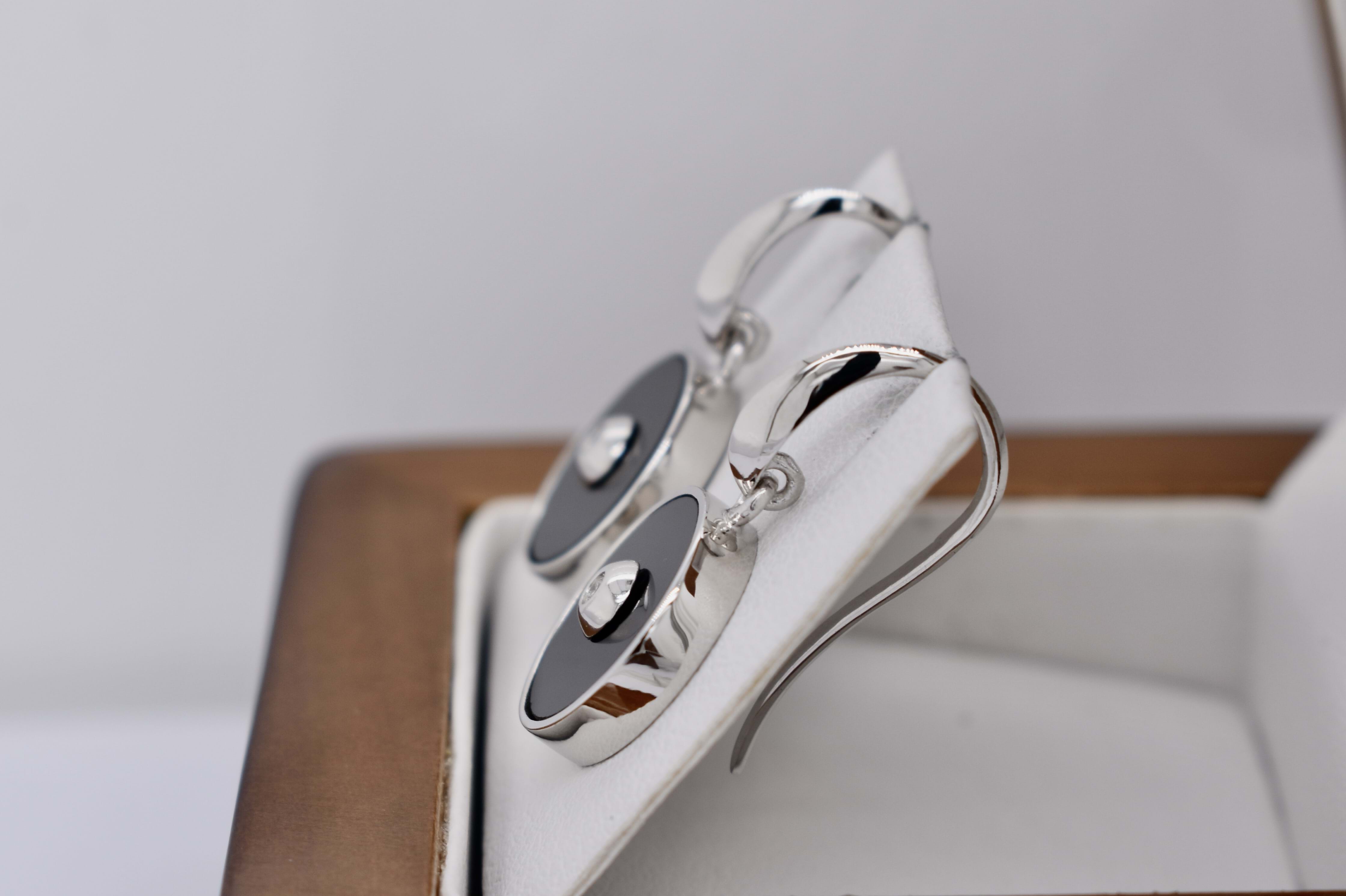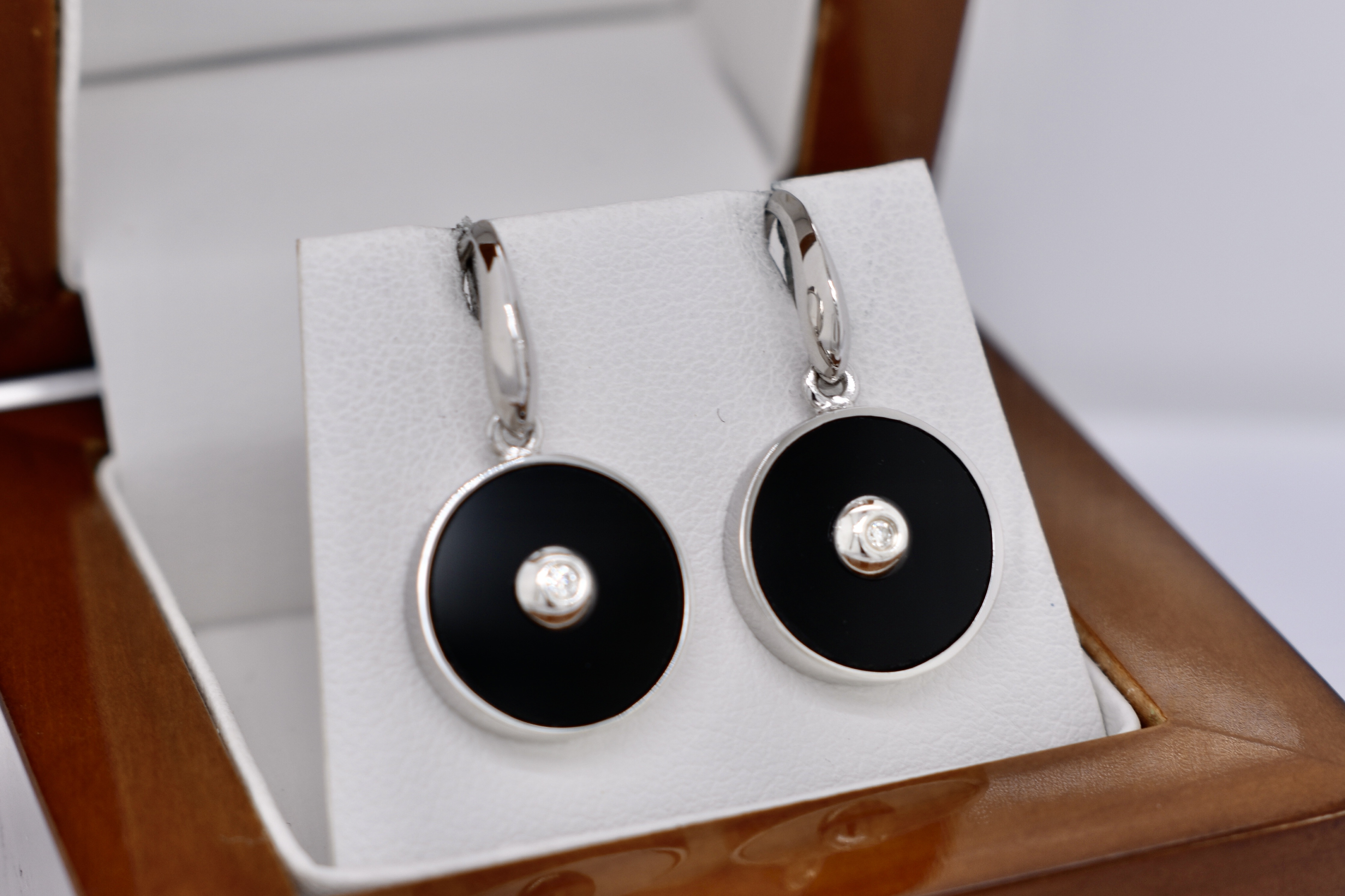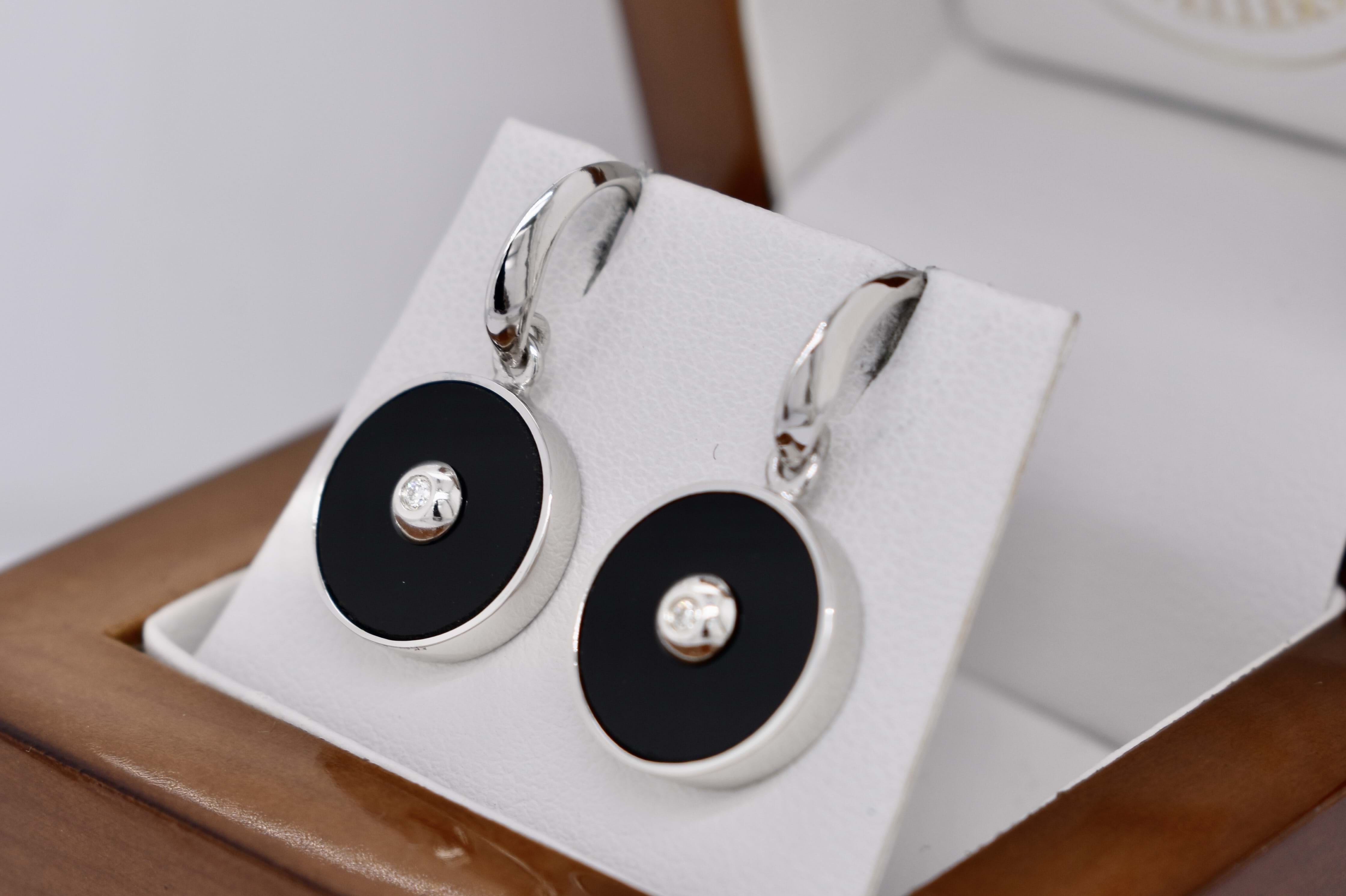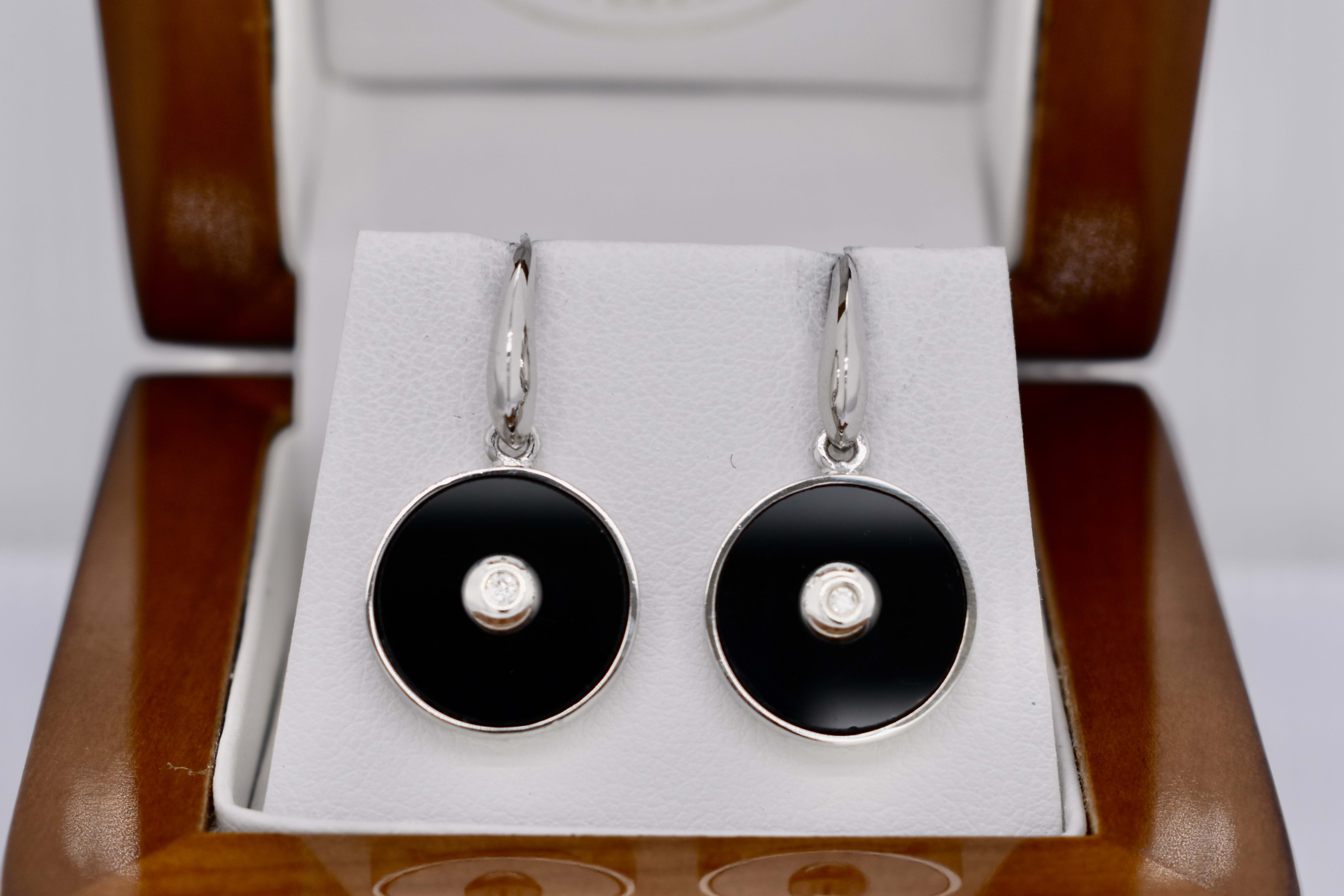 A simple and pretty pair of sterling silver drop earrings with a circular panel of onyx, bezel set, and a small round diamond bezel set in the centre. Measuring 13mm round with shepherd hook fittings.