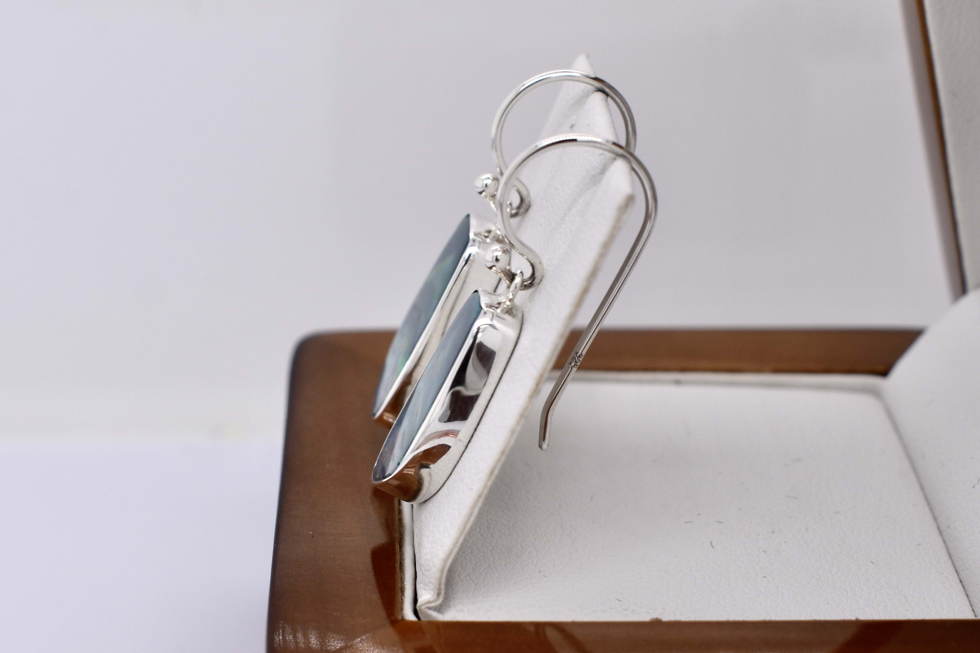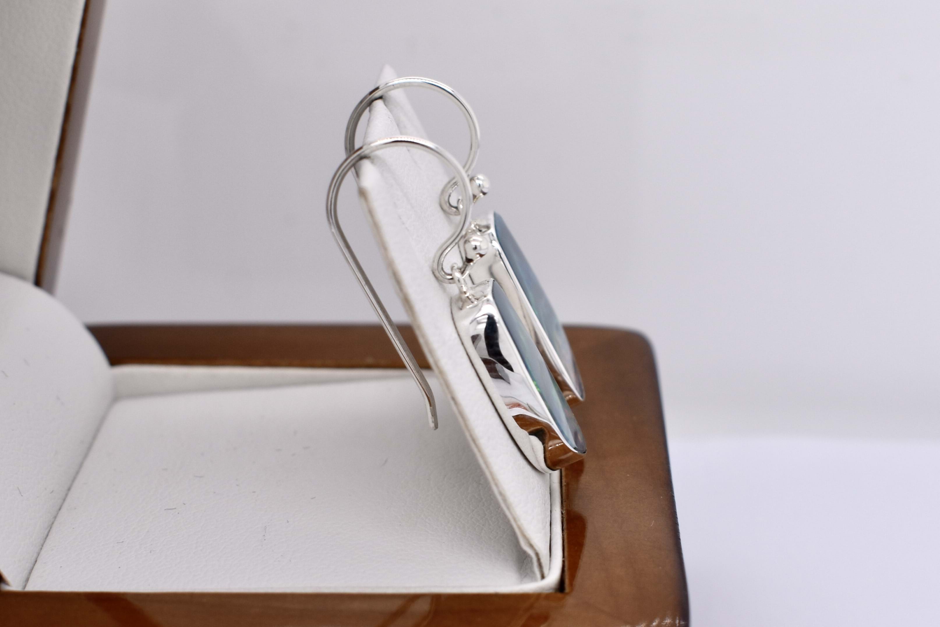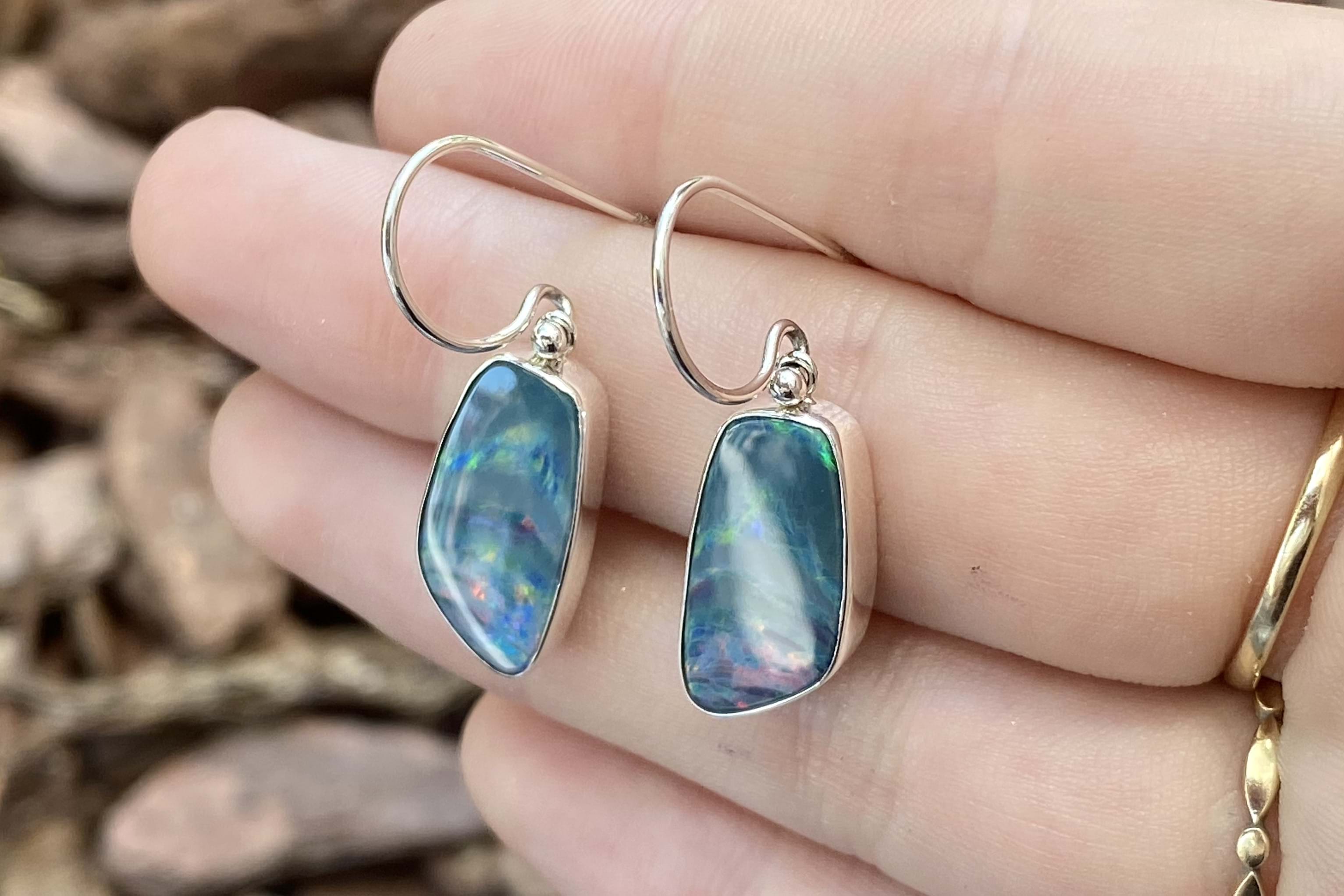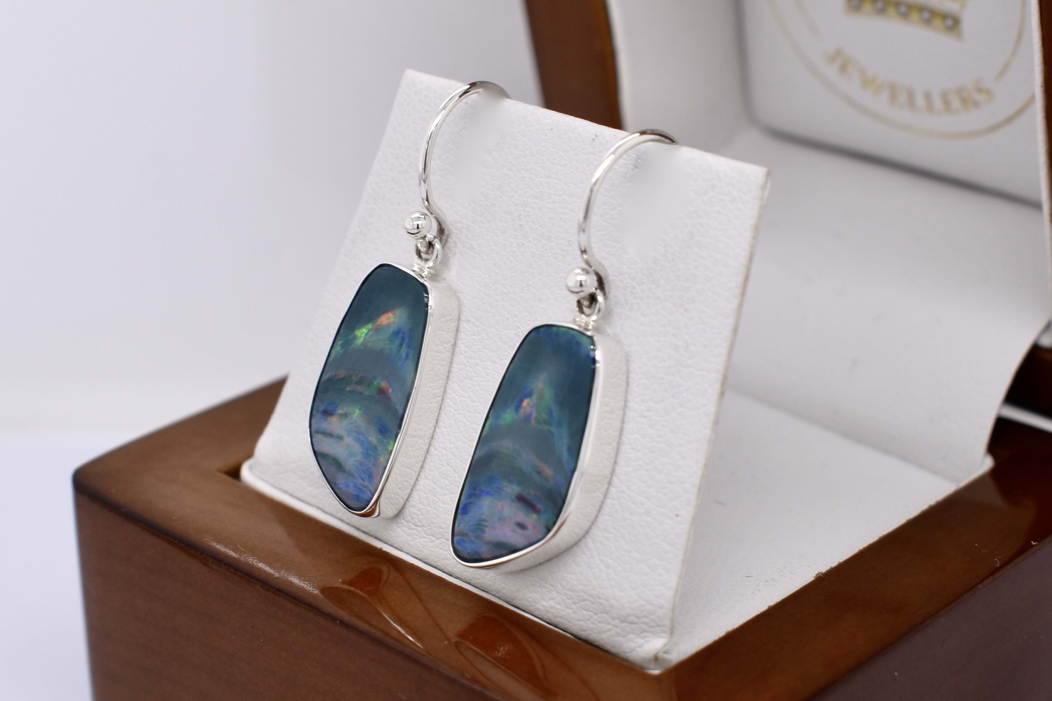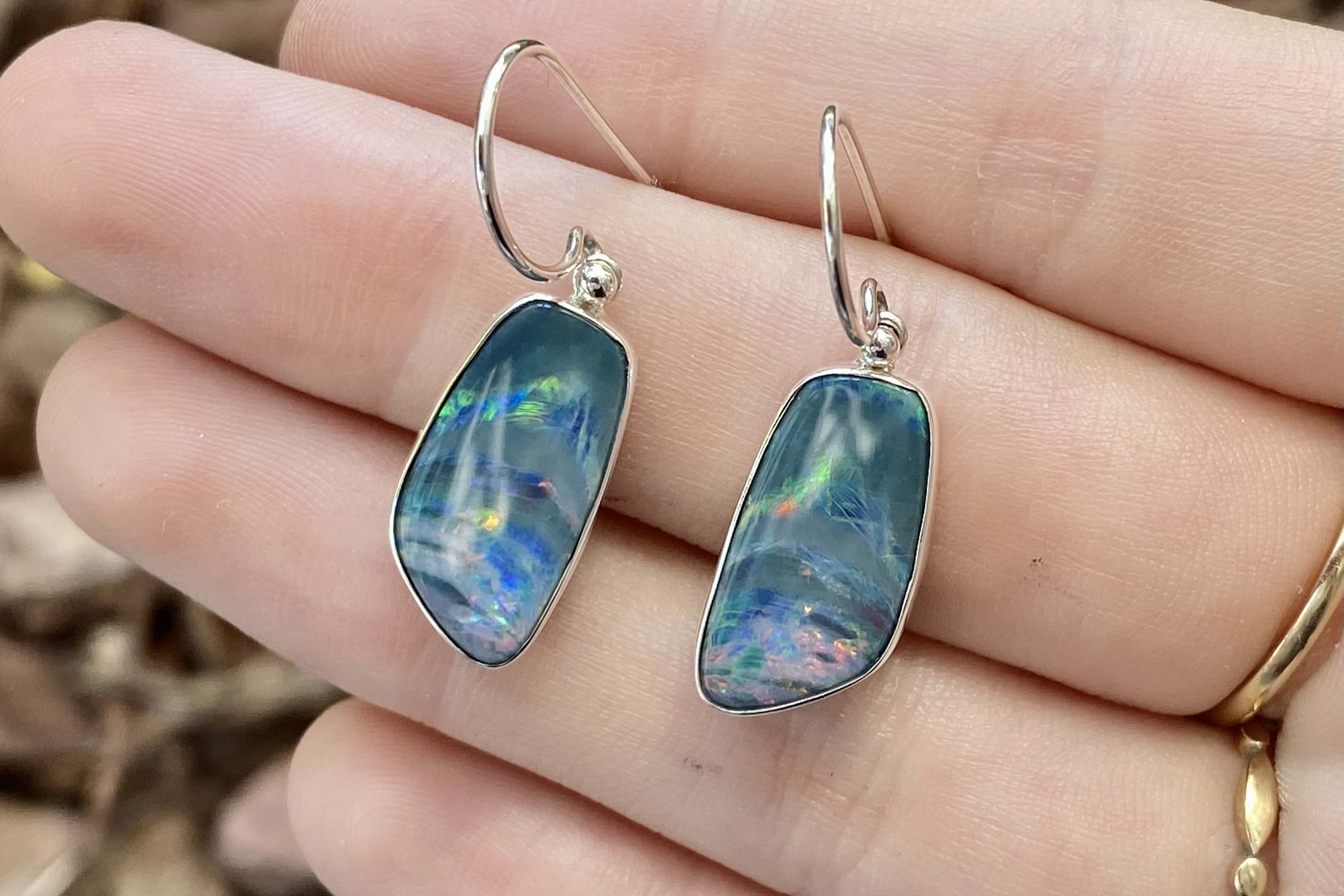 Eye-catching pair of freeform drops, featuring approx. 17.9x9.5mm Coober Pedy opal doublets. The doublet consisting of Coober Pedy crystal opal (on top) with a boulder opal backing. These opals are dark with pretty flashes of green, yellow and orange throughout. They are bezel set in sterling silver with shepherd hook fittings.