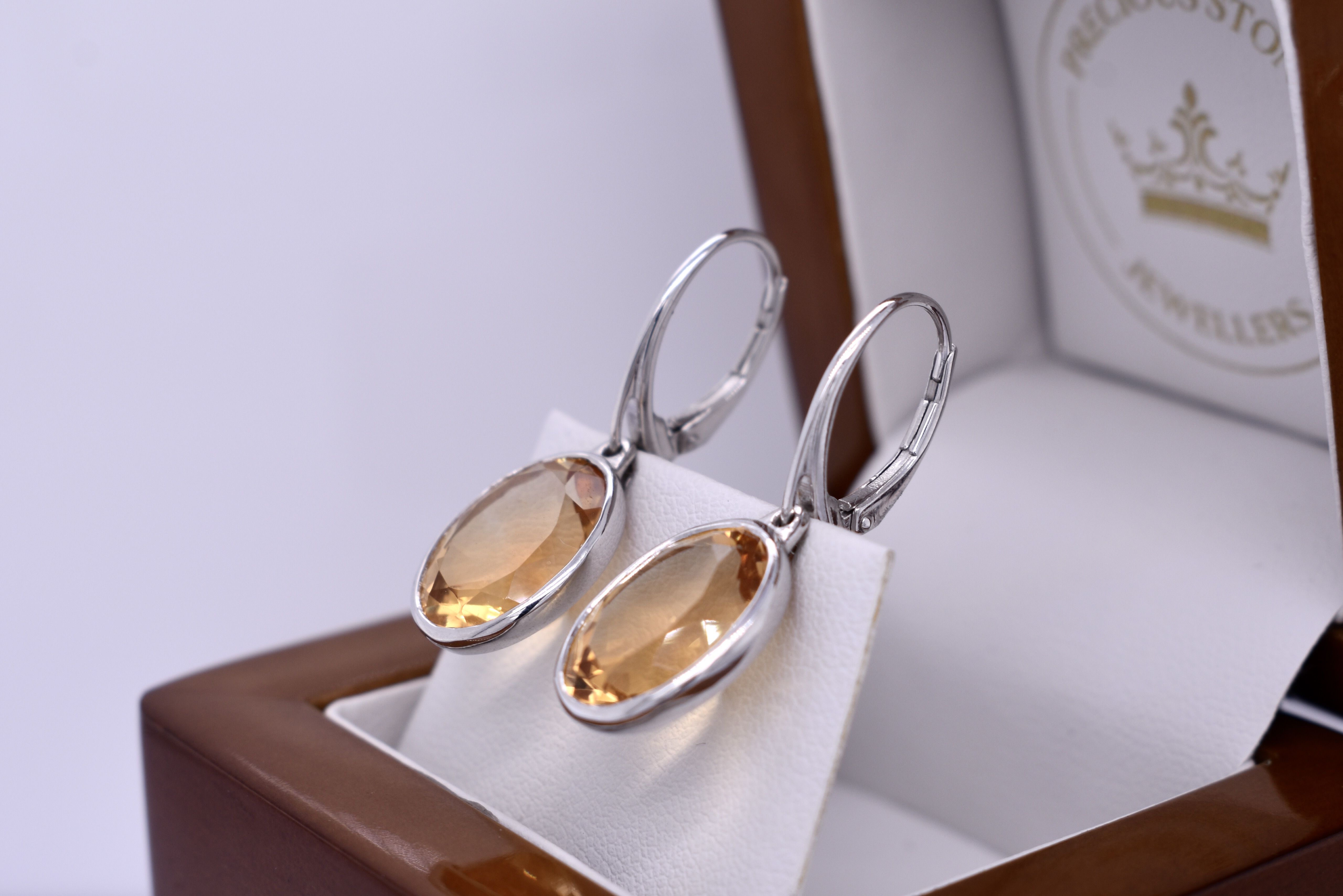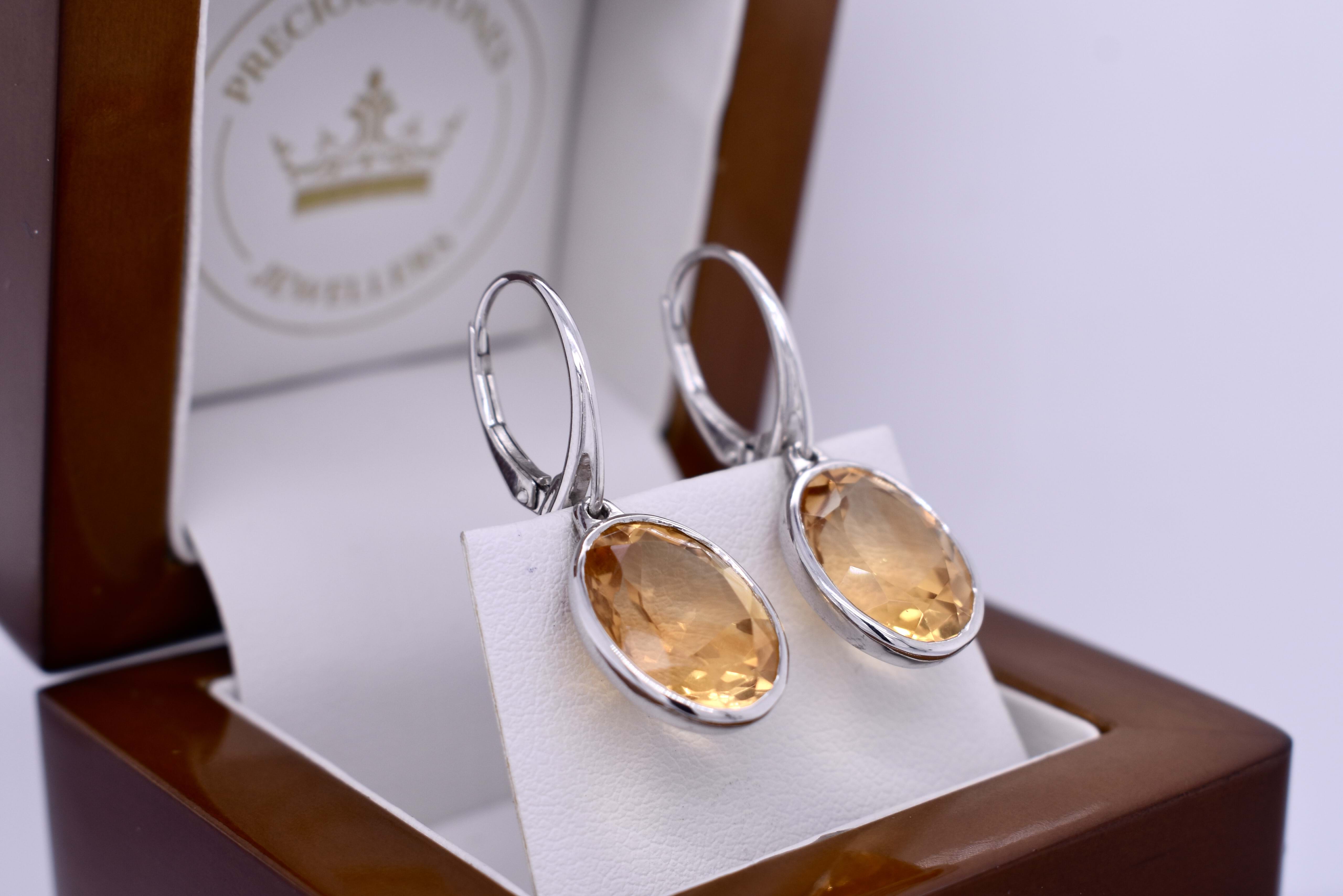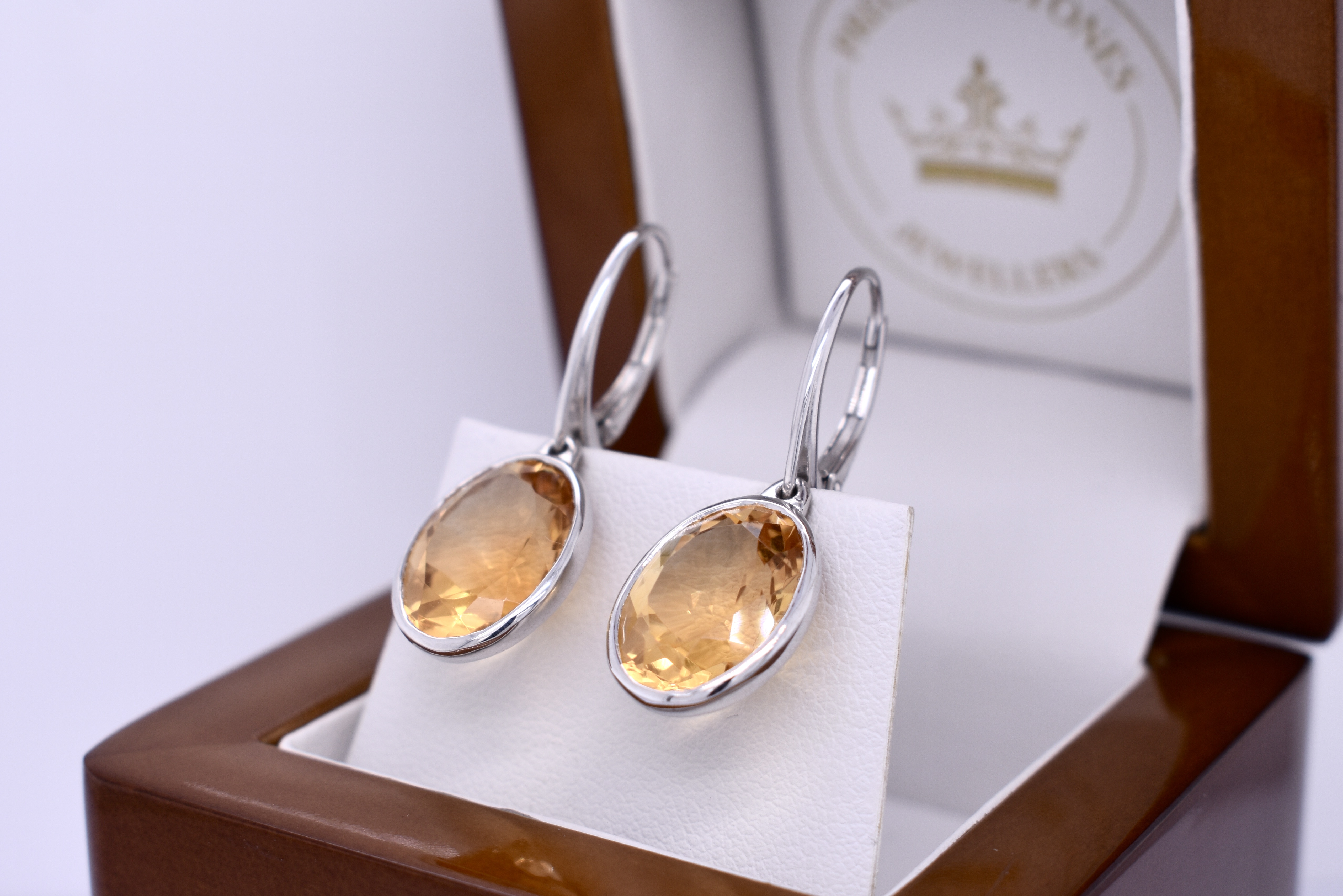 Crafted in sterling silver, these pretty oval shaped citrine drops, are floating bezel set. Finished with secure euroclip fittings. Measuring 15.7x11.5mm.