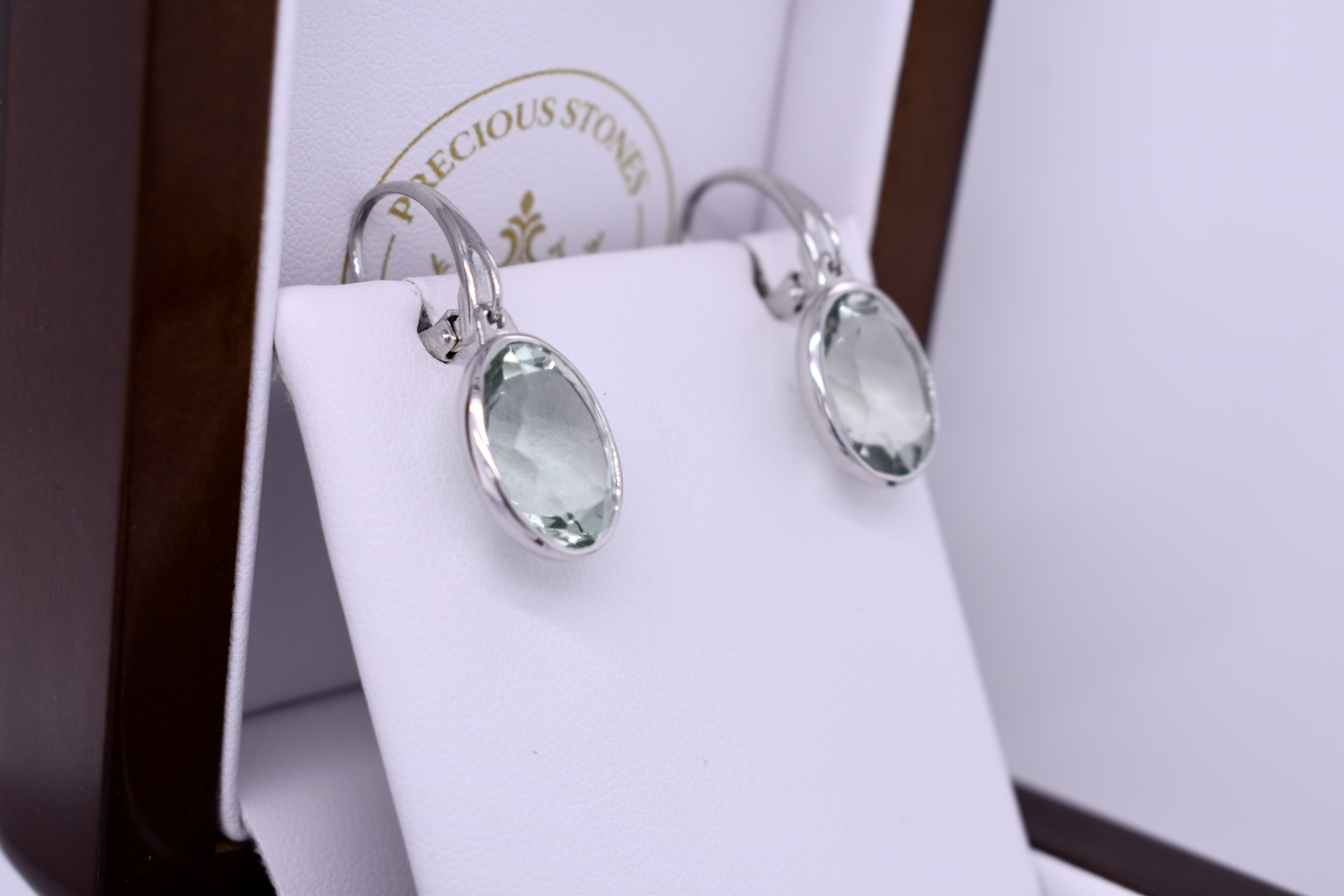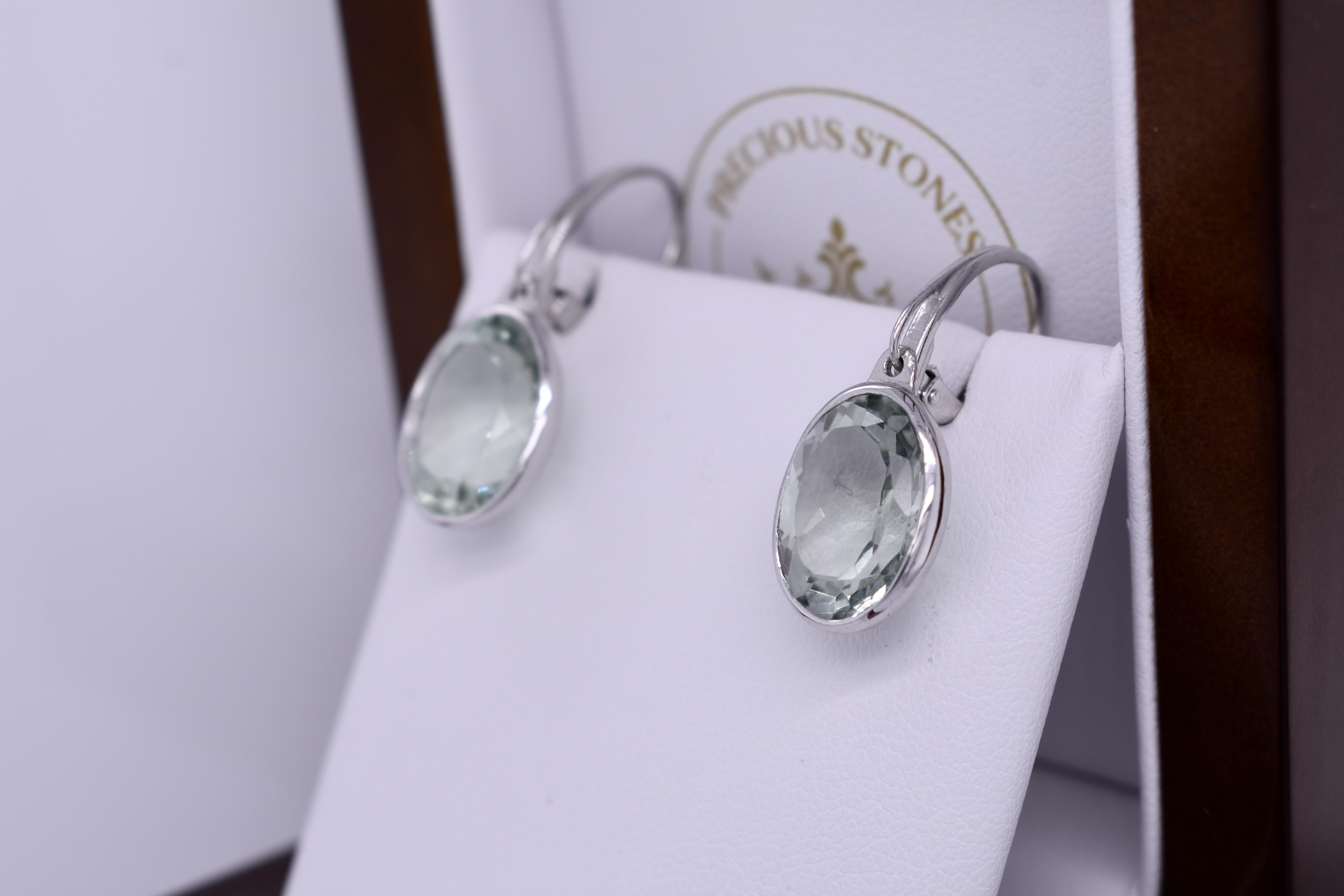 Crafted in sterling silver, these stunning oval shaped prasiolite drops, are floating bezel set. Finished with secure euroclip fittings. Measuring 15.4x11.5mm.