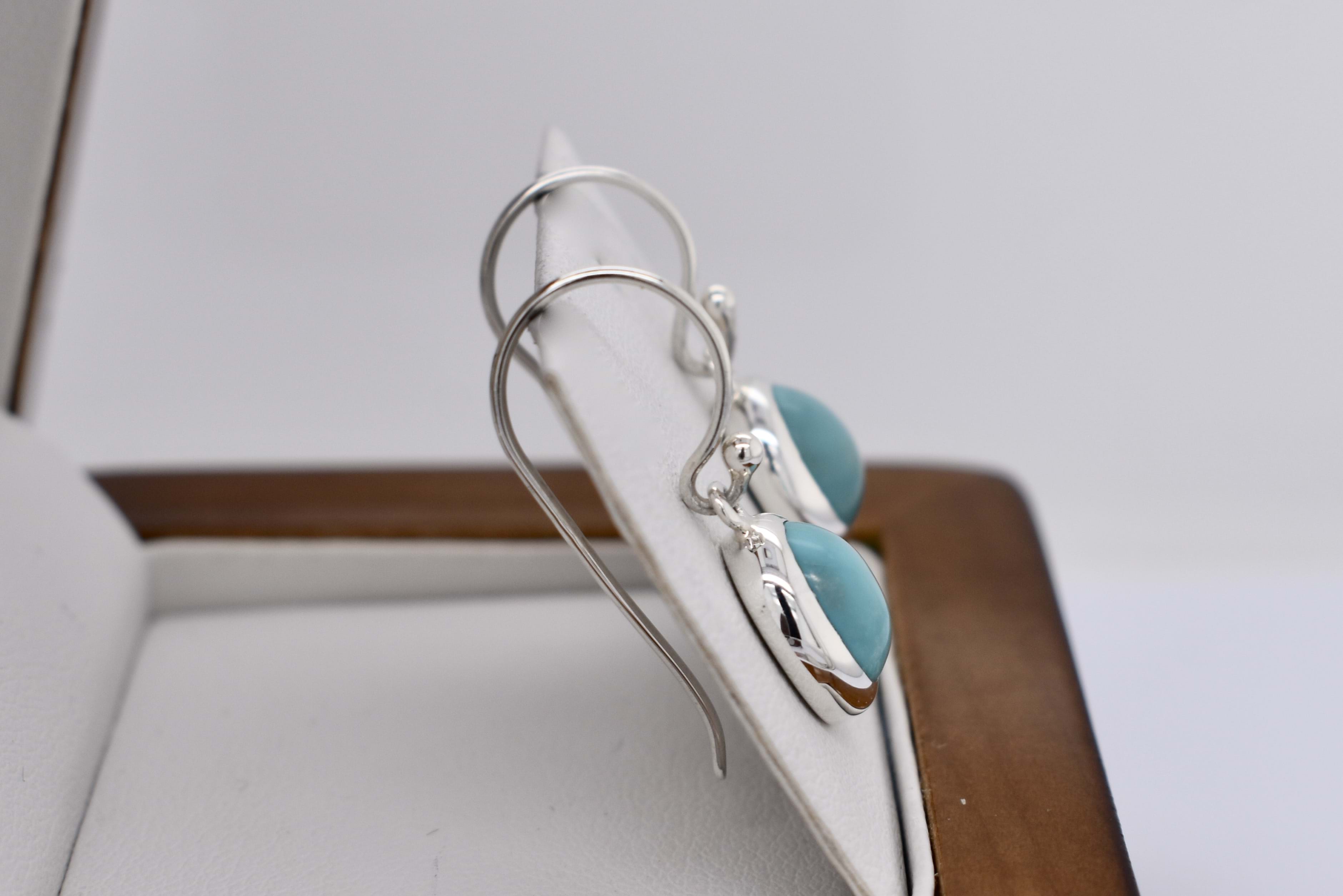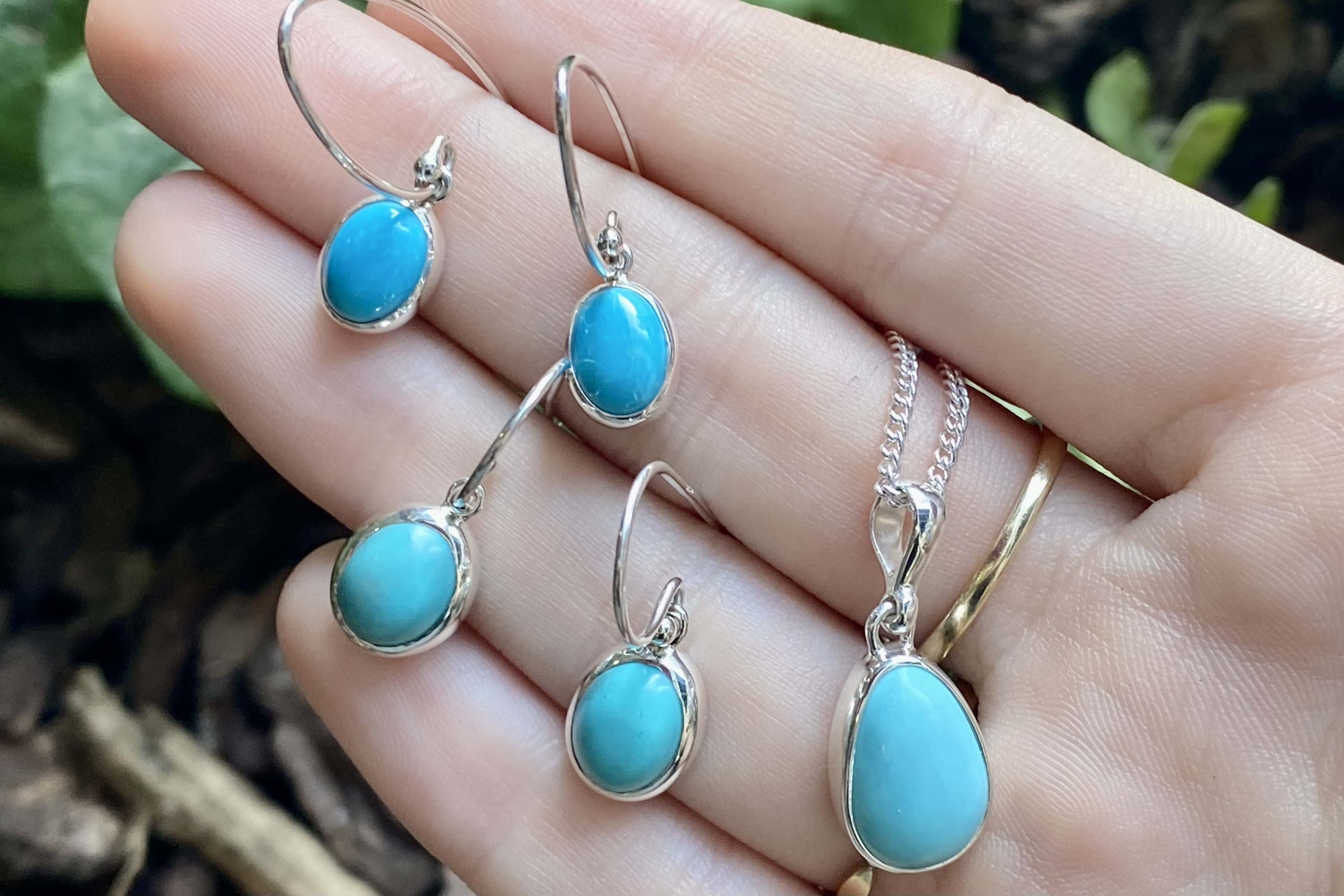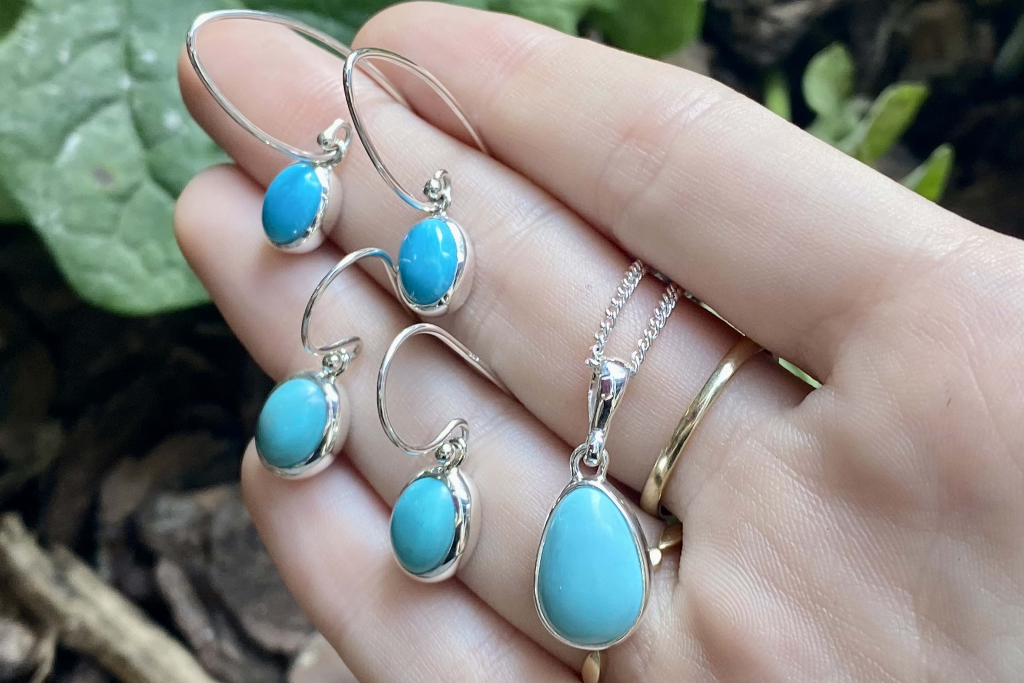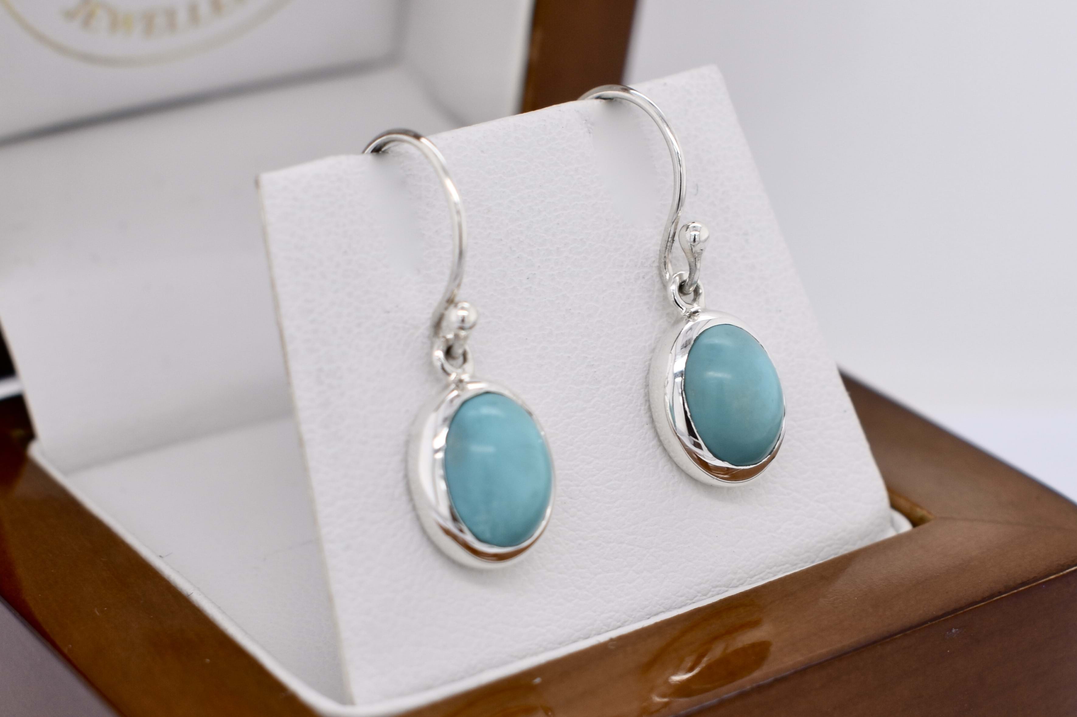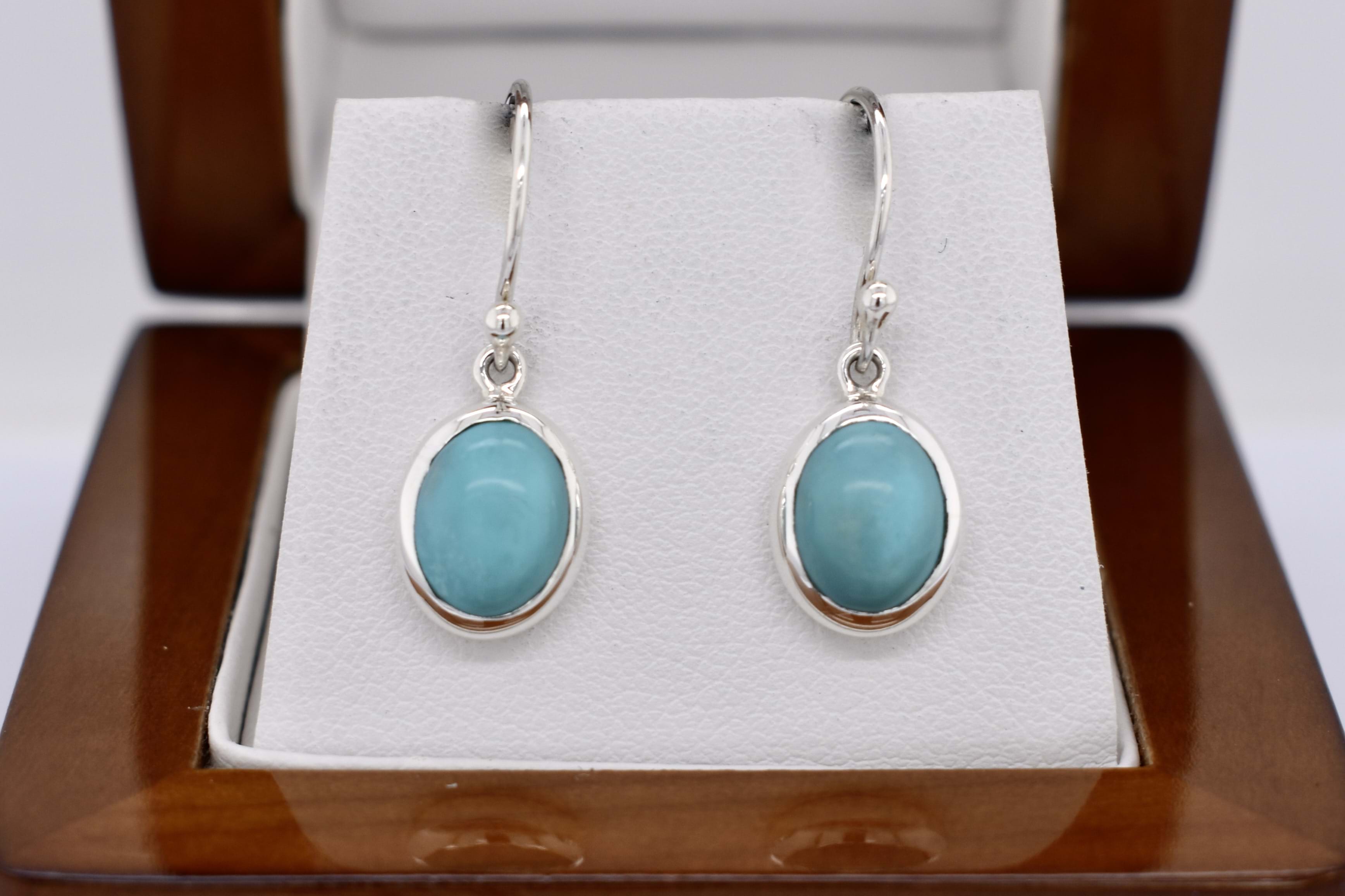 Bright and blue, this pair of oval shaped drops, featuring two Arizona turquoise stones measuring 8.7x6.9mm, bezel set in sterling silver with shepherd hook fittings. Photographed in natural light with other pieces available for seperate purchase.