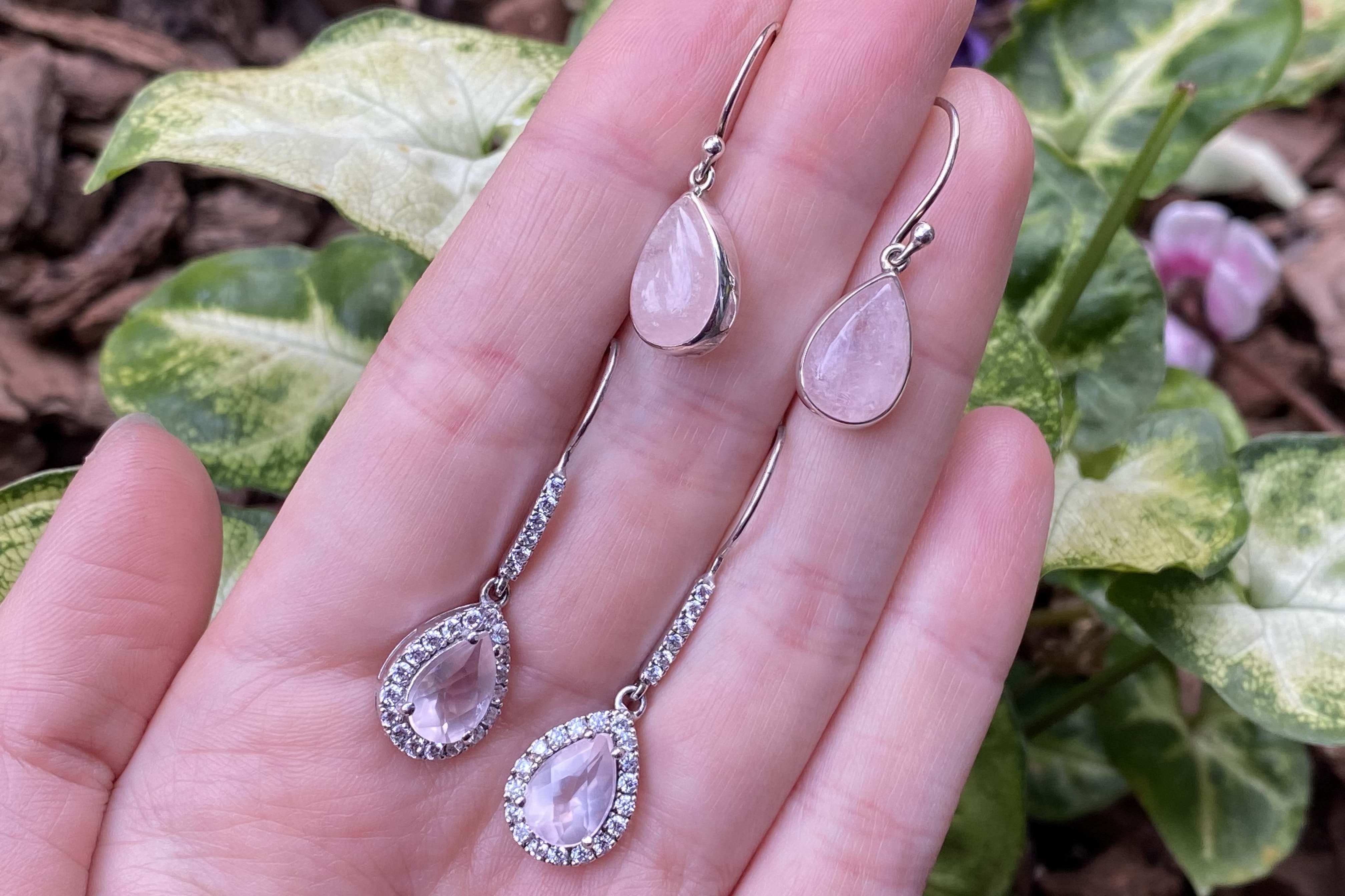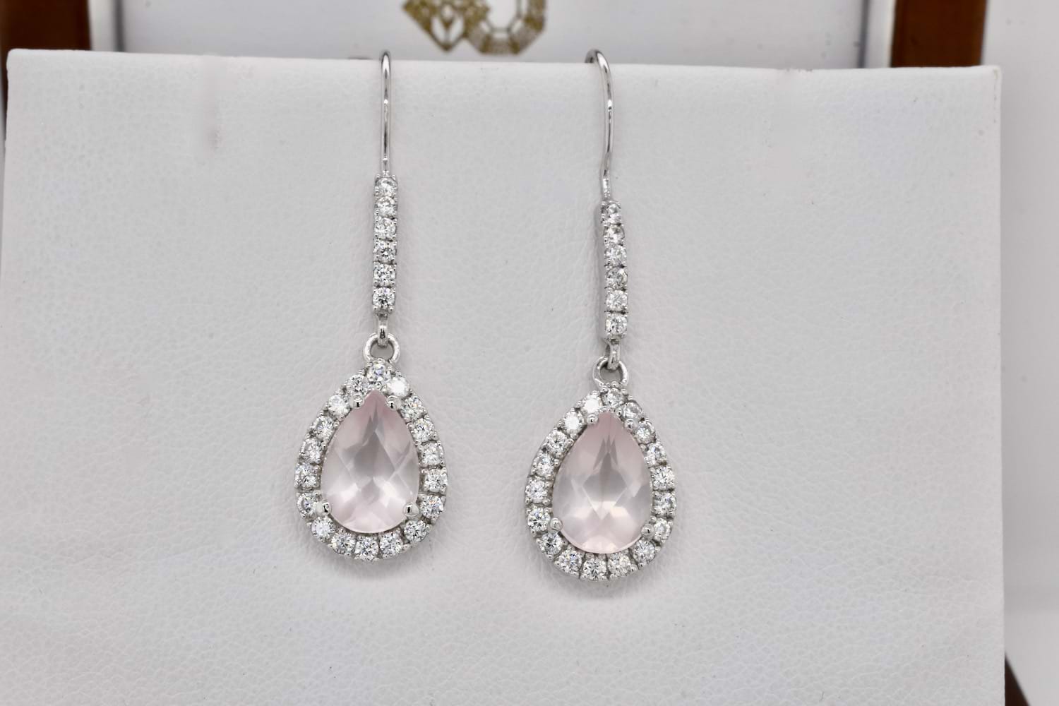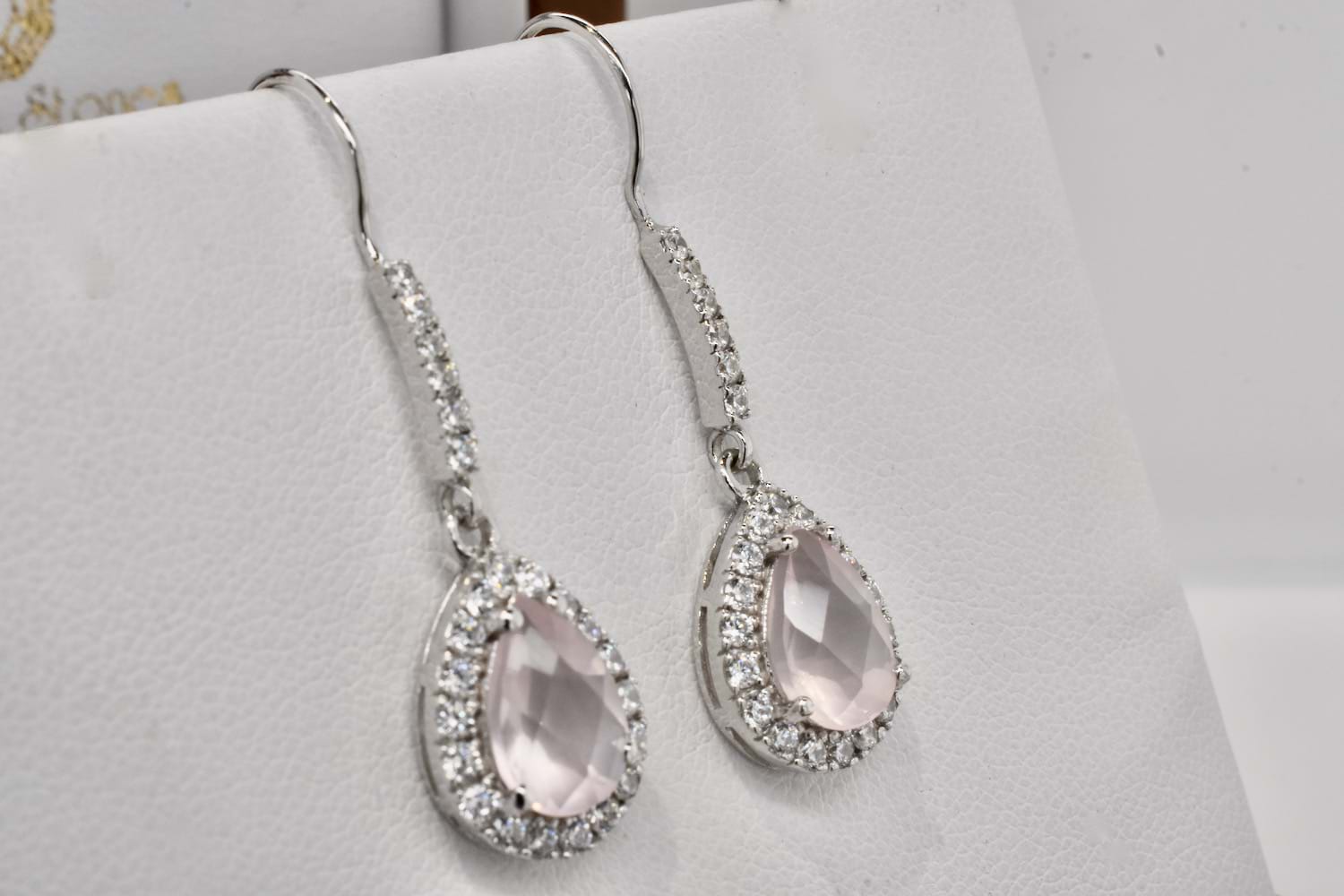 Sterling silver drop earrings featuring 10x7mm faceted pearshape rose quartz surrounded by a shimmering halo of cubic zirconia's and CZ set shepherd hook fittings