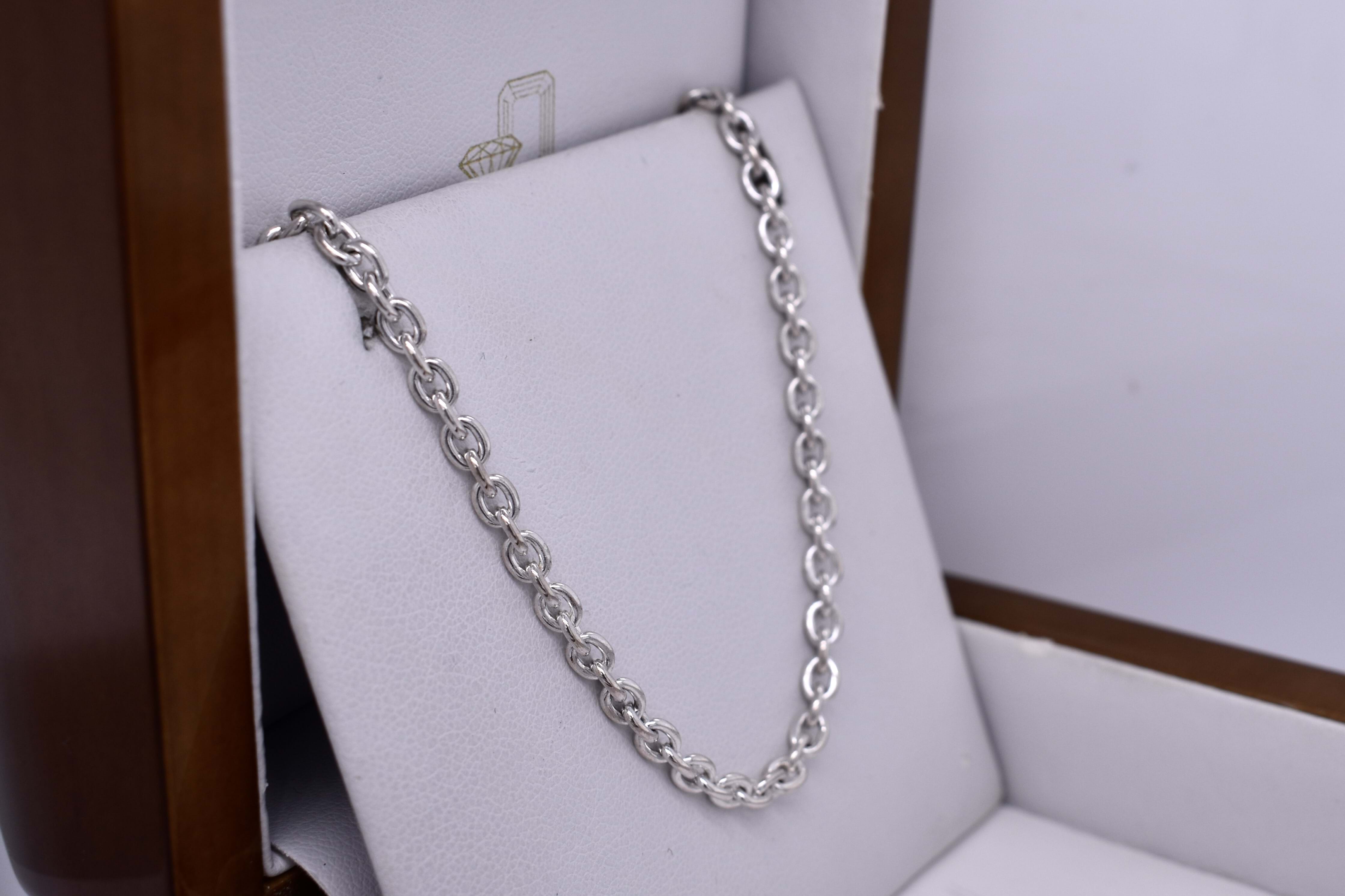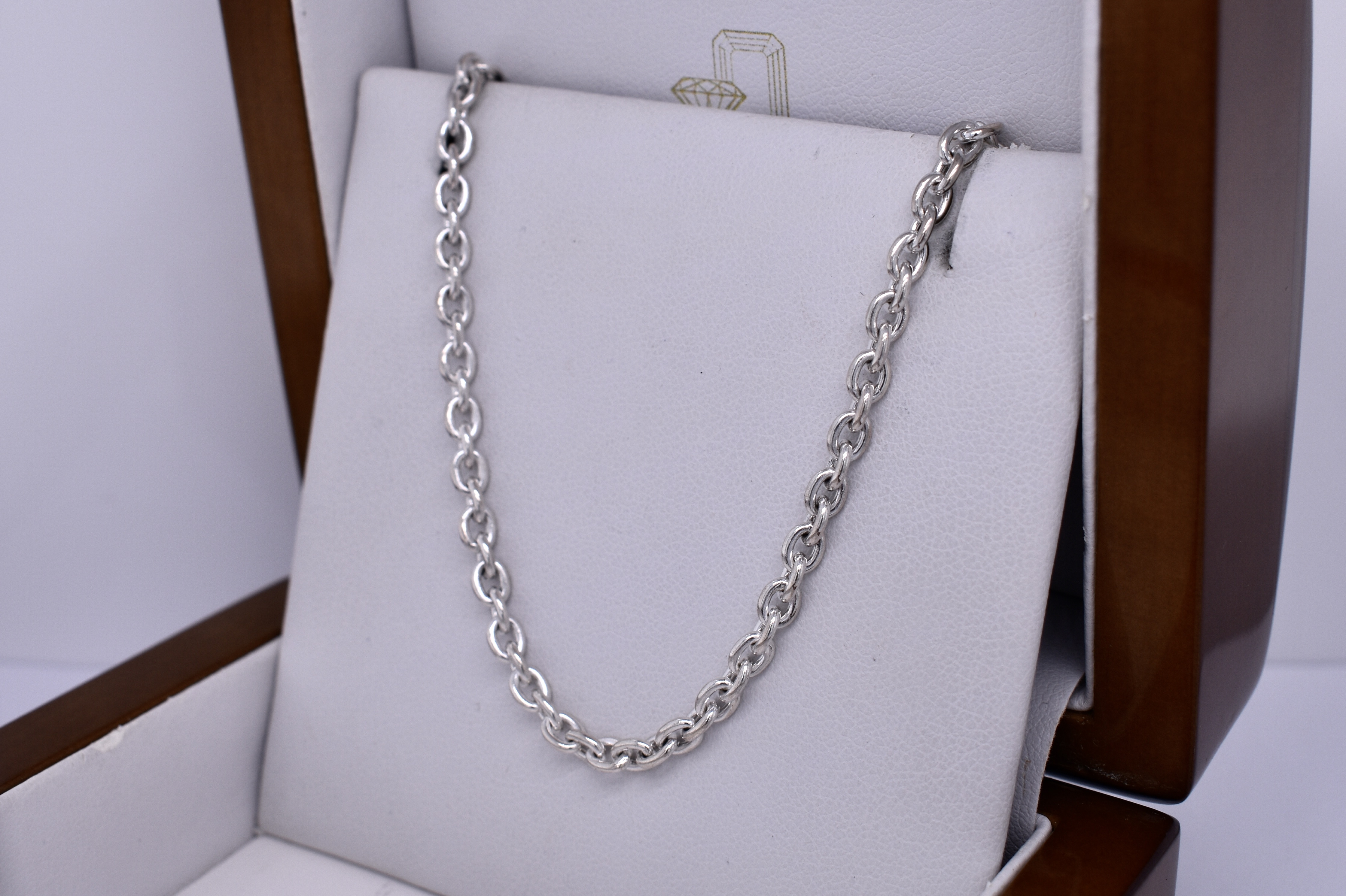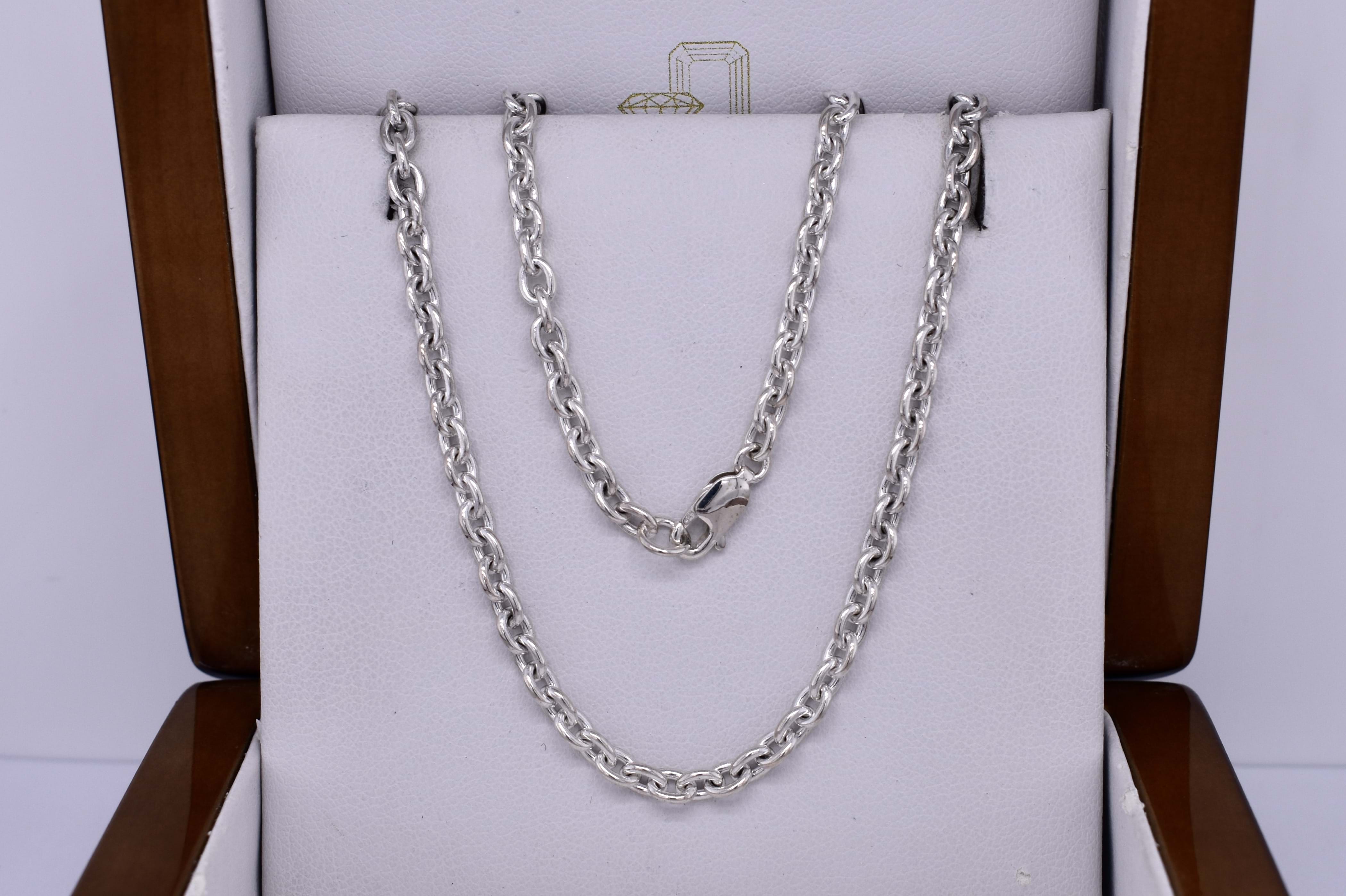 This beautiful chain was handmade by our goldsmith in sterling silver in a cable link, finished with a 10mm parrot clasp. It measures 44cm long and weighs 13.50grams. This chain is perfect to hang a pendant from or looks amazing alone.