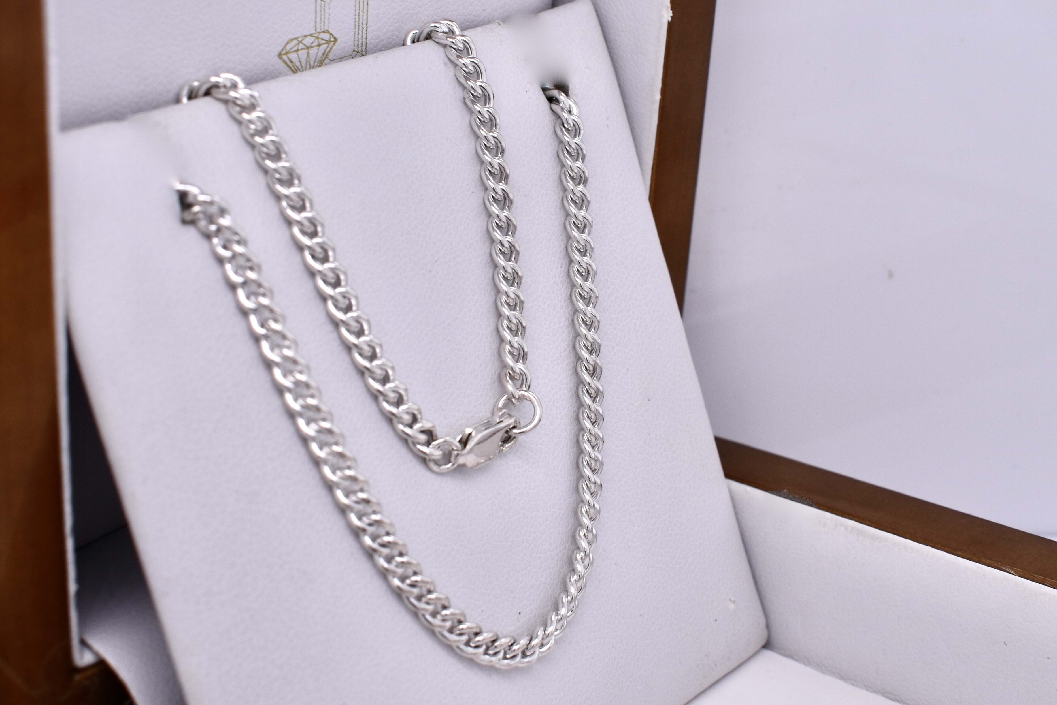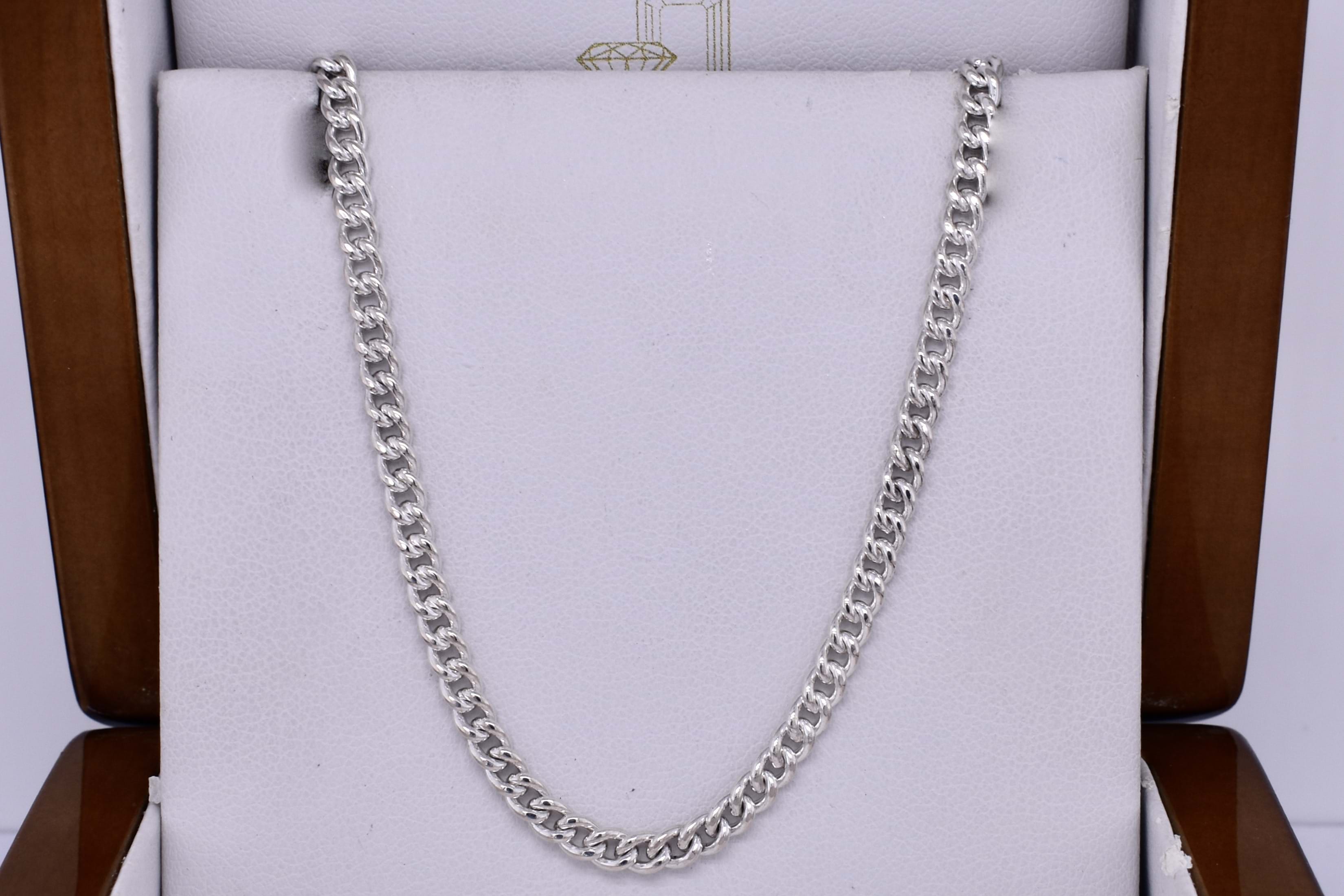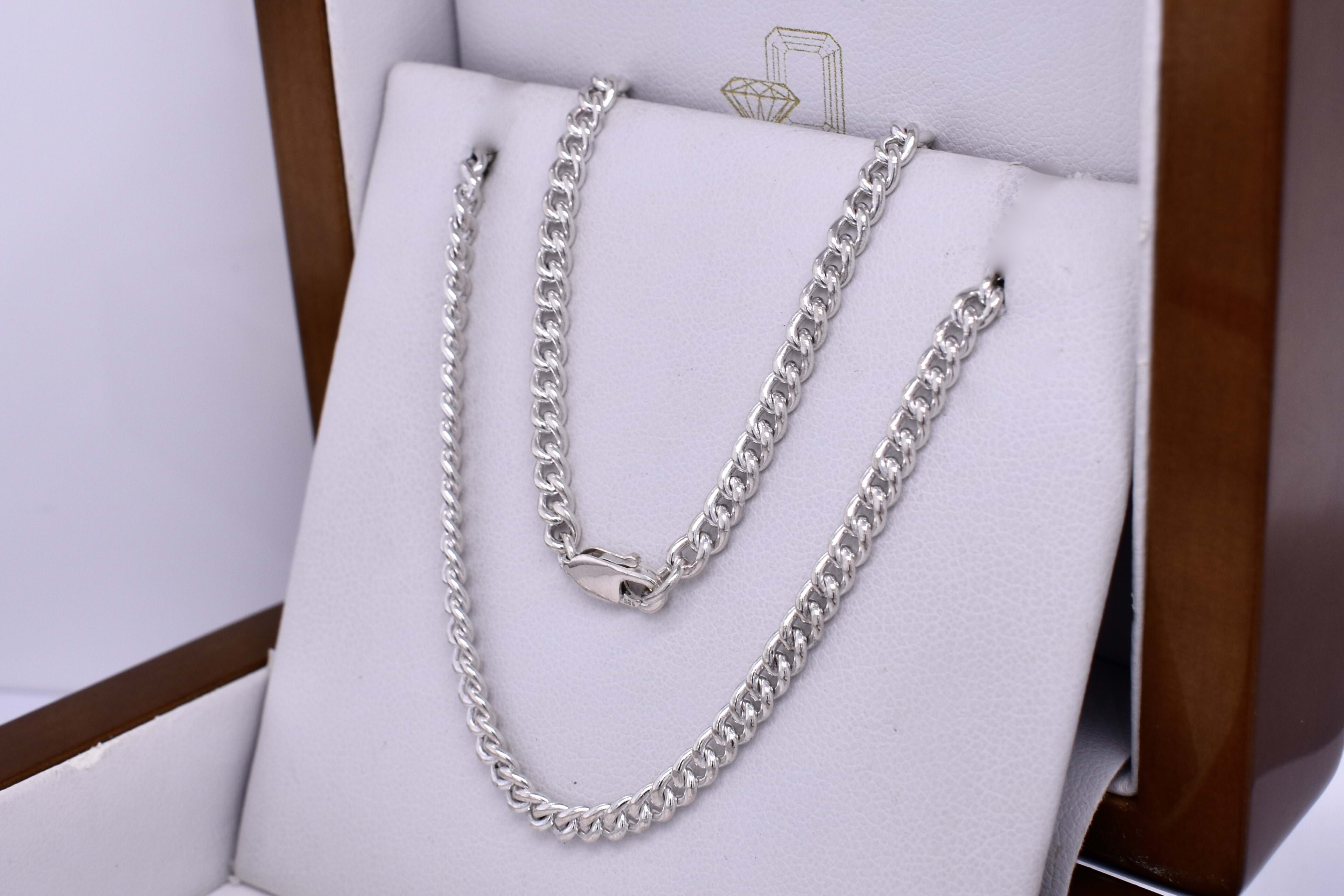 This popular chain was handmade by our goldsmith in sterling silver with a curb link, finished with a 10mm parrot clasp. It measures 45cm long and weighs 13.8grams. This chain is perfect to hang a pendant from or looks amazing alone.