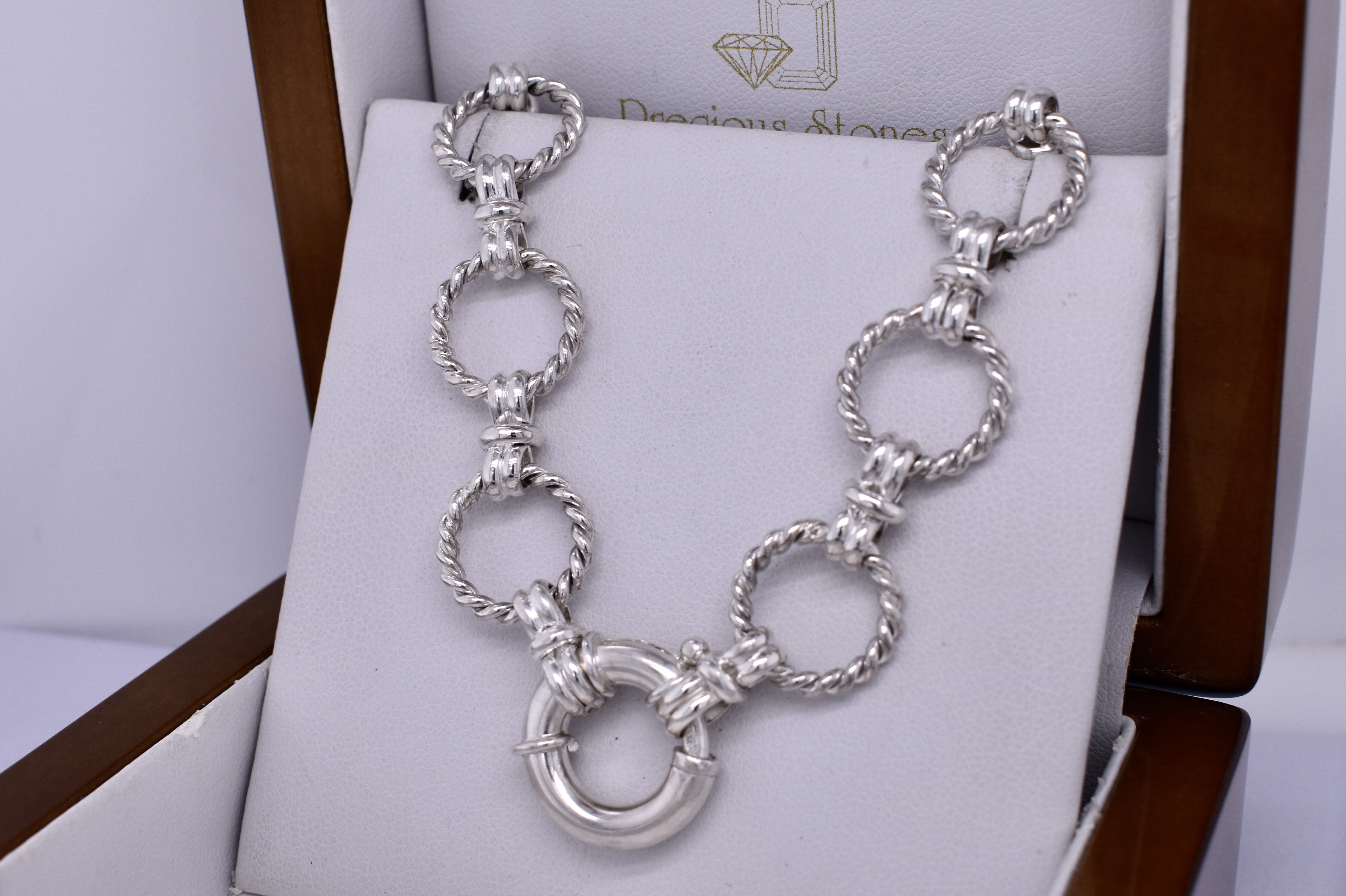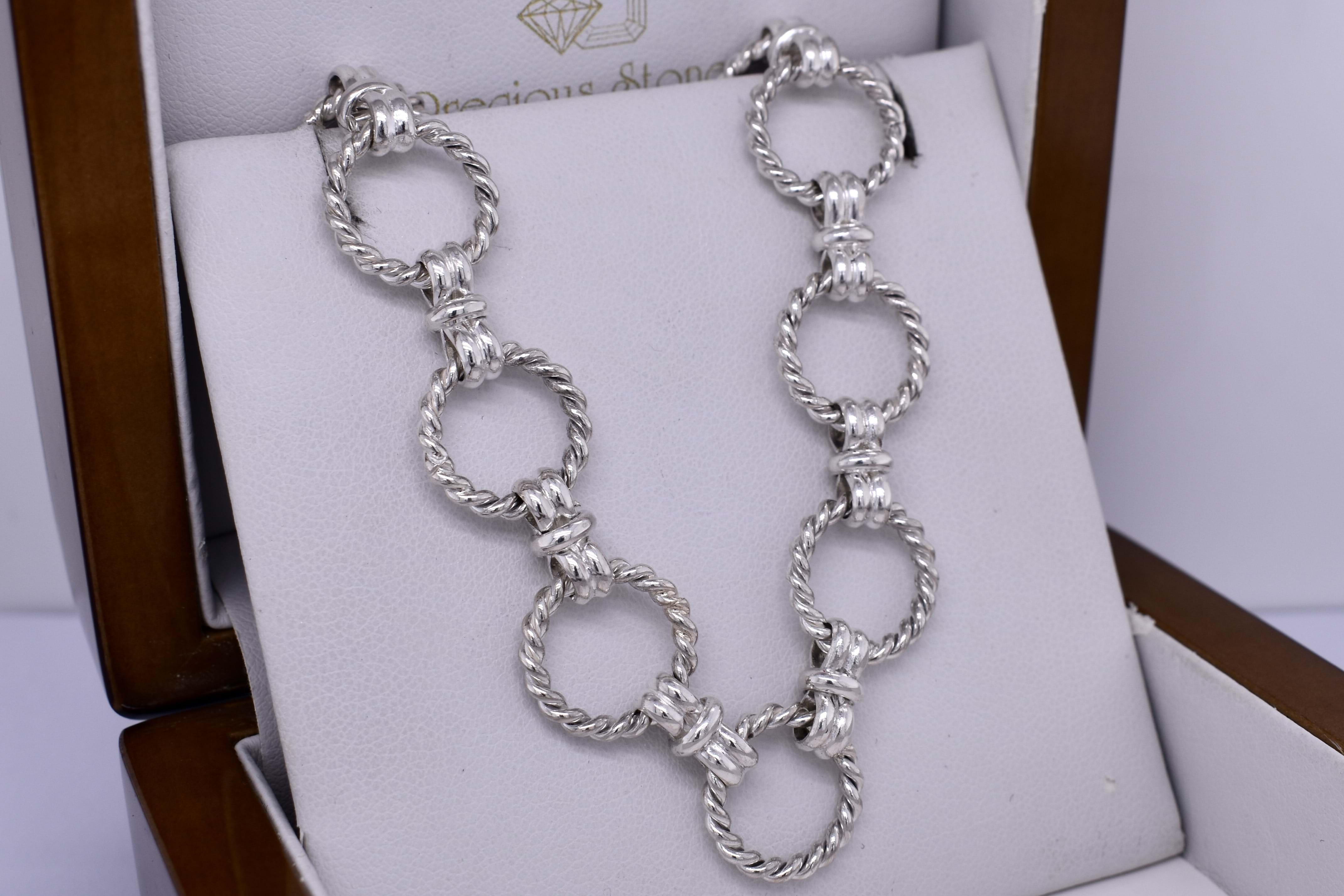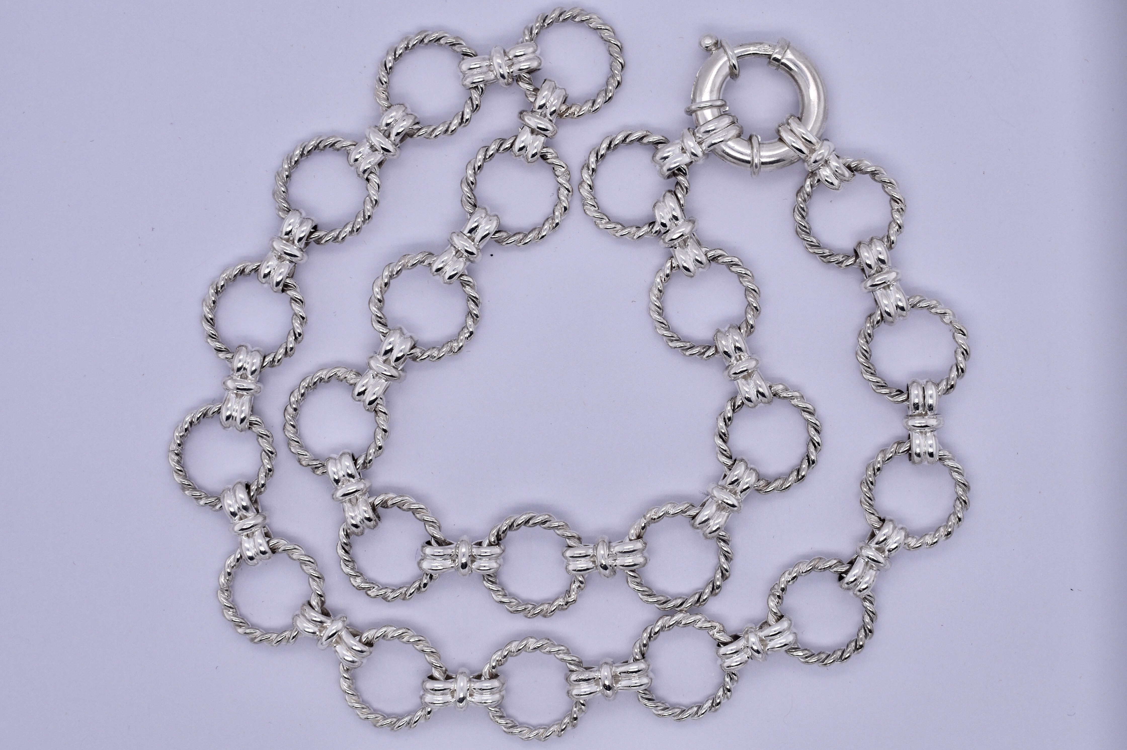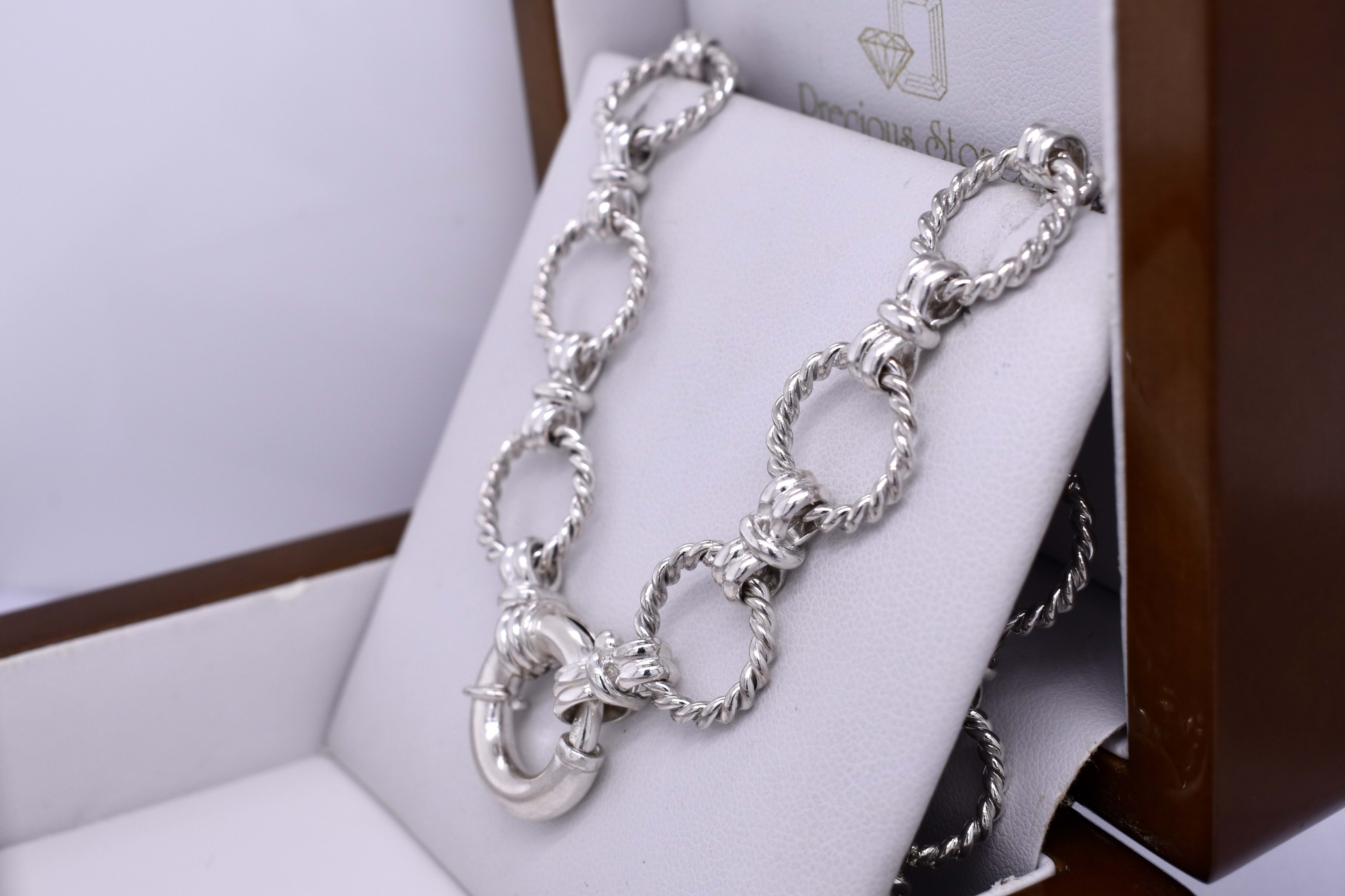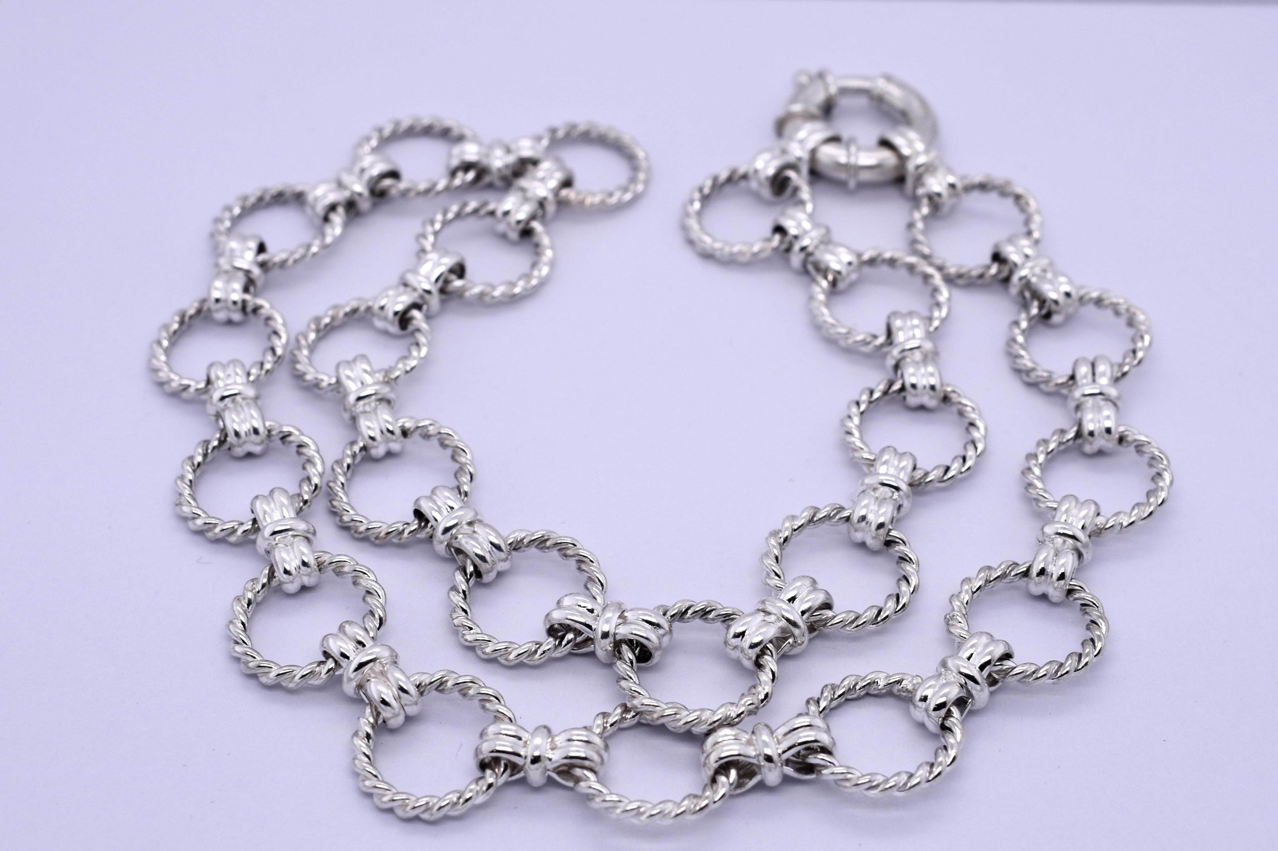 This eye catching chain was handmade by our goldsmith in sterling silver. It features a twisted Olympus rope link, continued with a bow link. It measures 46.5cm long and weighs 50.12grams. Finished with a 18mm boltring clasp, this chain is perfect to hang a pendant from or looks amazing alone.