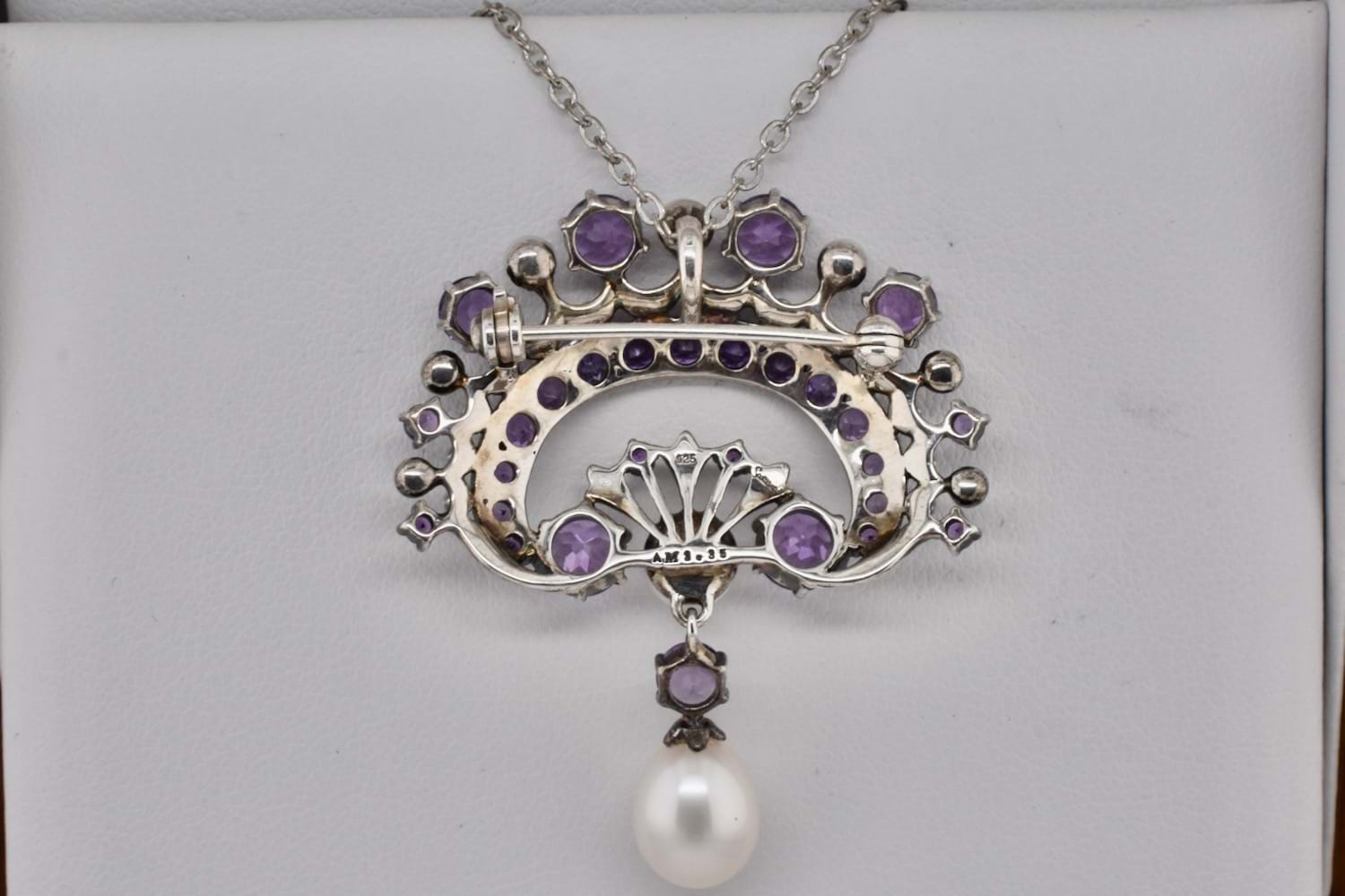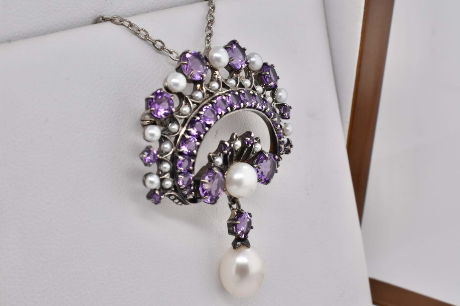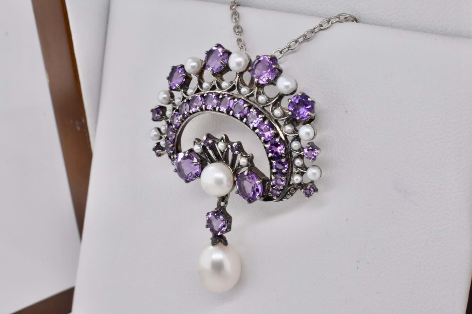 Silver Amethyst, Seed Pearl Coronet Brooch/Pendant