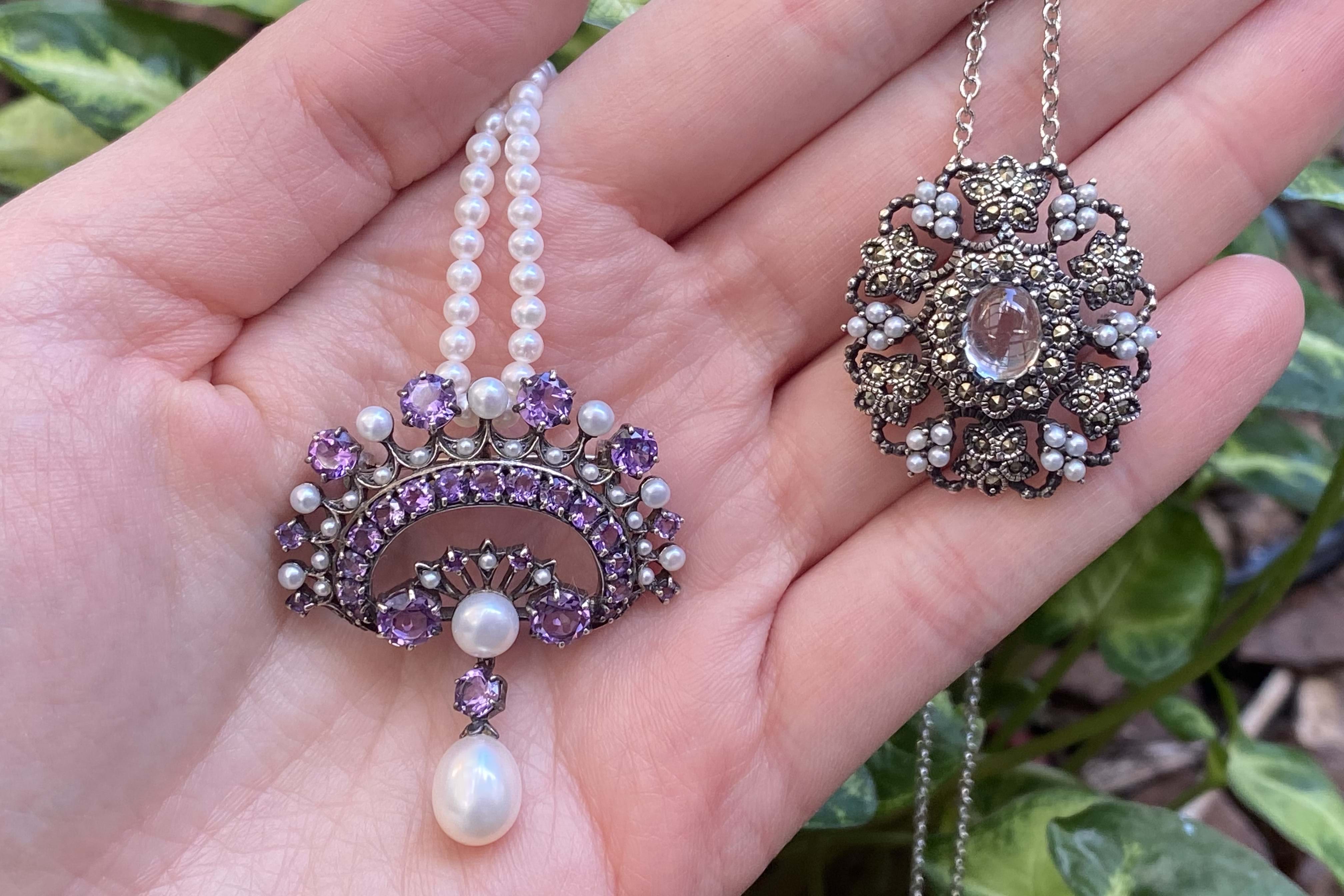 Sterling Silver brooch and pendant in the design of a coronet featuring stunning lavender amethystm seed pearls and marcasites. A feminine and versatile addition to any outfit and jewellery collection