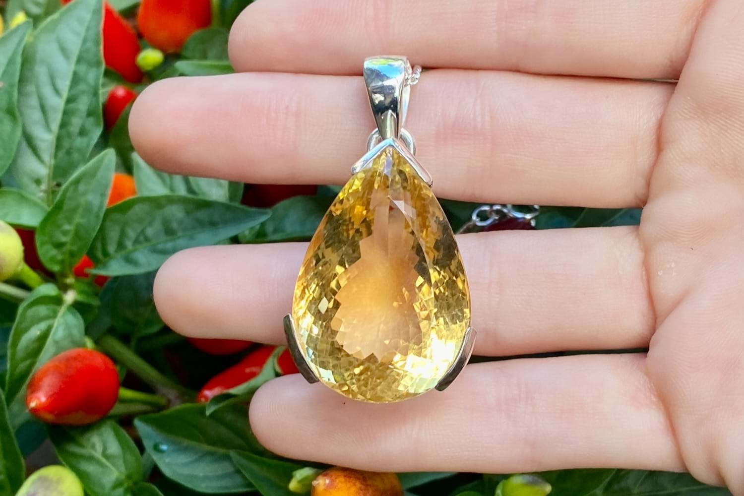 Simple and stunning sterling silver pendant with a huge and deep pear shape citrine measuring approx. 33 x 24mm, V cap and two claw set with a plain bail. Pictured with chain 20343781 available for separate purchase, other chains also available for separate purchase