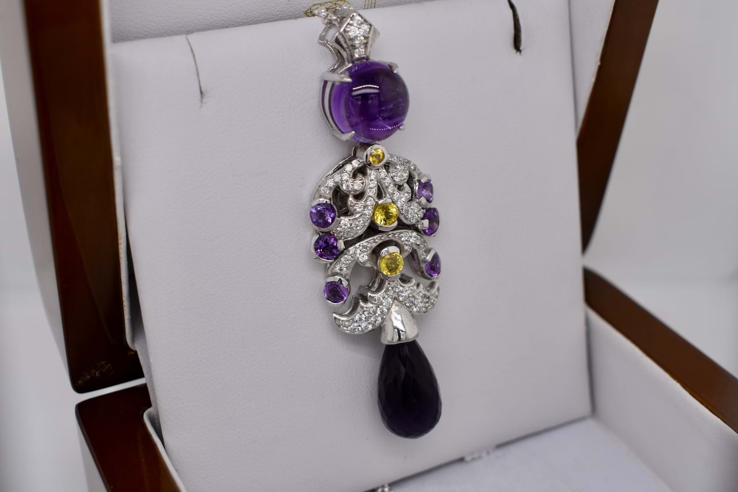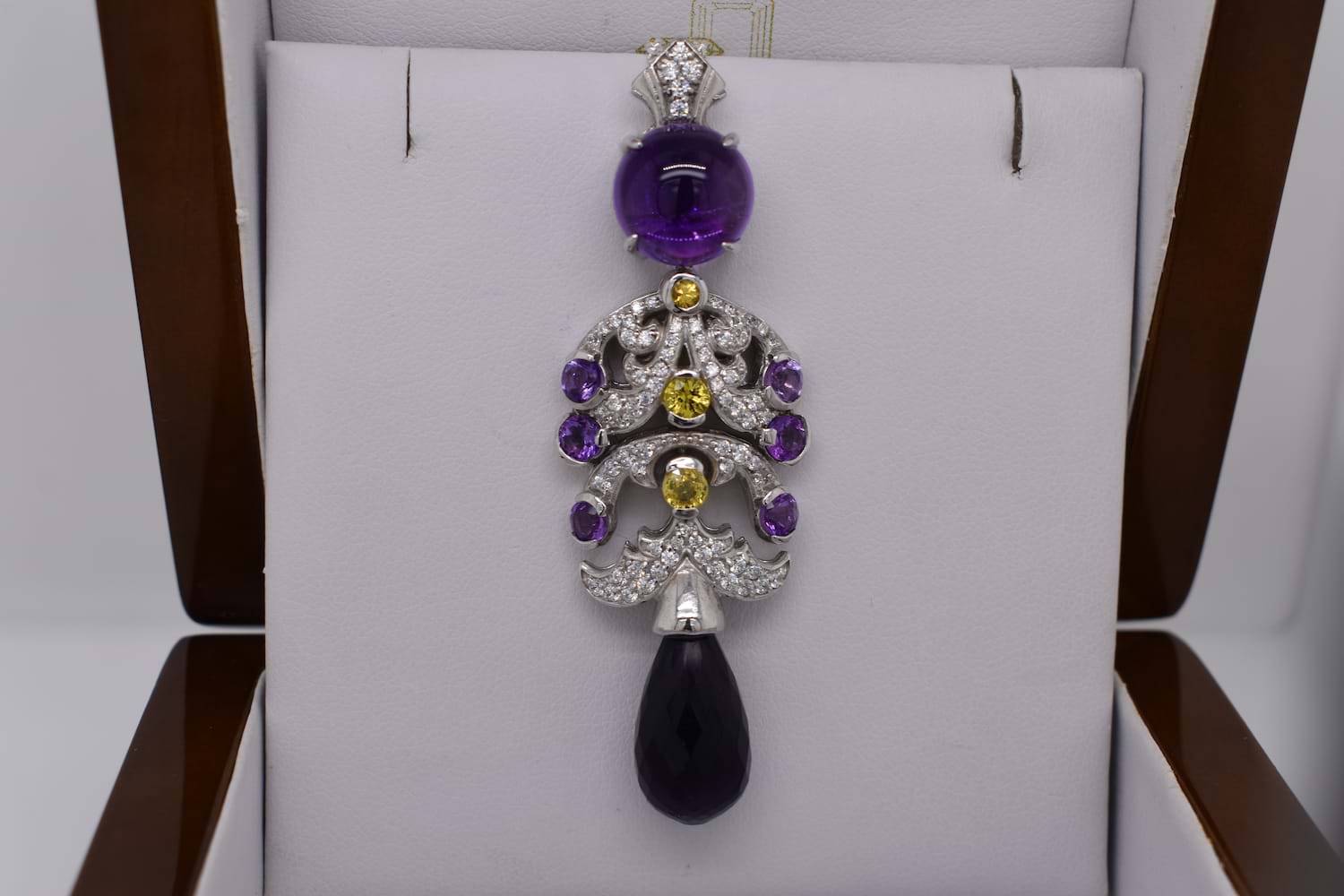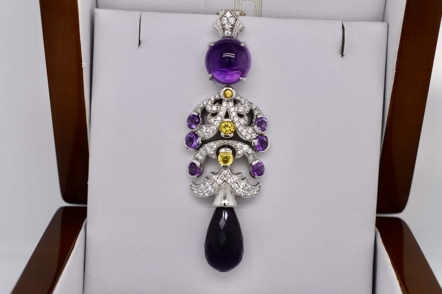 Intricate and fancy tiered pendant with articulated sections, set with a round cabochon amethyst and briolette as a drop, with yellow sapphires and accent natural white zircons. Pendant measures approx. 68 x 22.5mm. Chains available for separate purchase