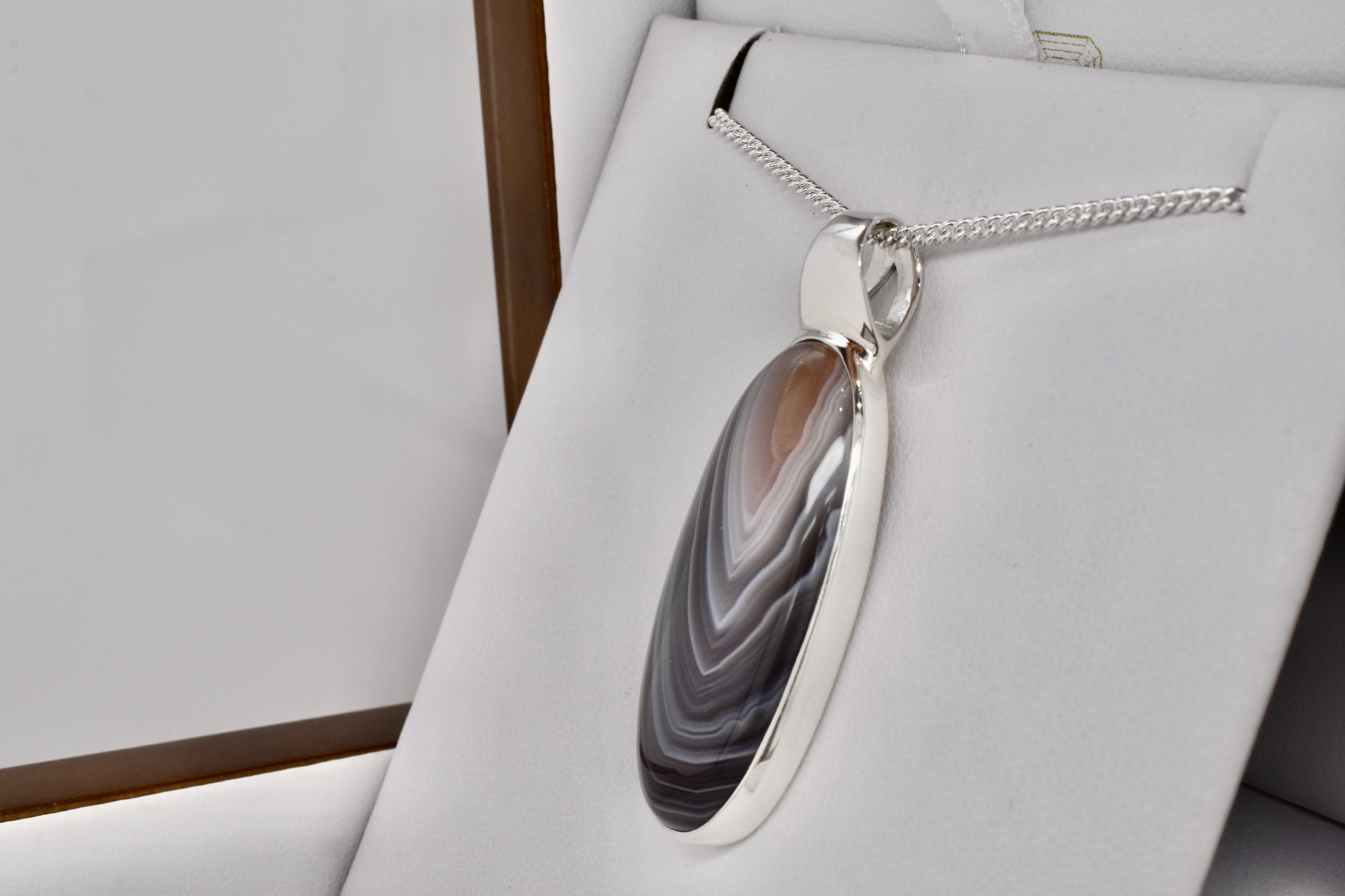 A striking and beautiful oval piece of banded agate bezel set into a simple handmade sterling silver pendant with solid tapered bale. Agate measure approx. 34.6x16.1mm. Chains are available for separate purchase