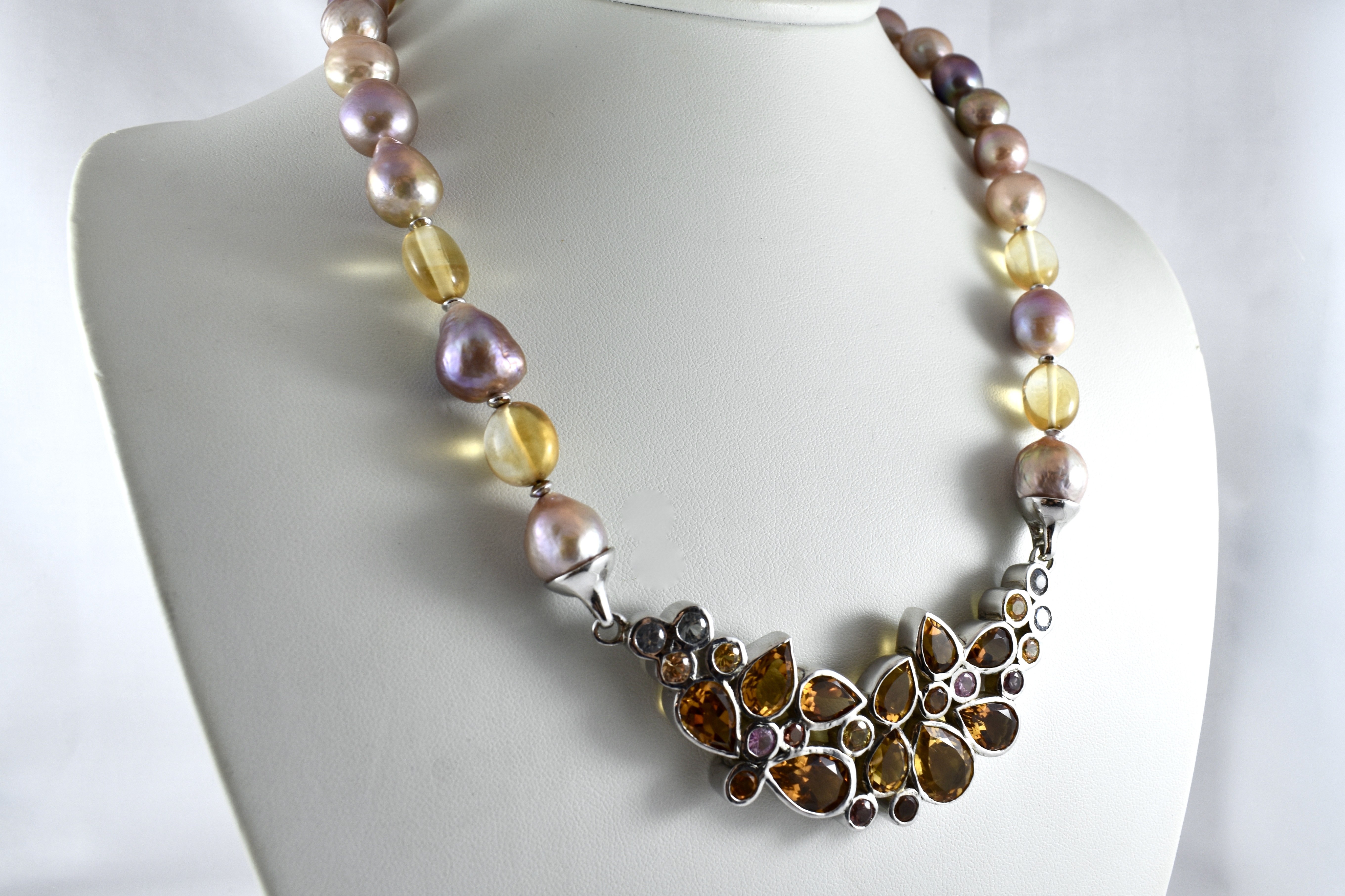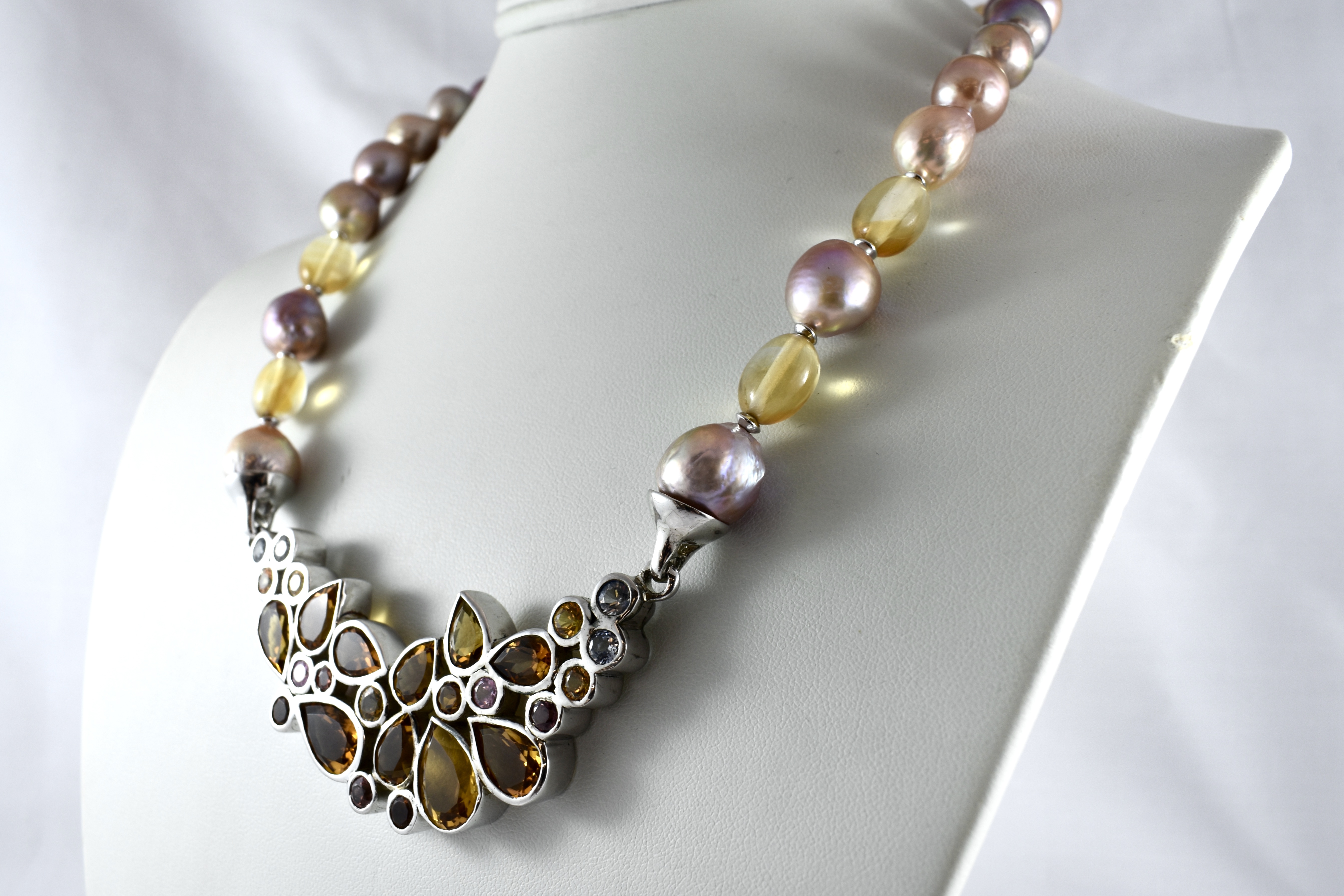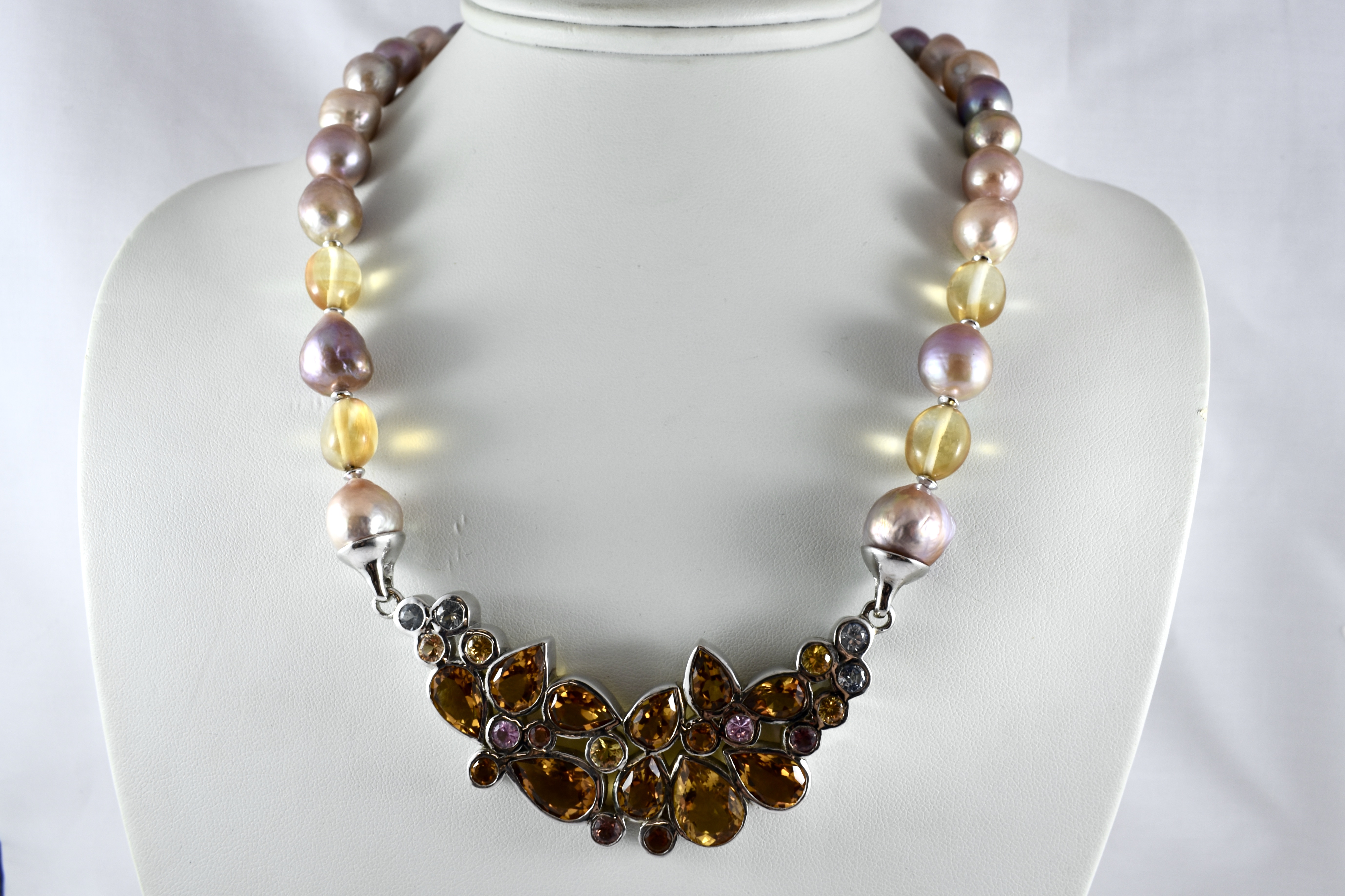 Pretty and pink! This sterling silver necklet contains a strand of twenty four pastel pink and lilac purple baroque pearls, measuring 16.8-12.0mm x 12.4-10.0mm, threaded with four pale yellow citrine beads, two either side. The centre piece of this necklet consists of faceted pear shaped citrines, as well as round pink, blue, yellow, orange and champagne coloured sapphires, all individually bezel set. Finished with a sterling silver octagon clasp grain set with cubic zirconias. Necklet measures 46cm and weighs 93.08 grams. Independent Valuation Supplied.
