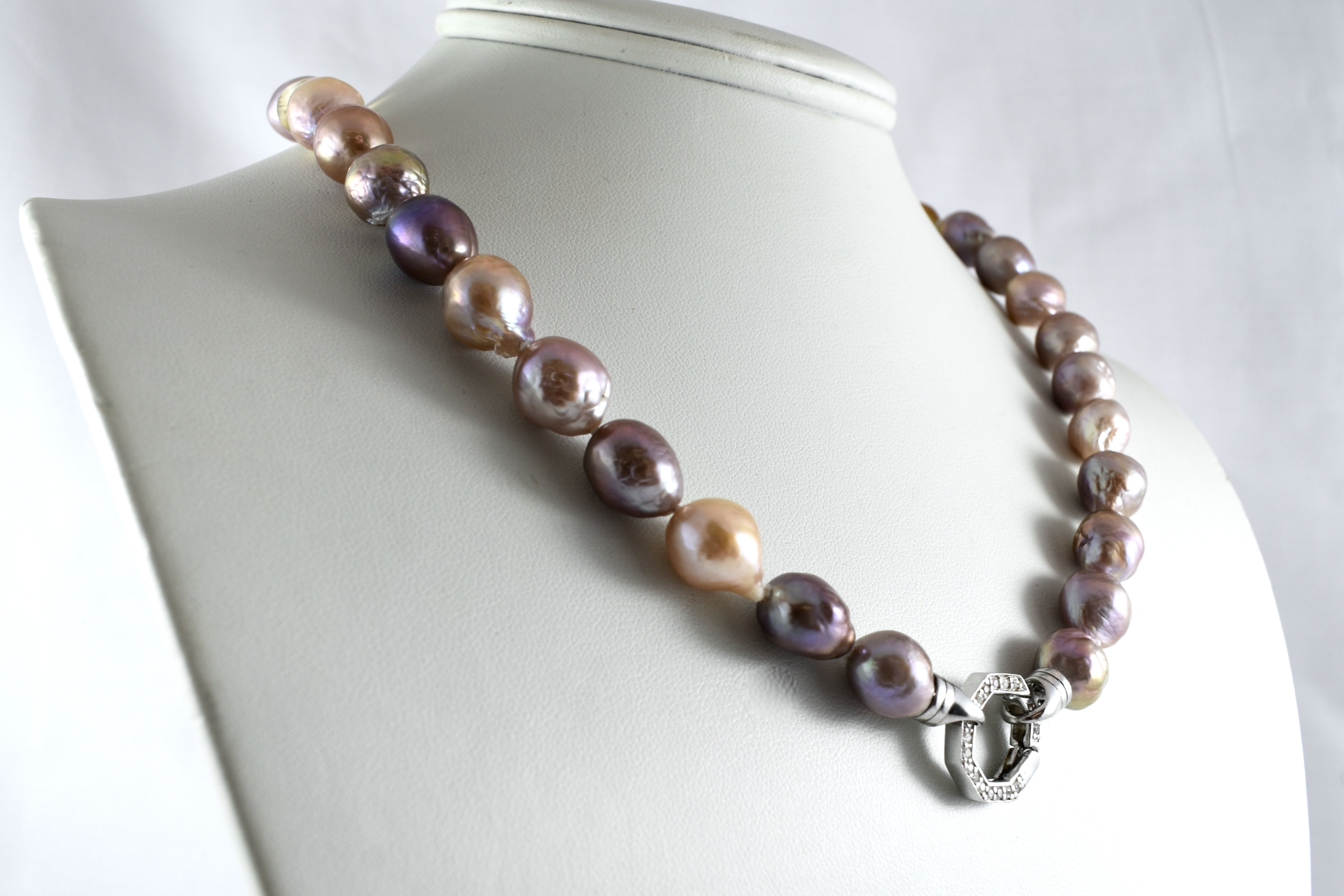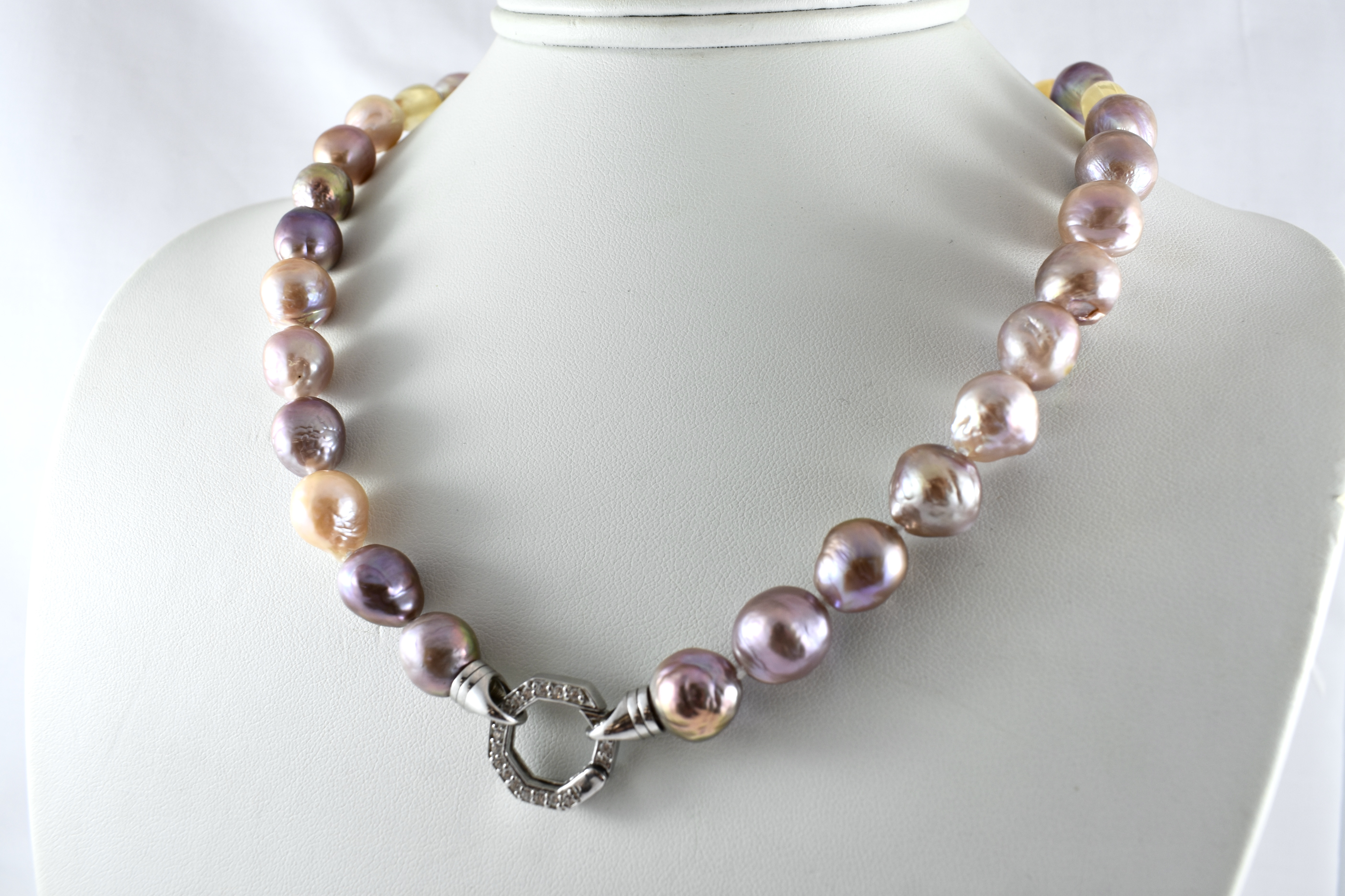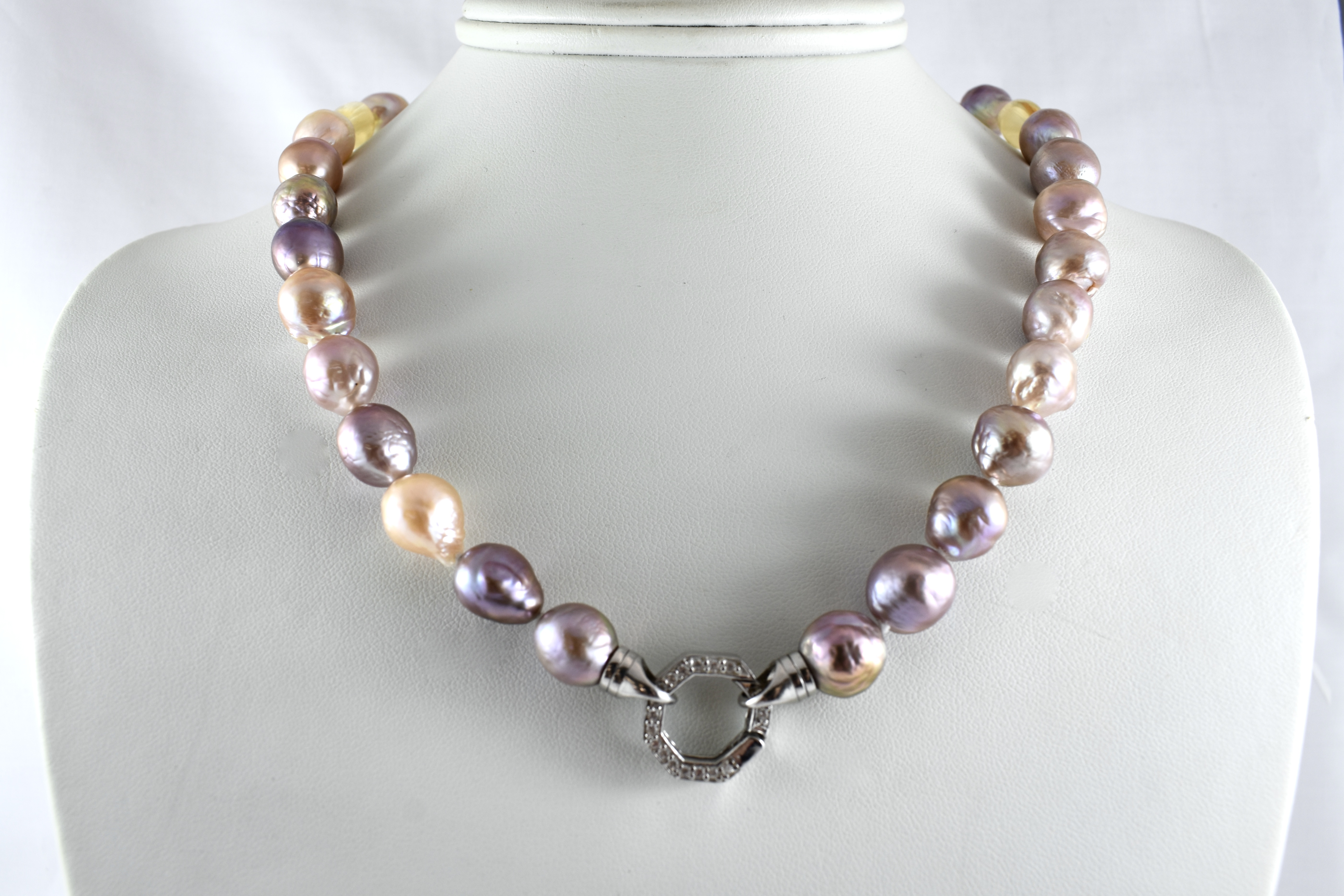 Pretty and pink! This sterling silver necklet contains a strand of twenty four pastel pink and lilac purple baroque pearls, measuring 16.8-12.0mm x 12.4-10.0mm, threaded with four pale yellow citrine beads, two either side. The centre piece of this necklet consists of faceted pear shaped citrines, as well as round pink, blue, yellow, orange and champagne coloured sapphires, all individually bezel set. Finished with a sterling silver octagon clasp grain set with cubic zirconias. Necklet measures 46cm and weighs 93.08 grams. Independent Valuation Supplied.