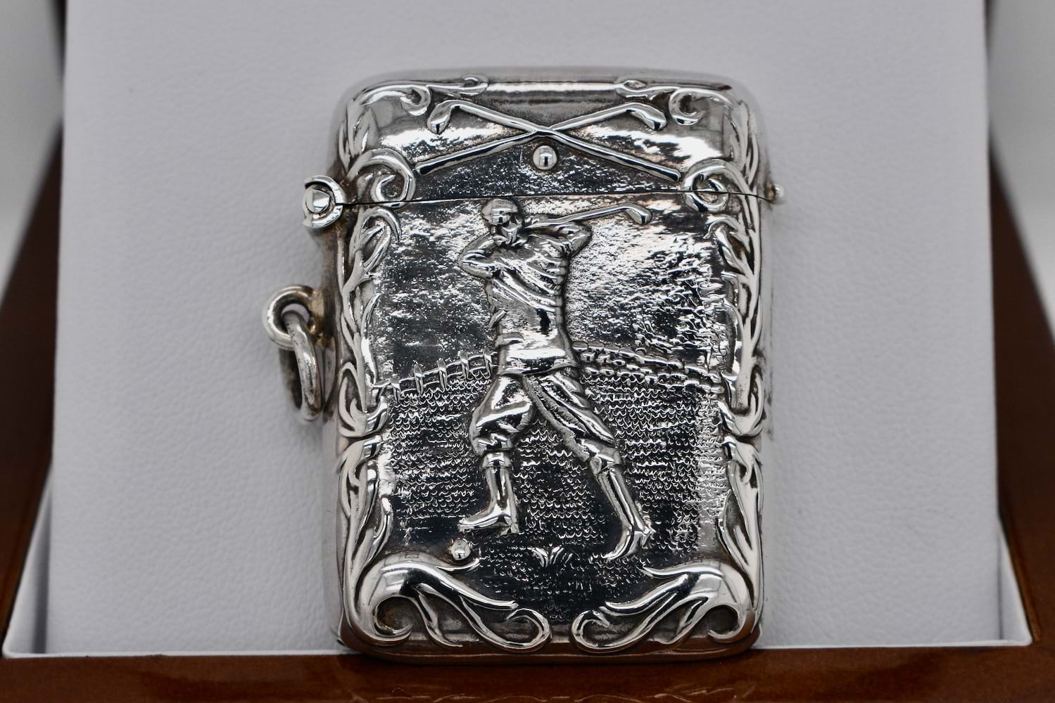 This reproduction sterling silver vesta case has an embossed golf design and makes a great gift for the man that has everything or as a trinket to hang on a ladies silver chain. Measuring approx 44x33x10mm