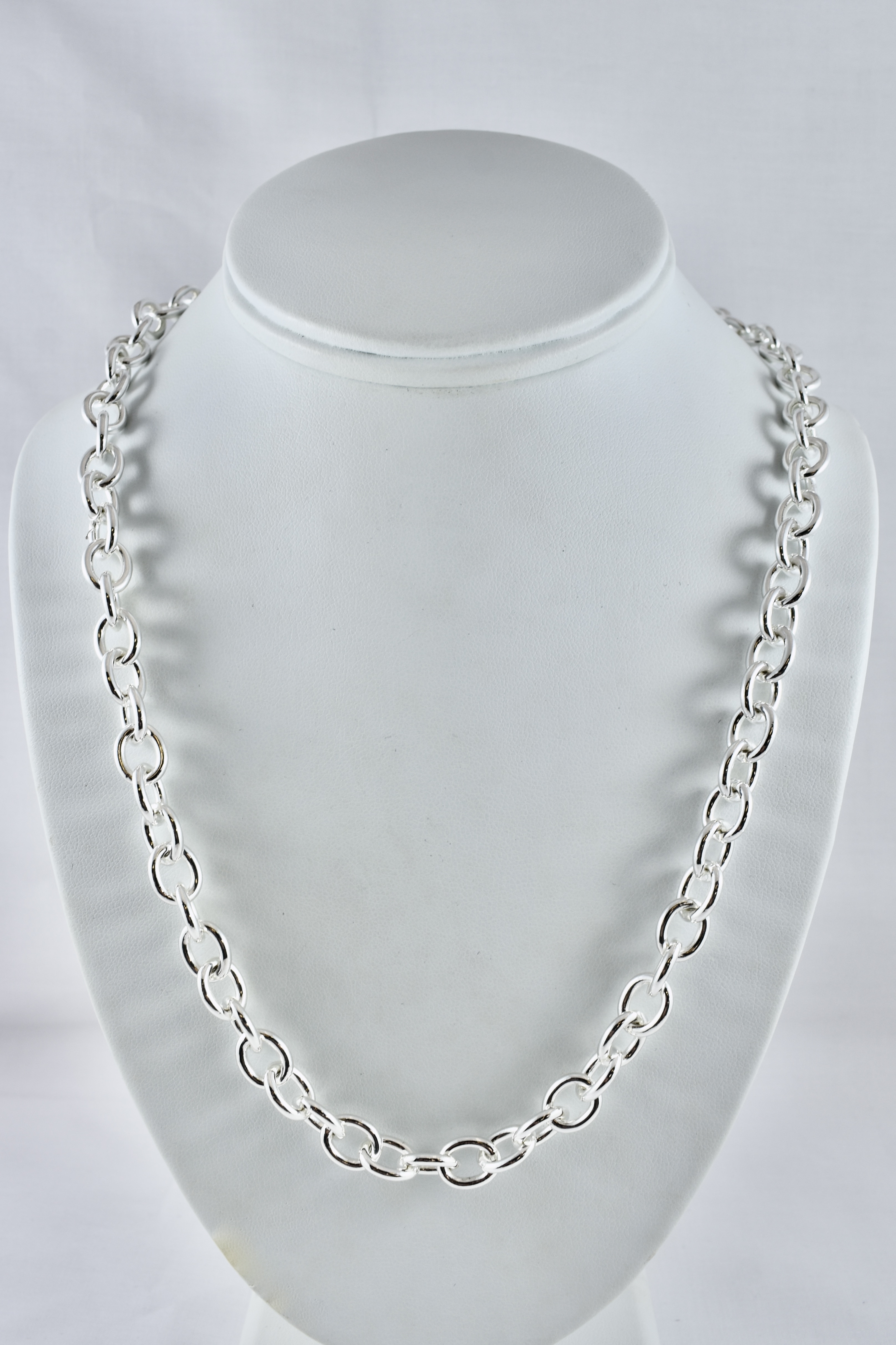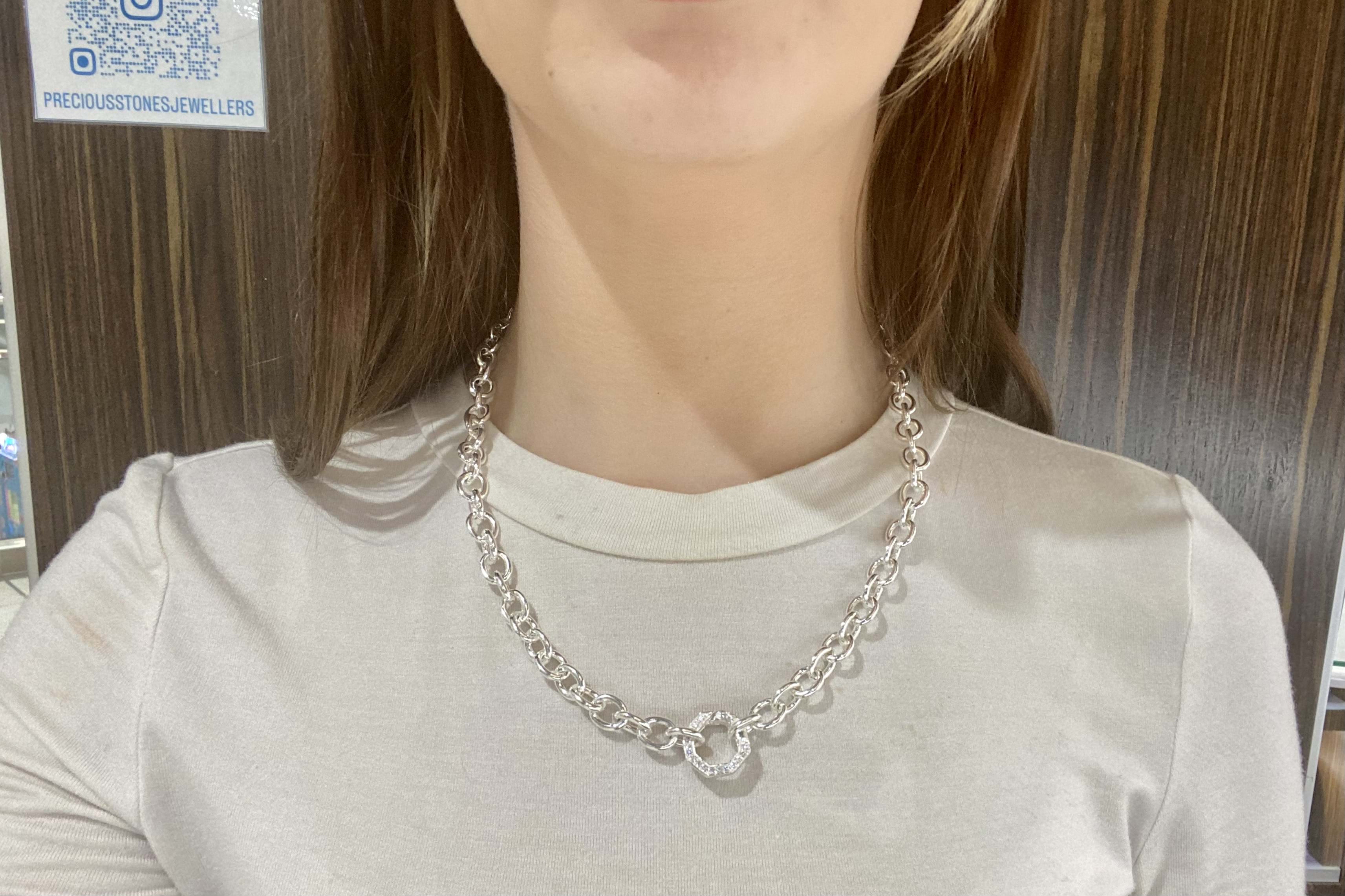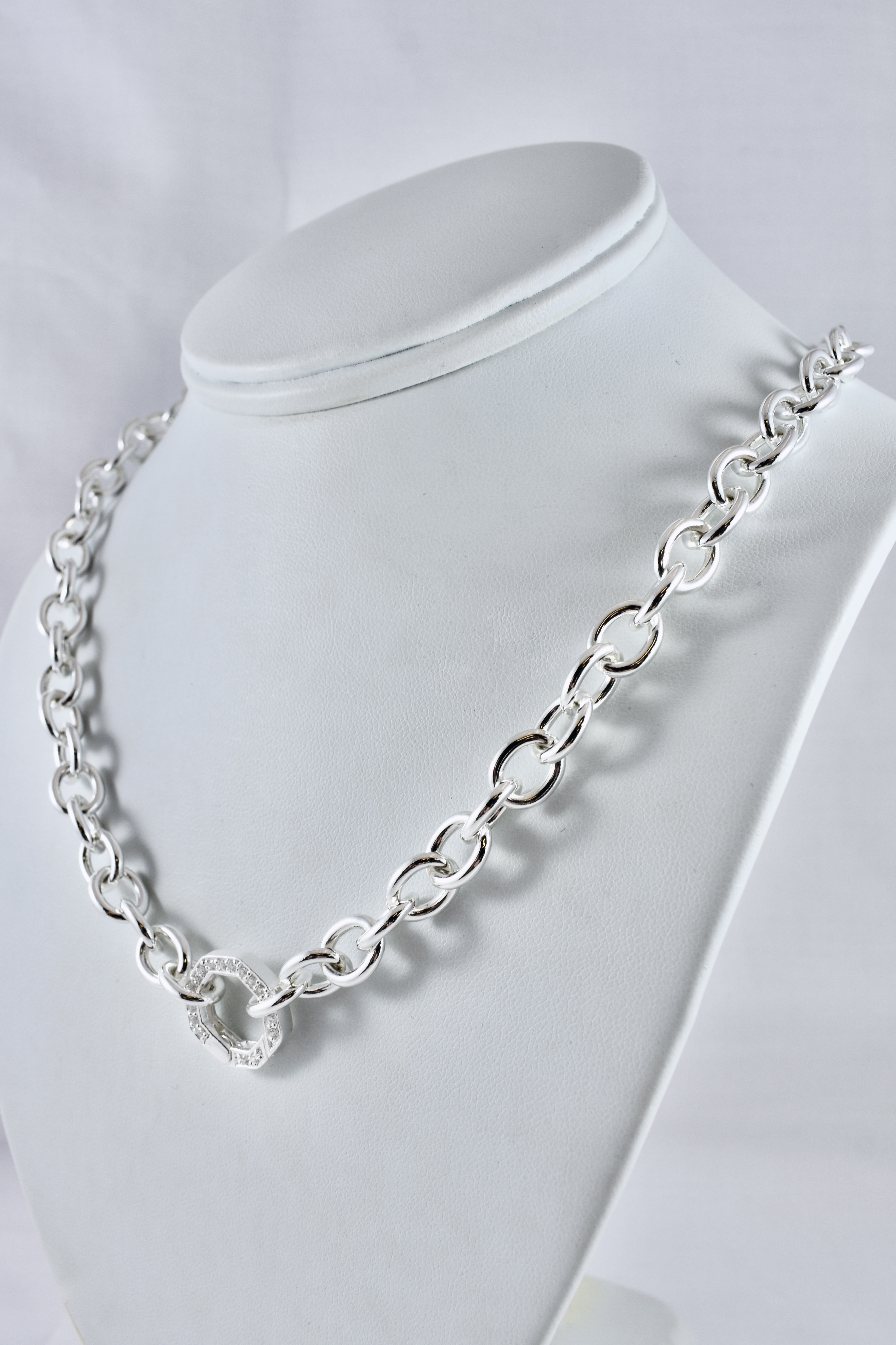 This classic chain is made of a sterling silver solid cable link and measures 53cm long. It is completed with a sterling silver cubic zirconia hexagon clasp and weighs 59.11grams. Perfect to wear alone or hang a pendant from.