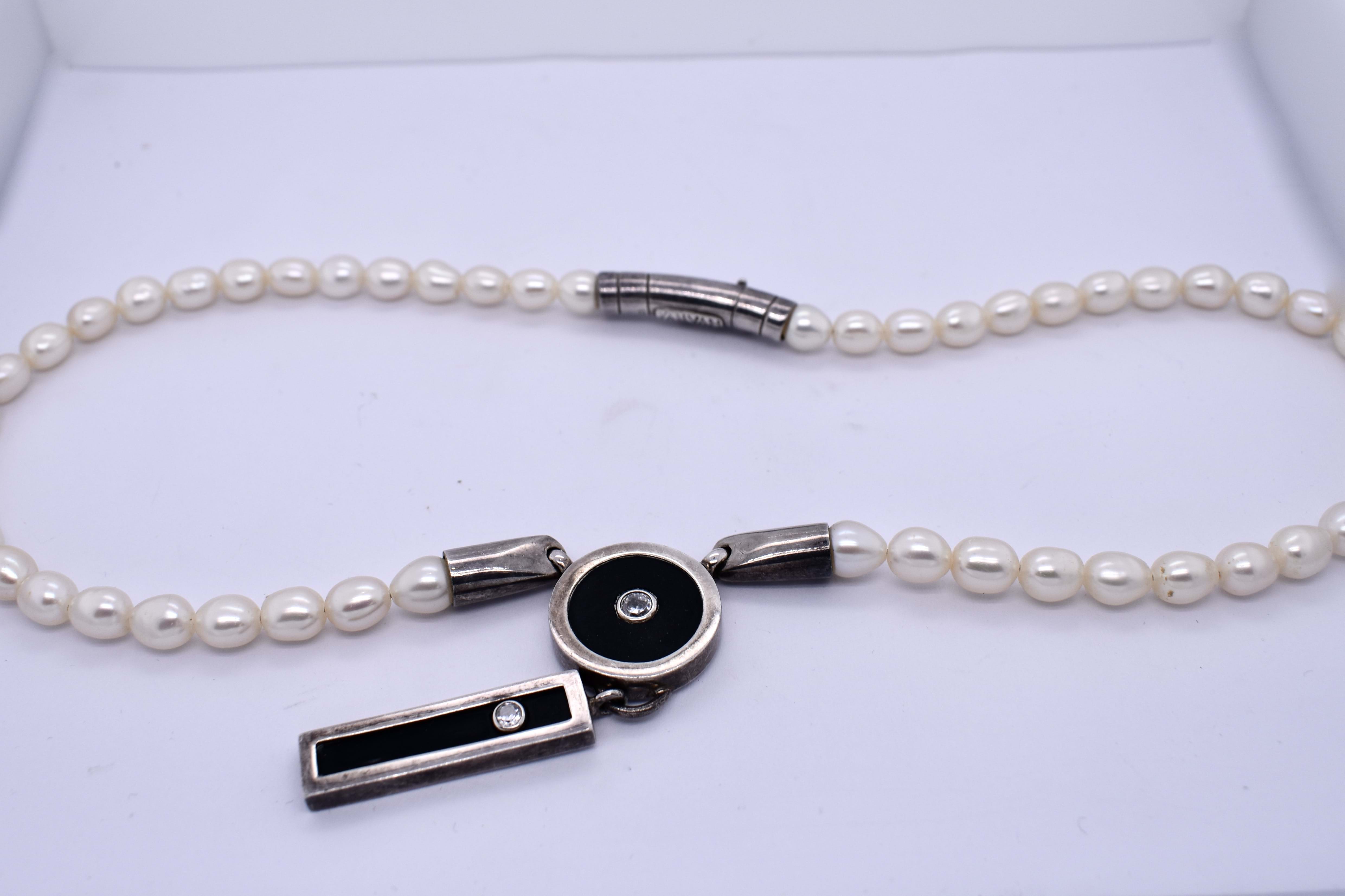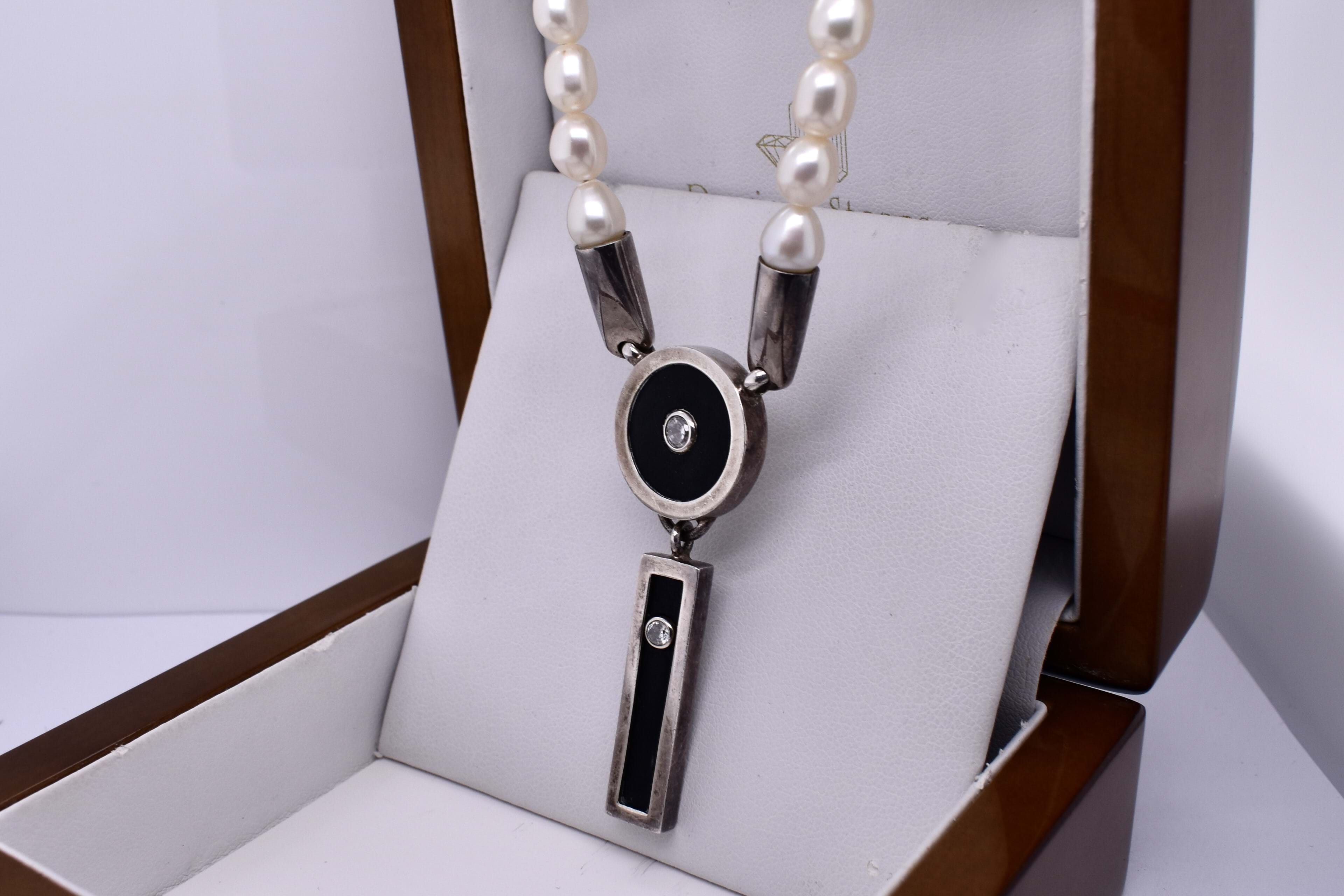 This elegant vintage necklet features a strand of rice pearls with sterling silver ends, attached with a striking disc shaped onyx pendant set with a CZ. Below, a rectangular CZ encrusted onyx drop hangs from the pendant and finishes the design with a smooth black on white contrast. Measuring 44cm in length and weighing 34 grams.