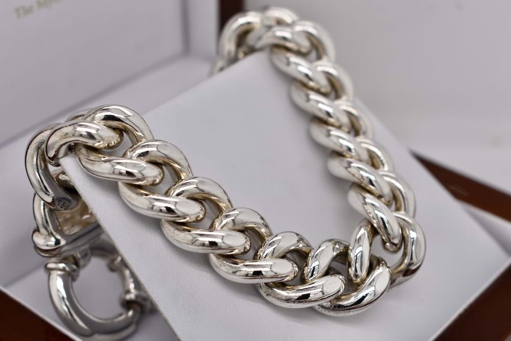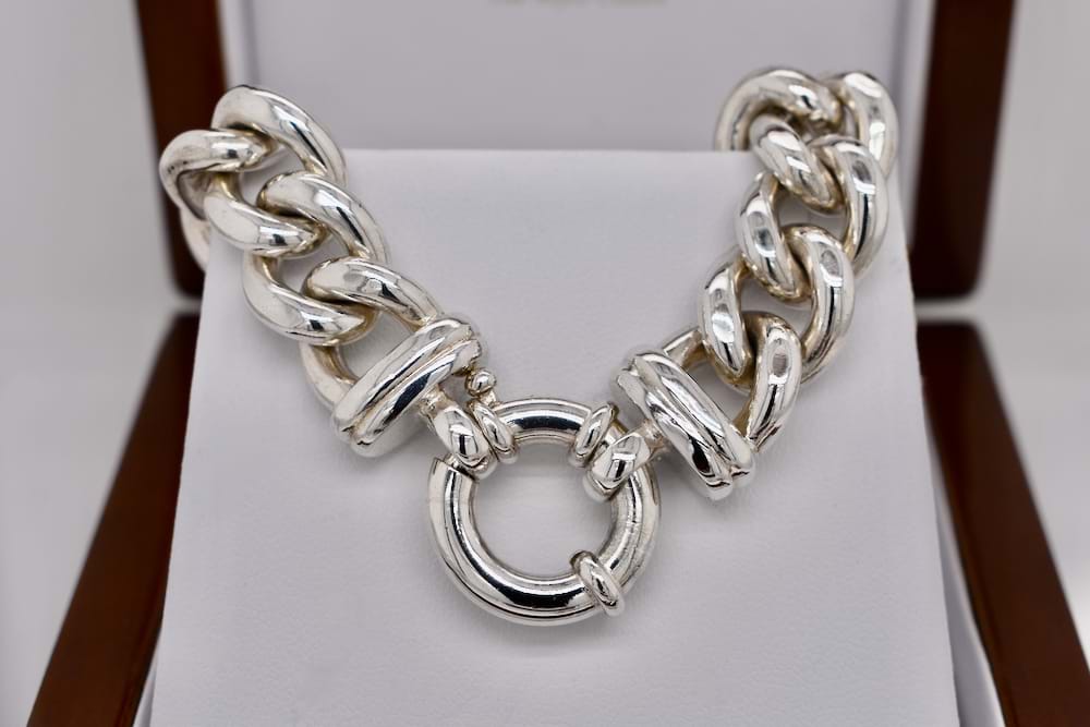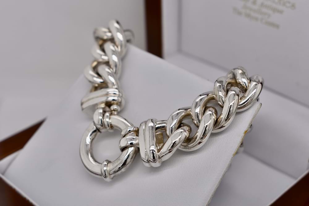 A stunning and timeless curb link bracelet handcrafted in sterling silver with end finials and a bolt ring clasp. Each link is individually hallmarked, bracelet length is 19.5cm, weight is 87.5grams and width is 13mm.