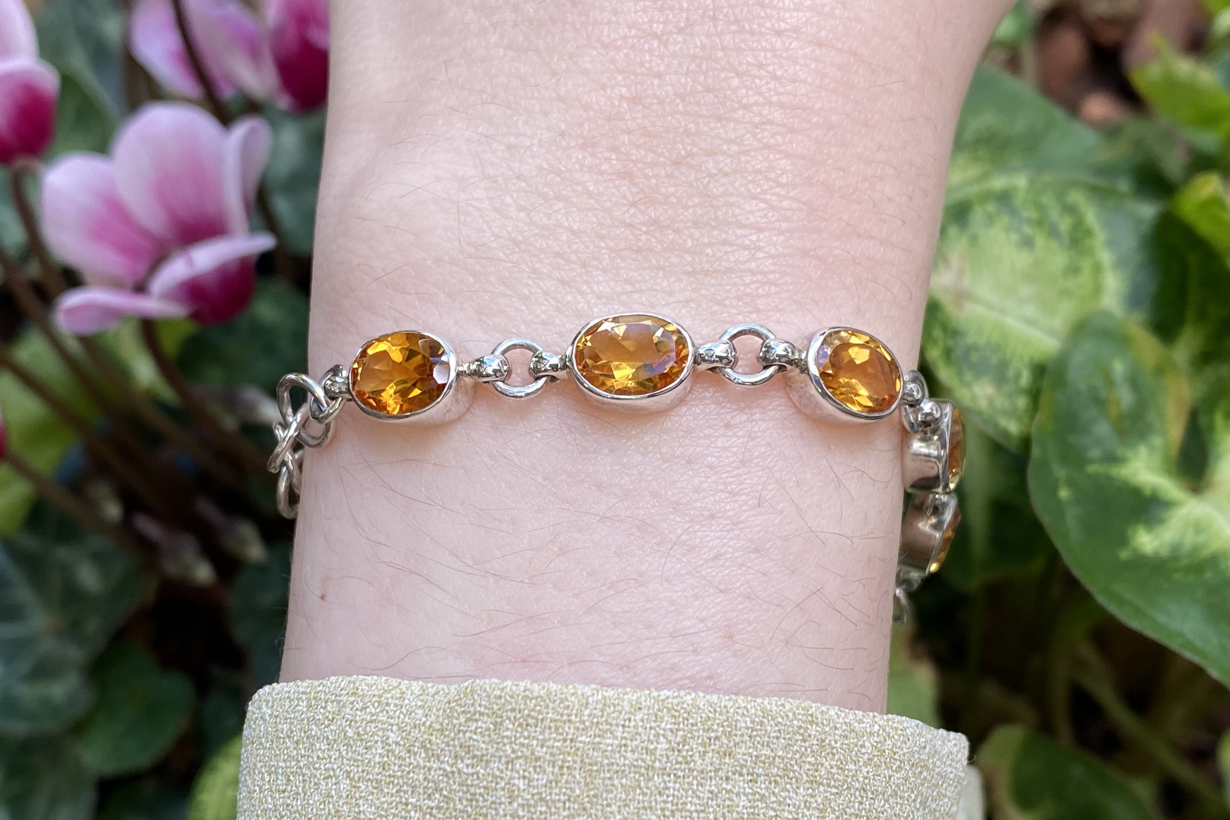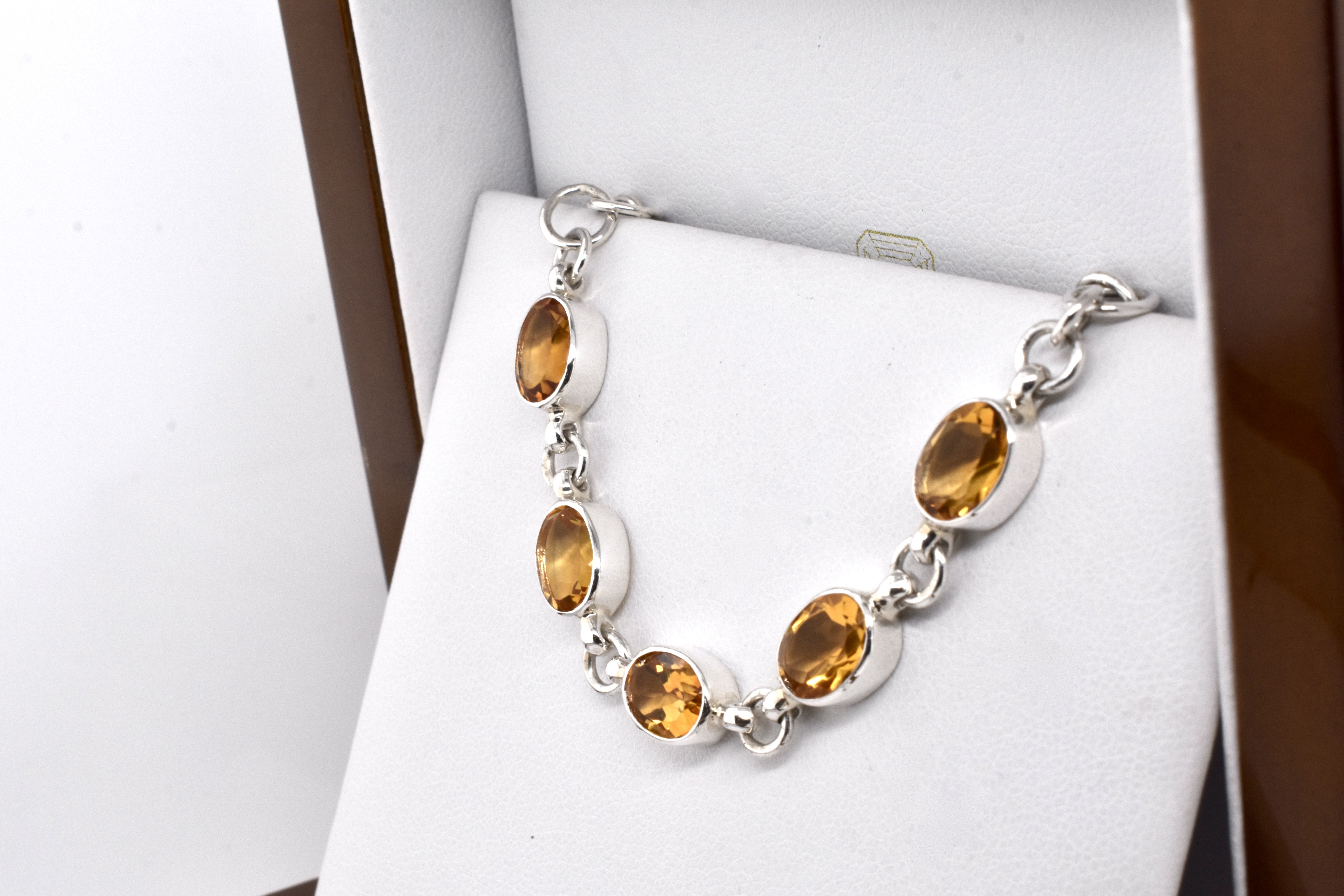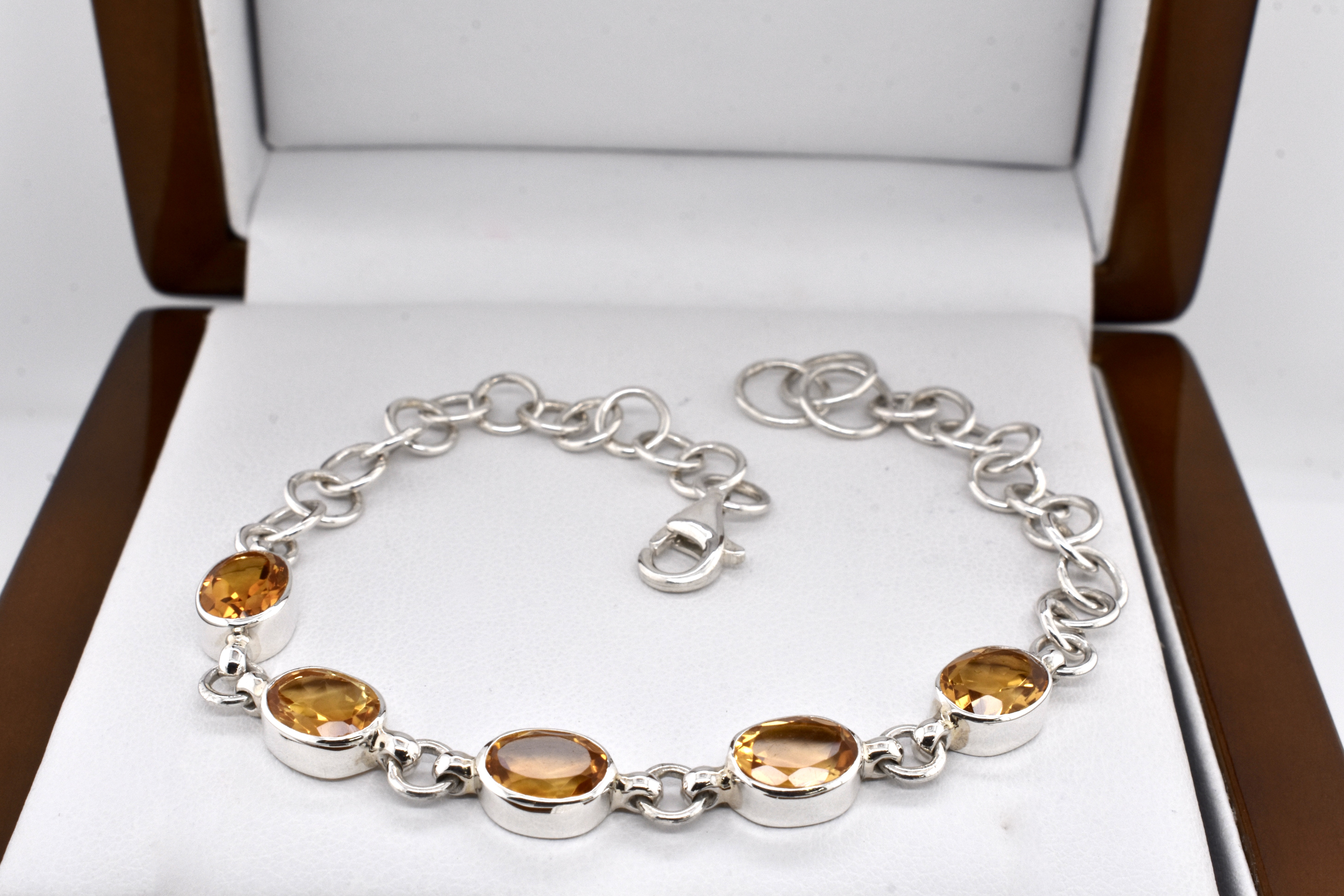 This gorgeous bracelet is handmade in sterling silver and features five oval citrine measuring approx. 8 x 6mm in bezel settings with circular links. Bracelet measures 21cm long