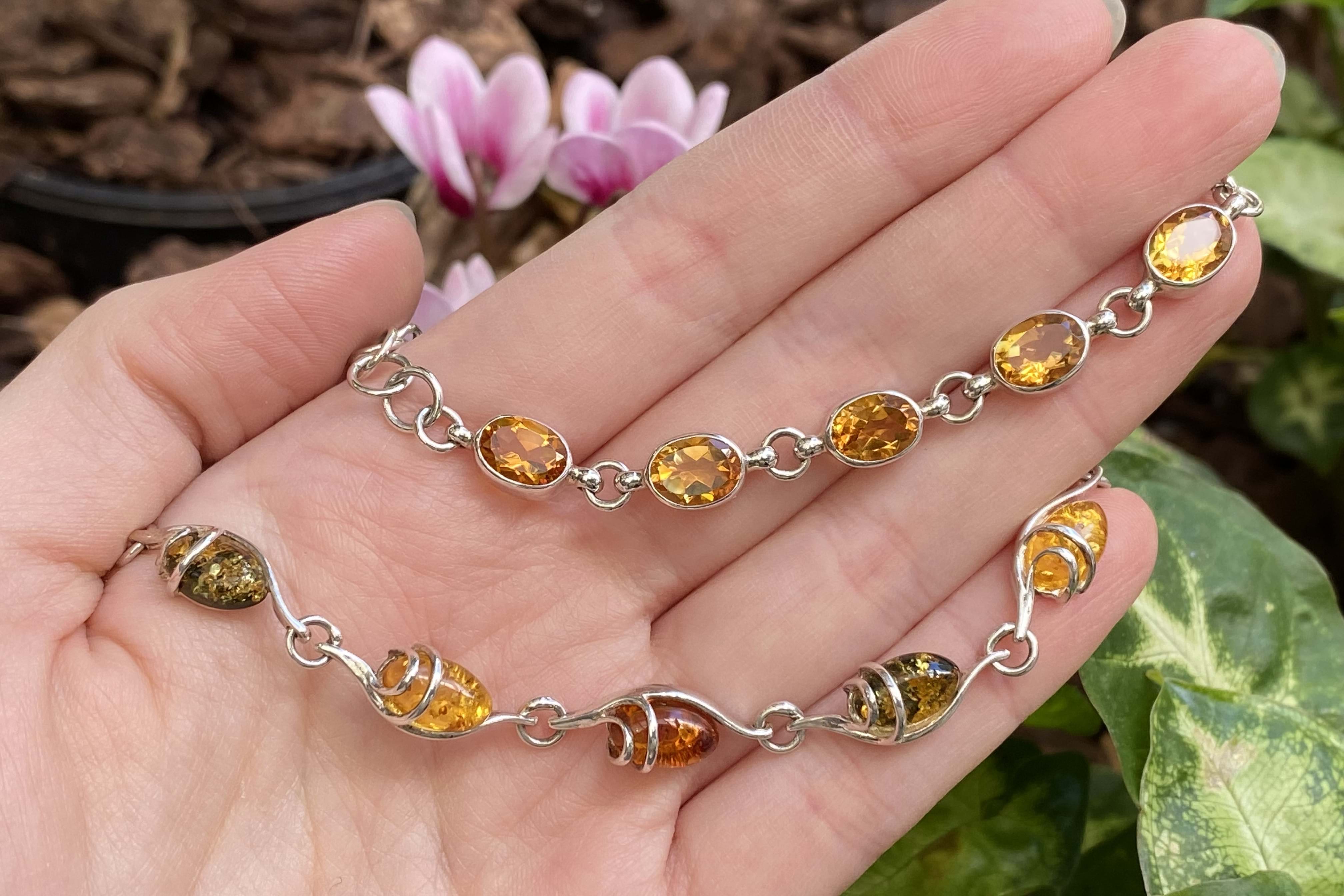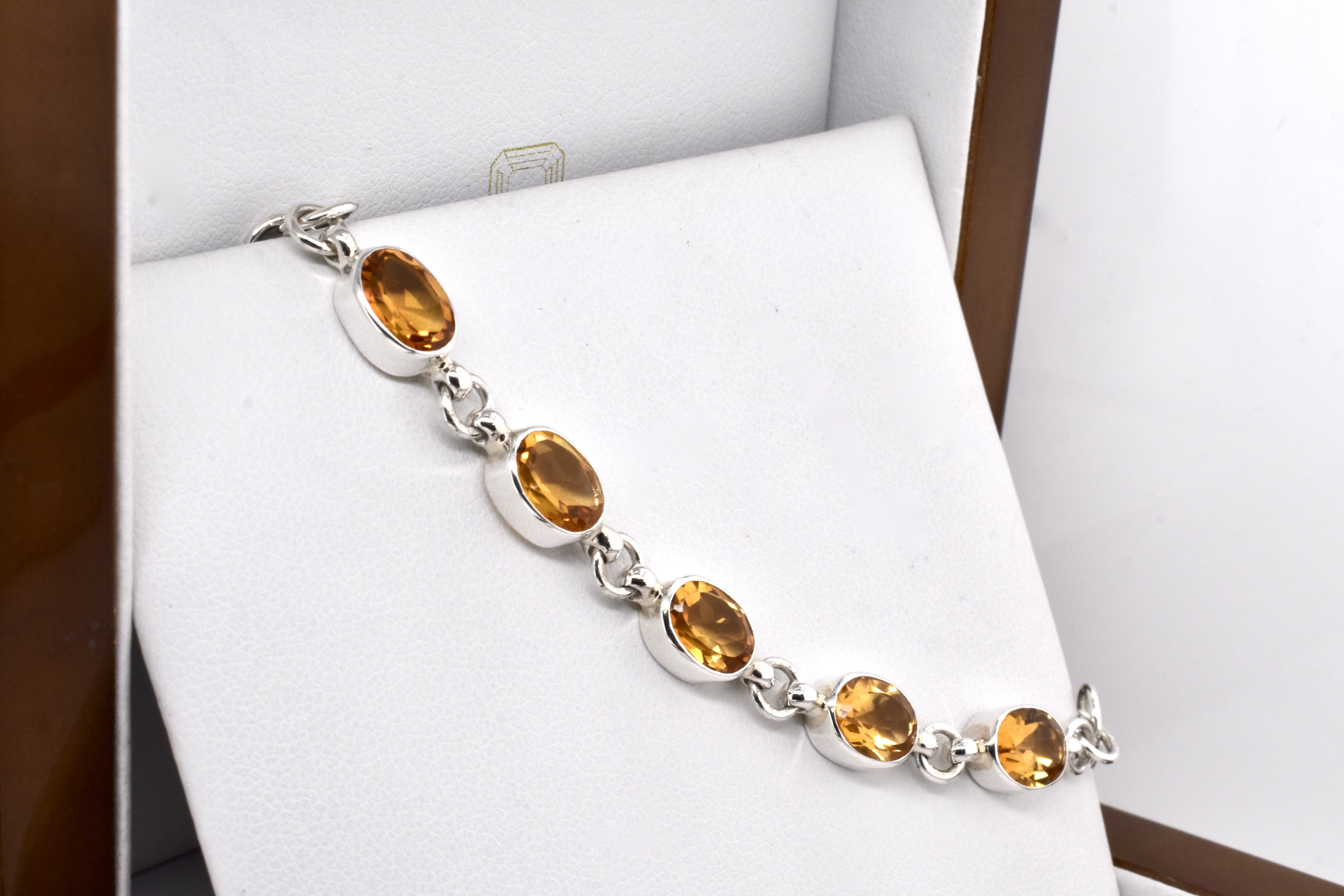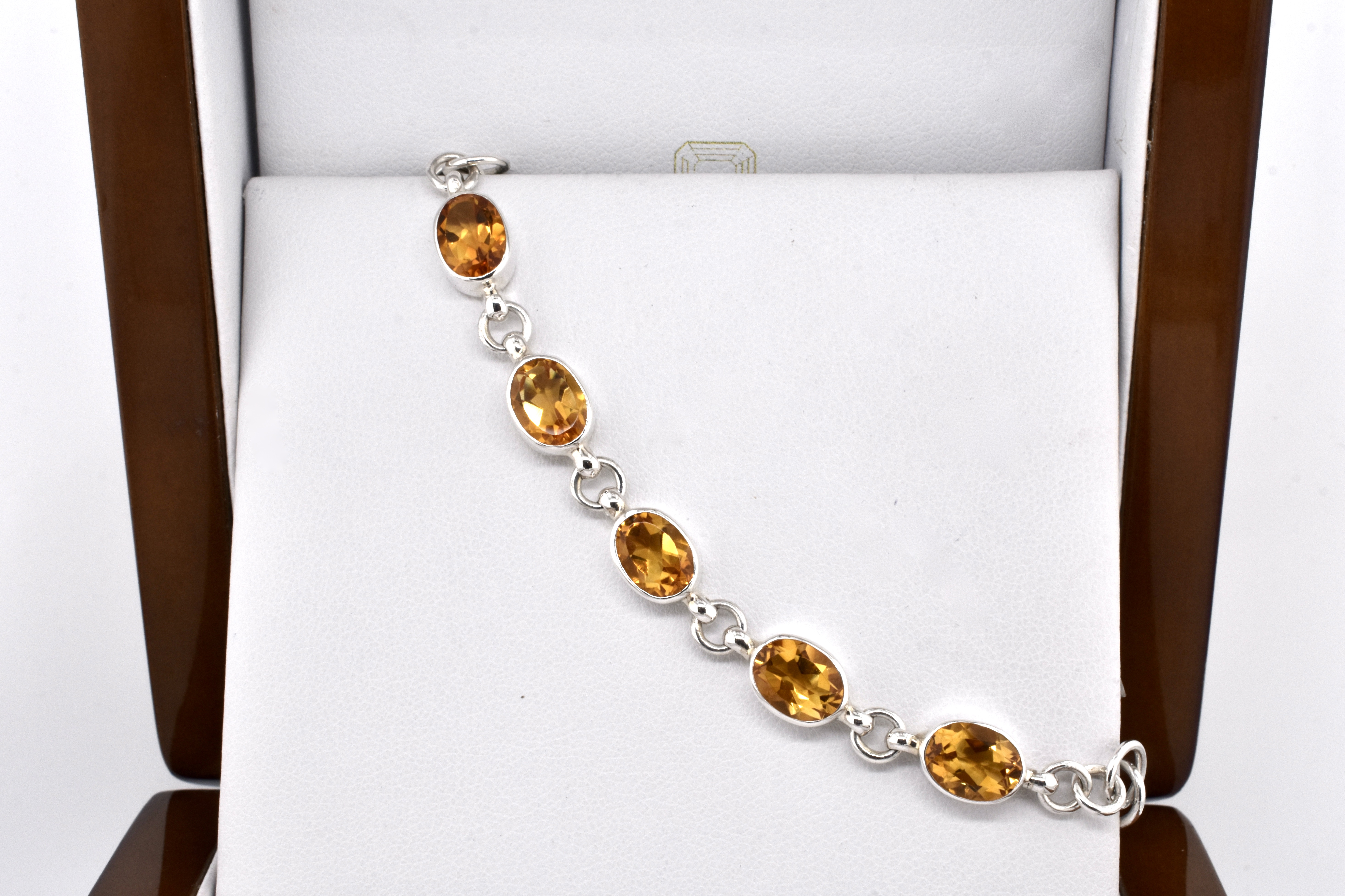 This gorgeous bracelet is handmade in sterling silver and features five oval citrine measuring approx. 8 x 6mm in bezel settings with circular links. Bracelet measures 21cm long