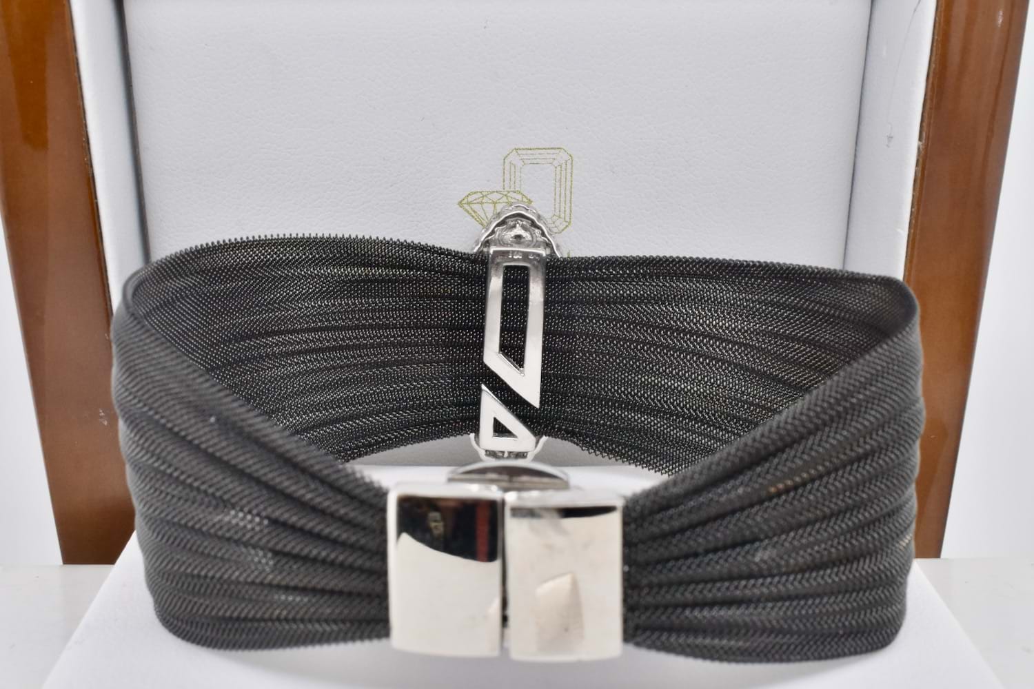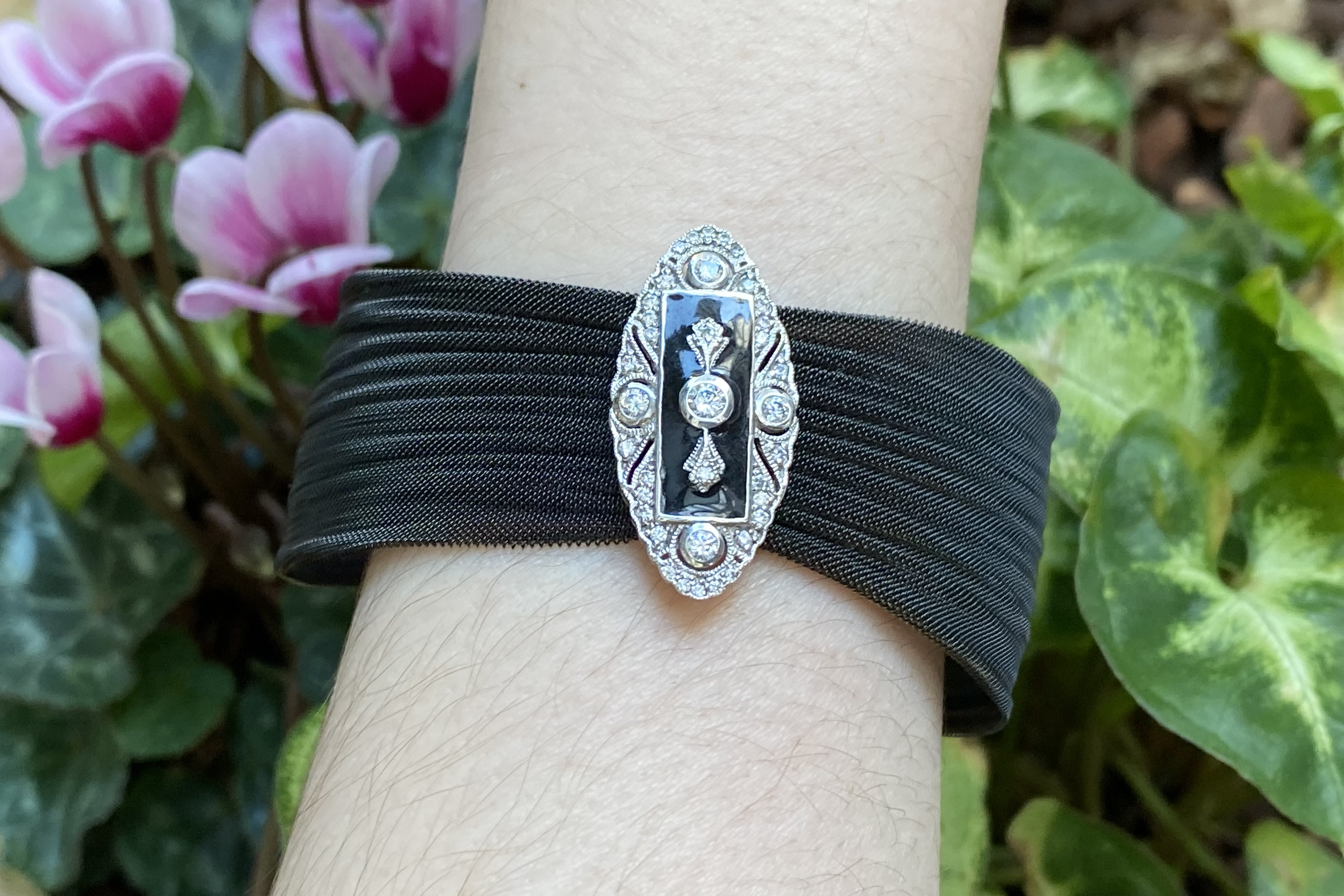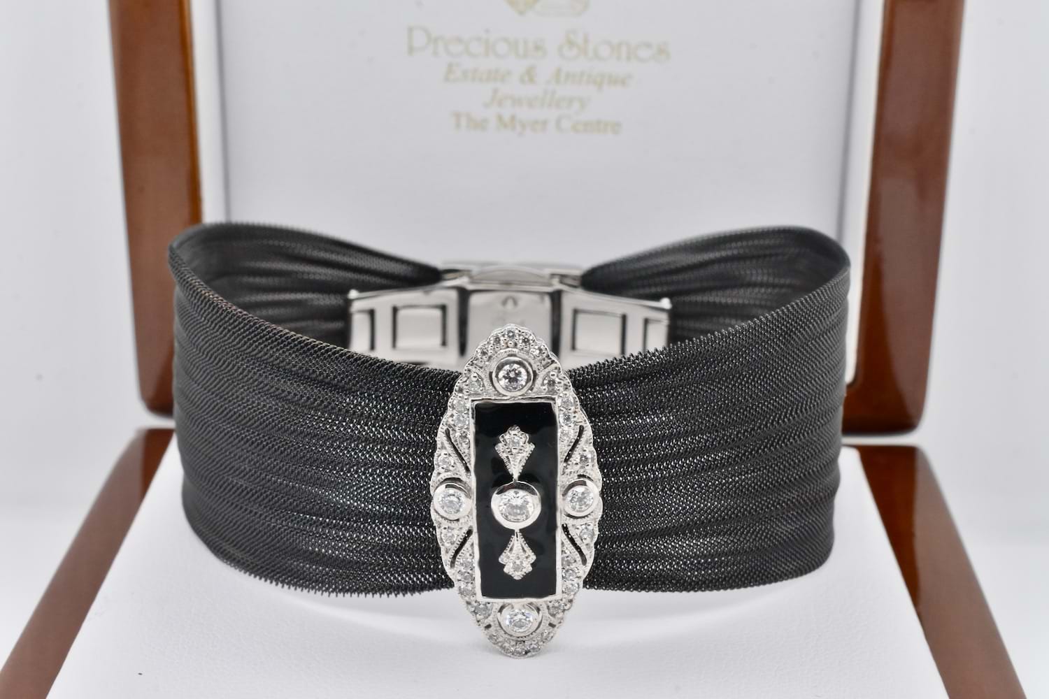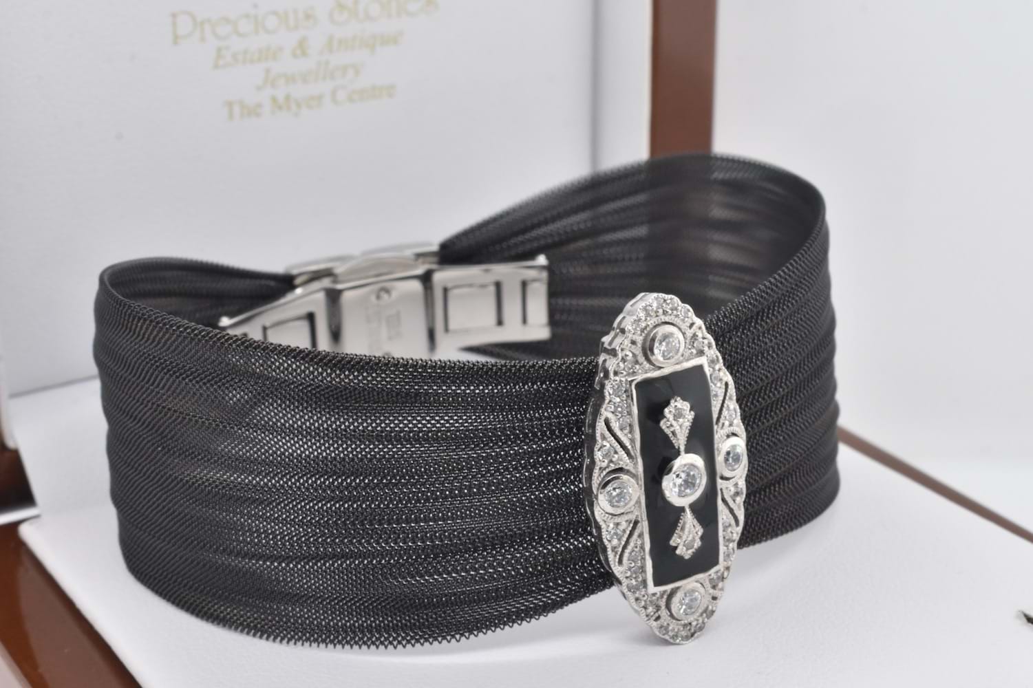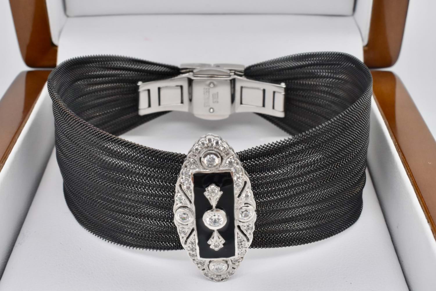 Striking black steel mesh bracelet with a sterling silver onyx and cubic zirconia plate feature in a very Art Deco inspired design