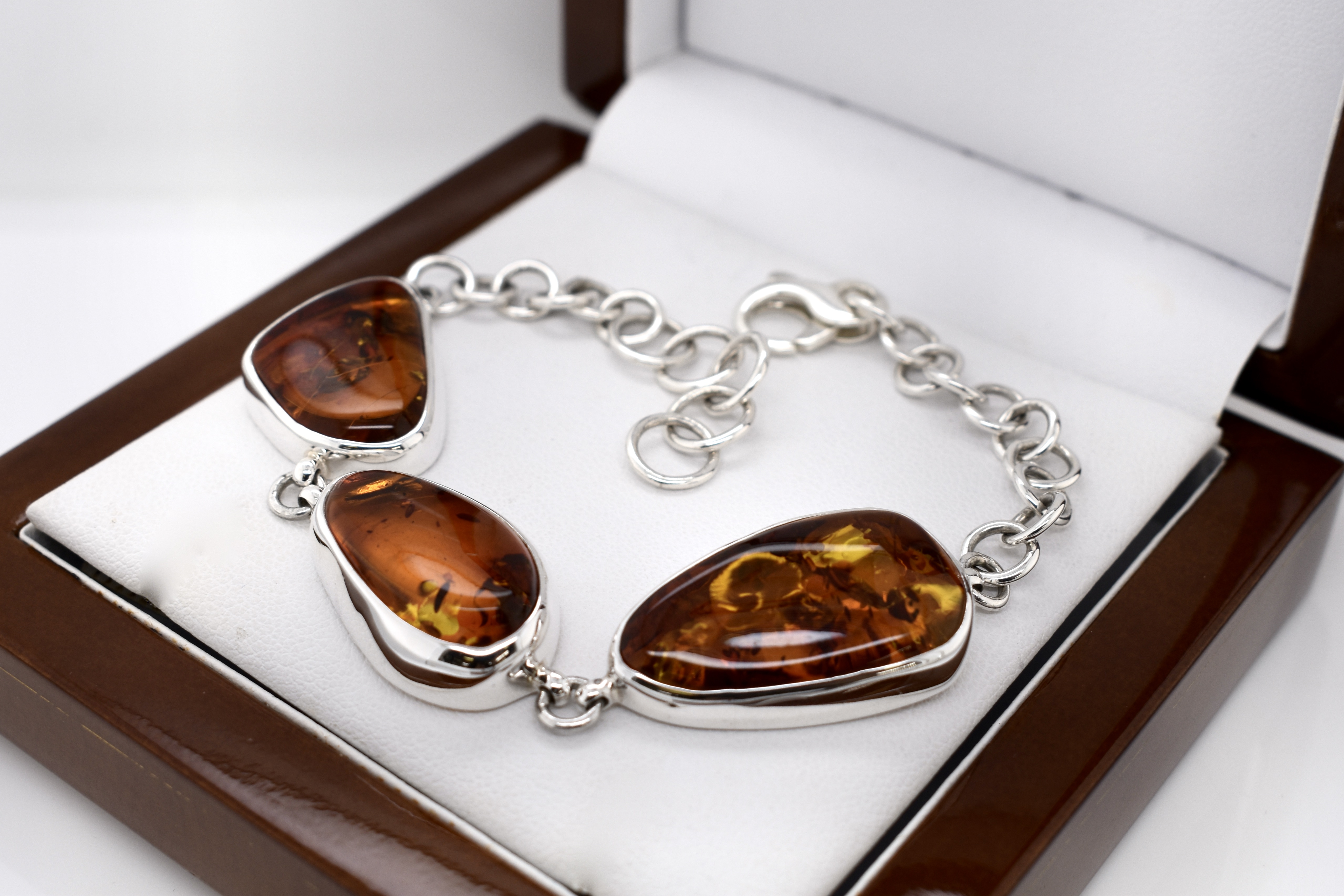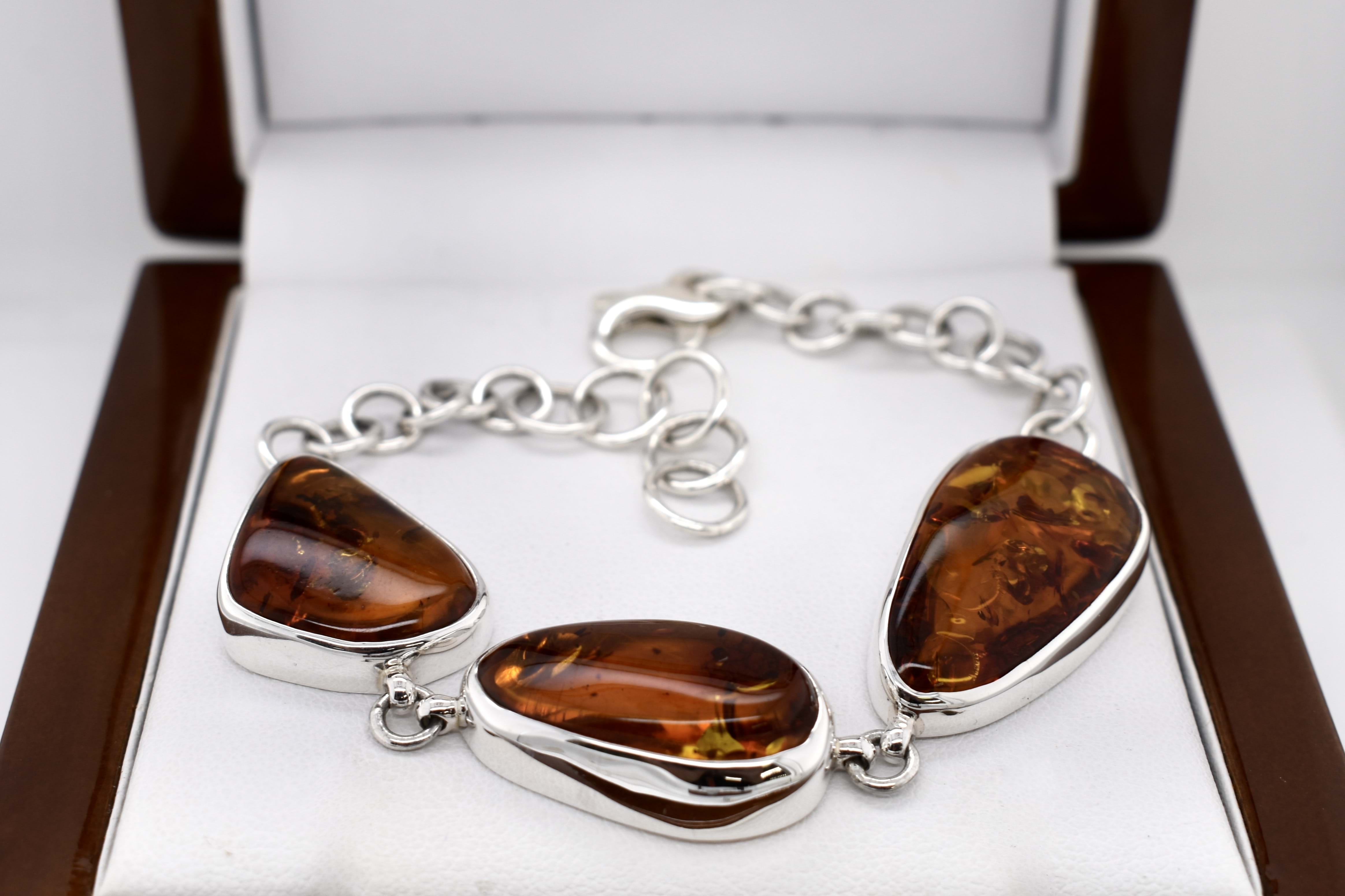 Striking and unique bracelet featuring three pieces of freeform Baltic amber measuring between 15-17x21-28mm and set into handmade bezels in a simple sterling silver bracelet. Length: up to 20cm
