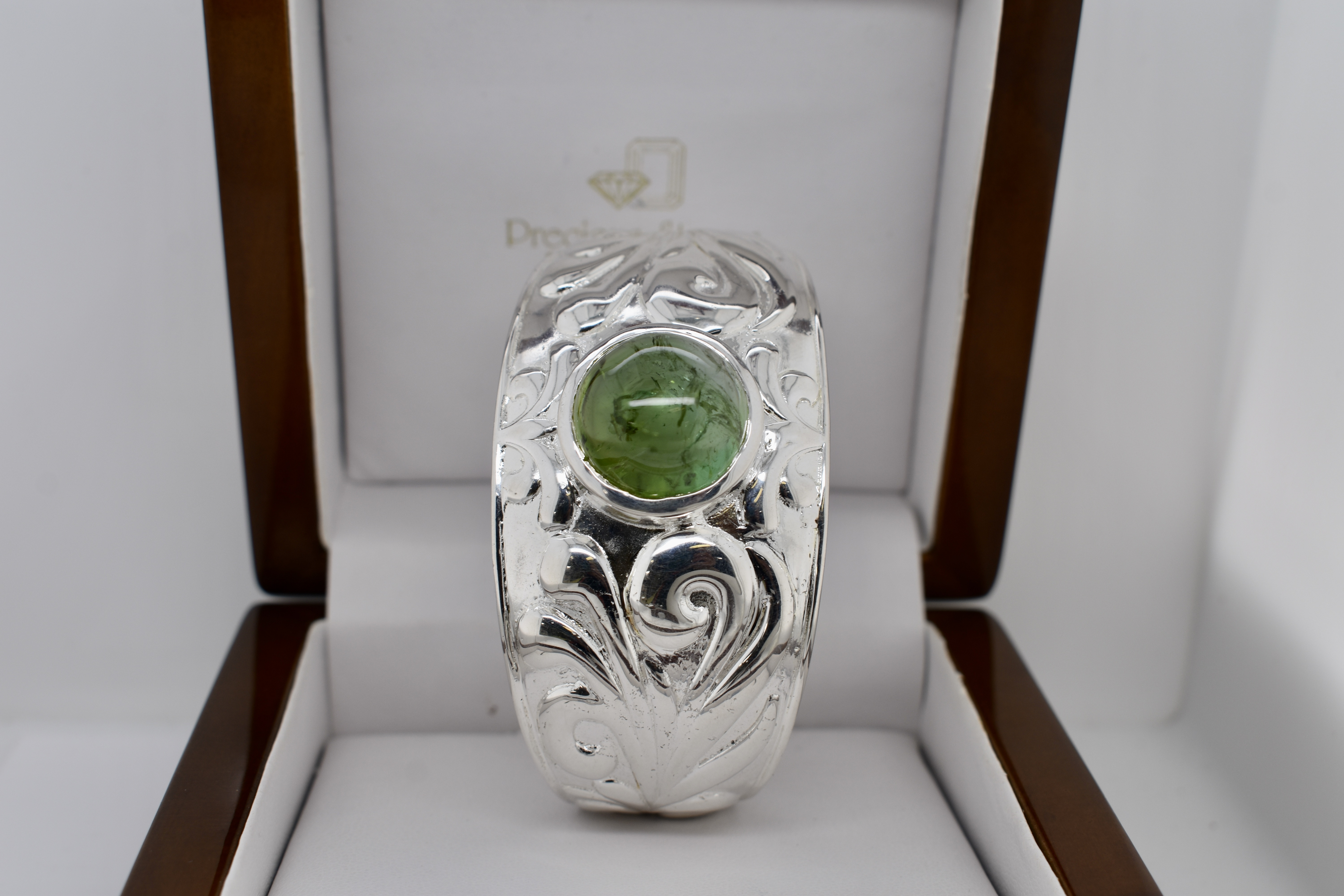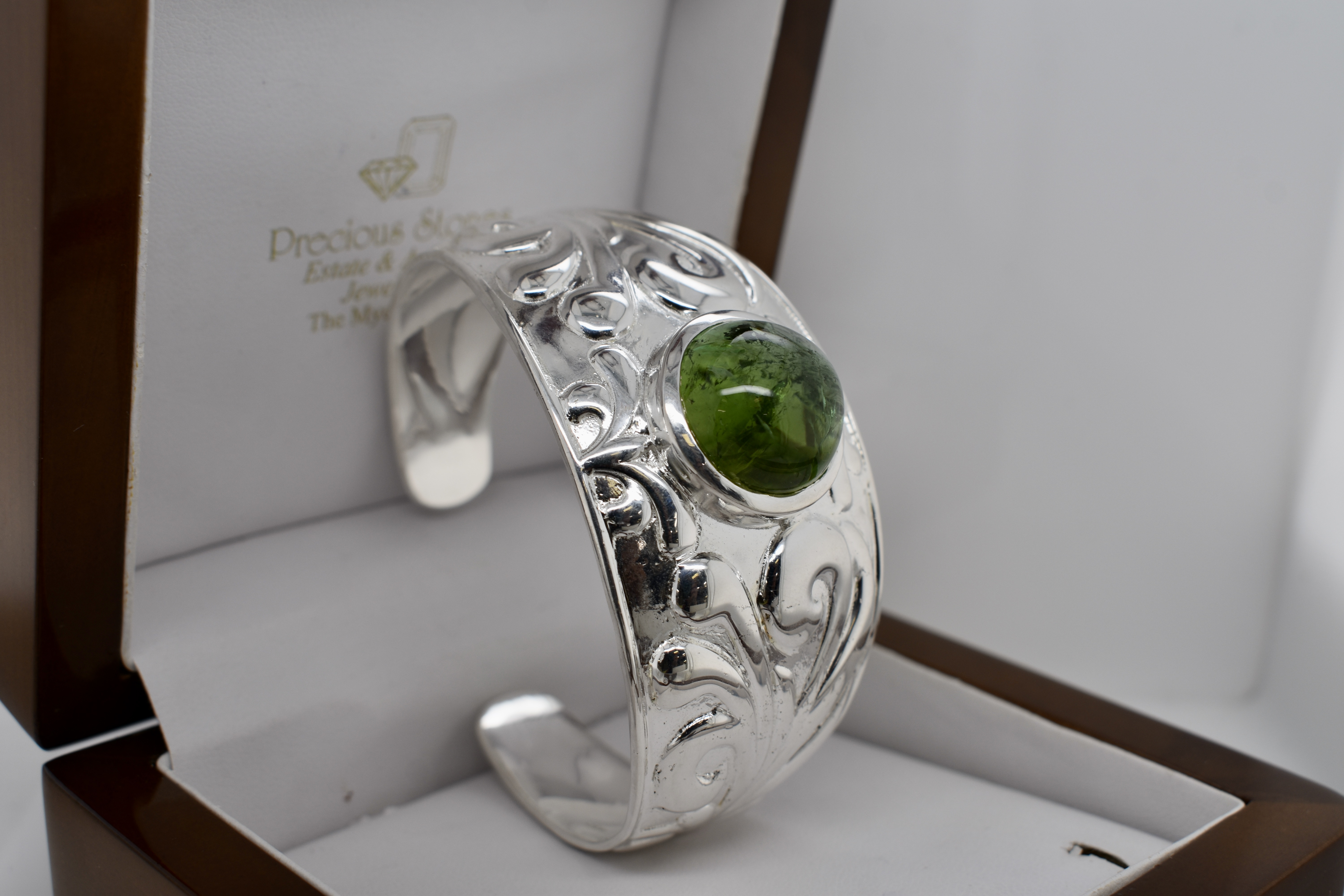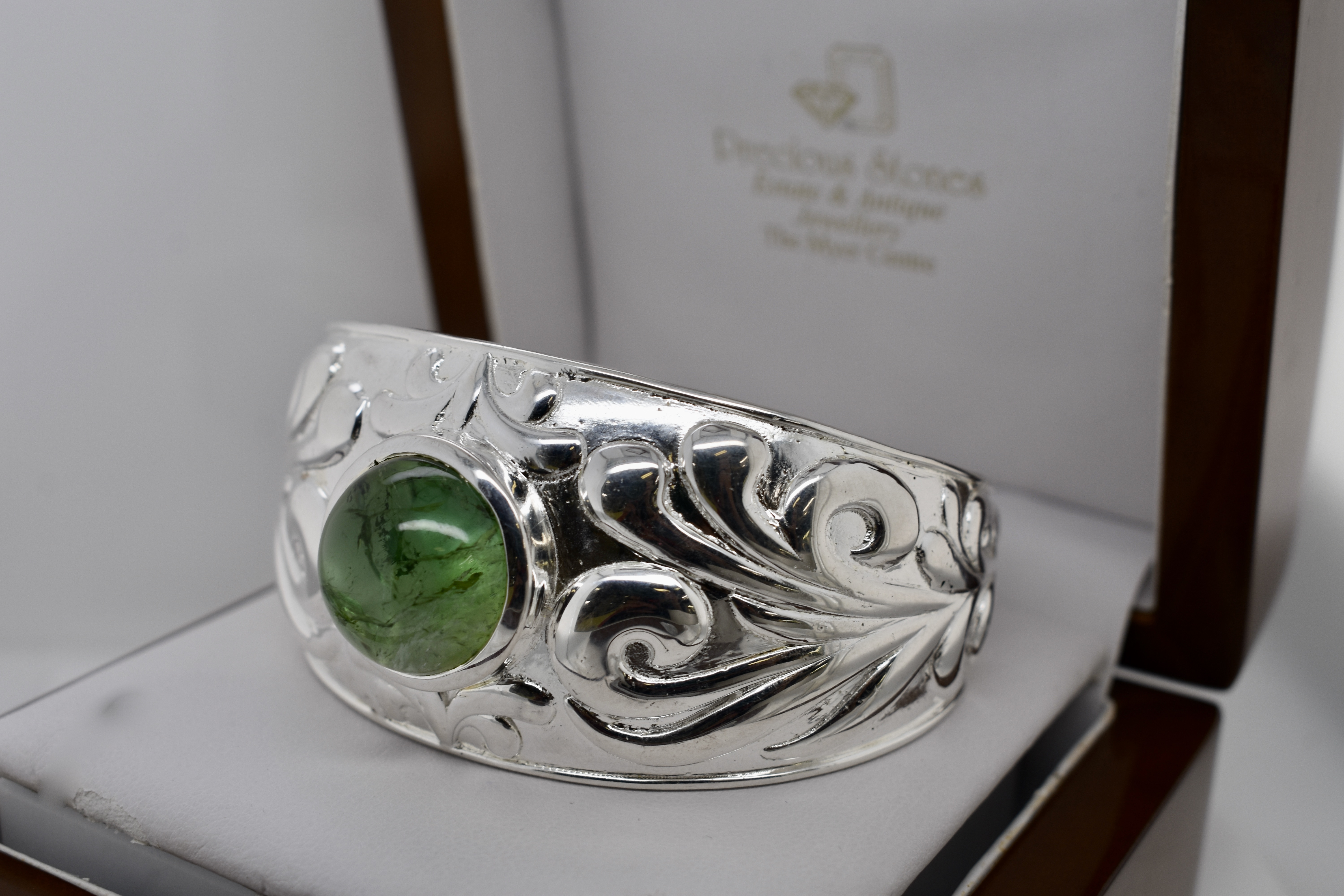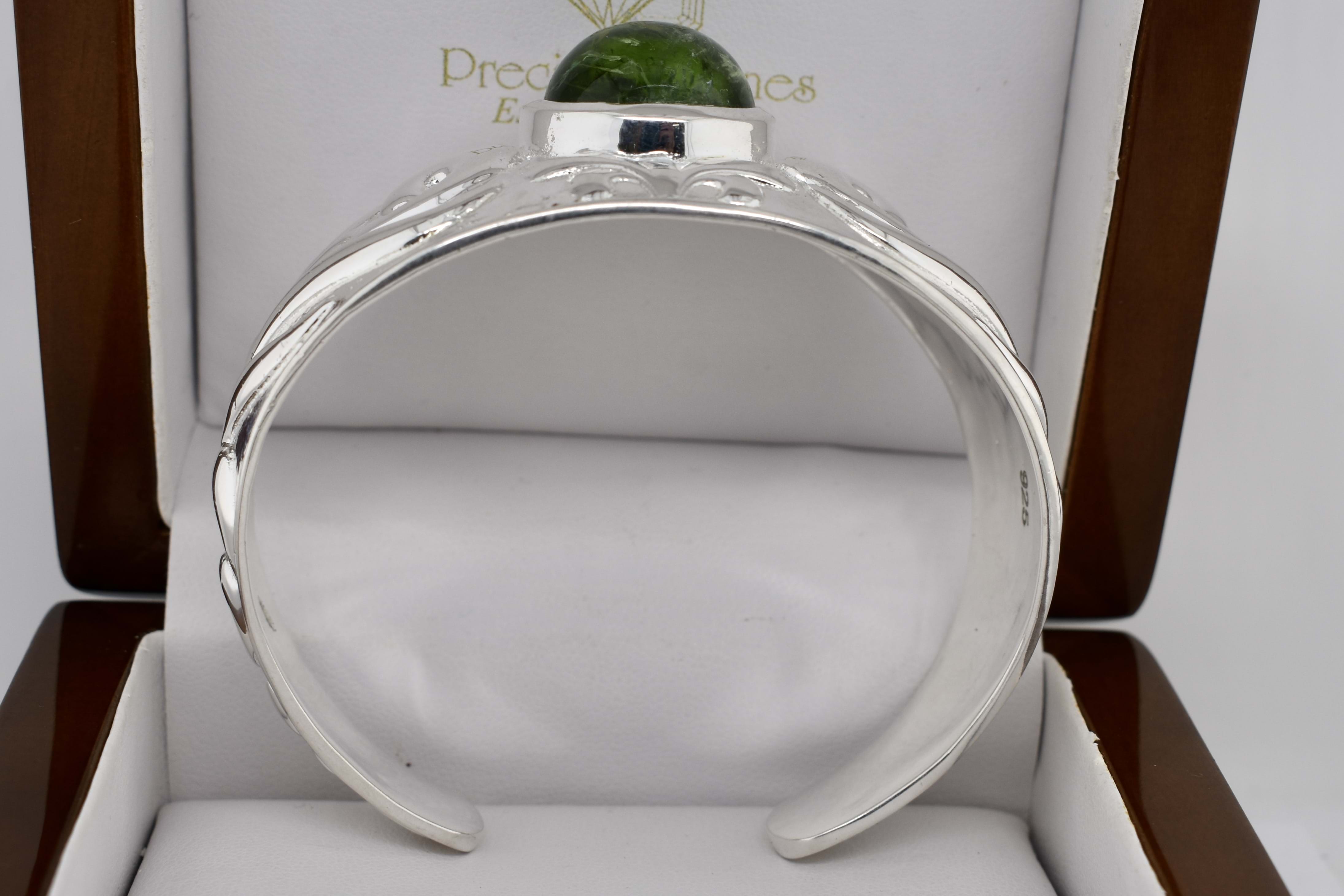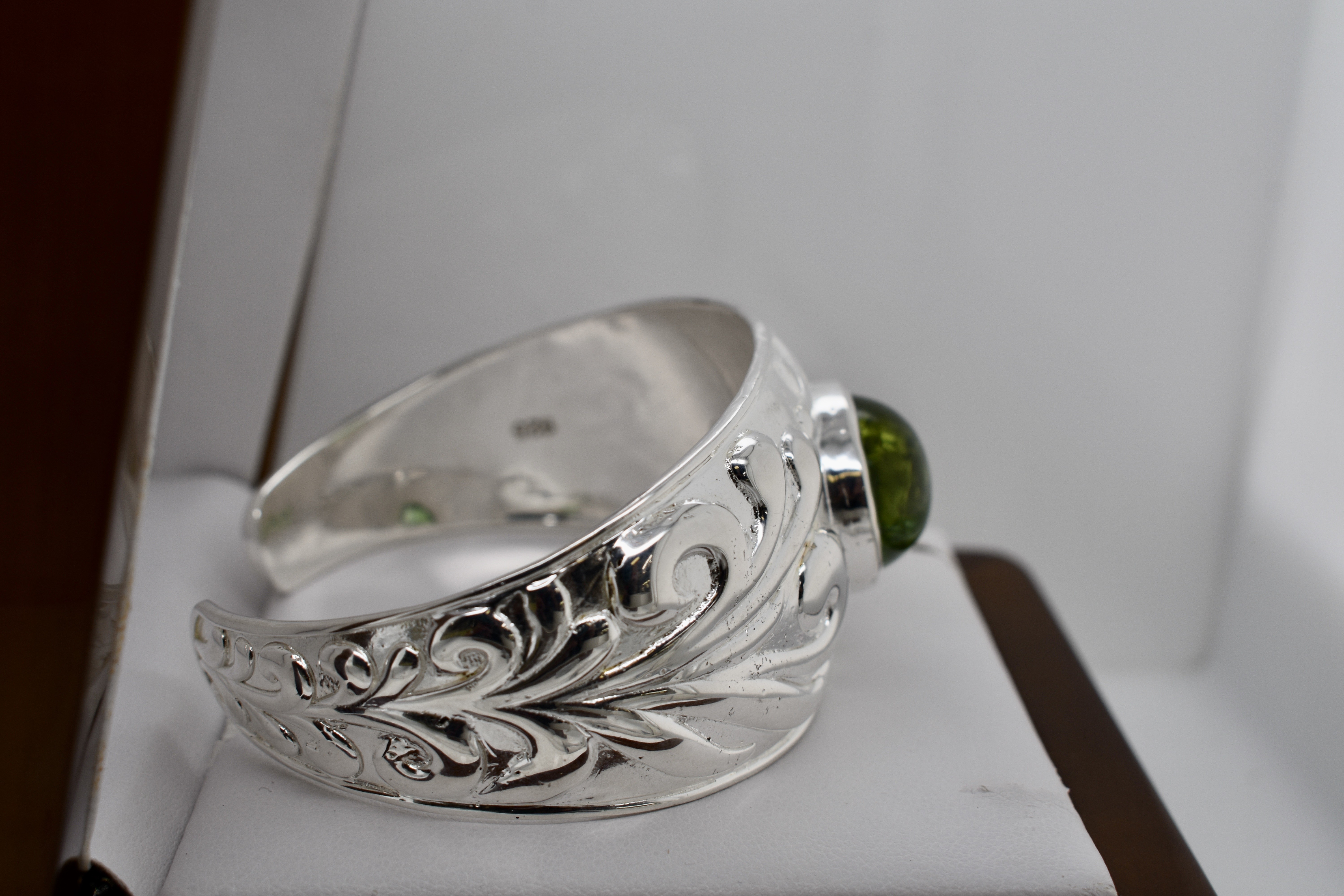 This striking bohemian cuff bangle is made of sterling silver and features one round 17mm cabochon lime green tourmaline in the centre of an embossed scroll cuff. Measuring 35-12mm with an open back.