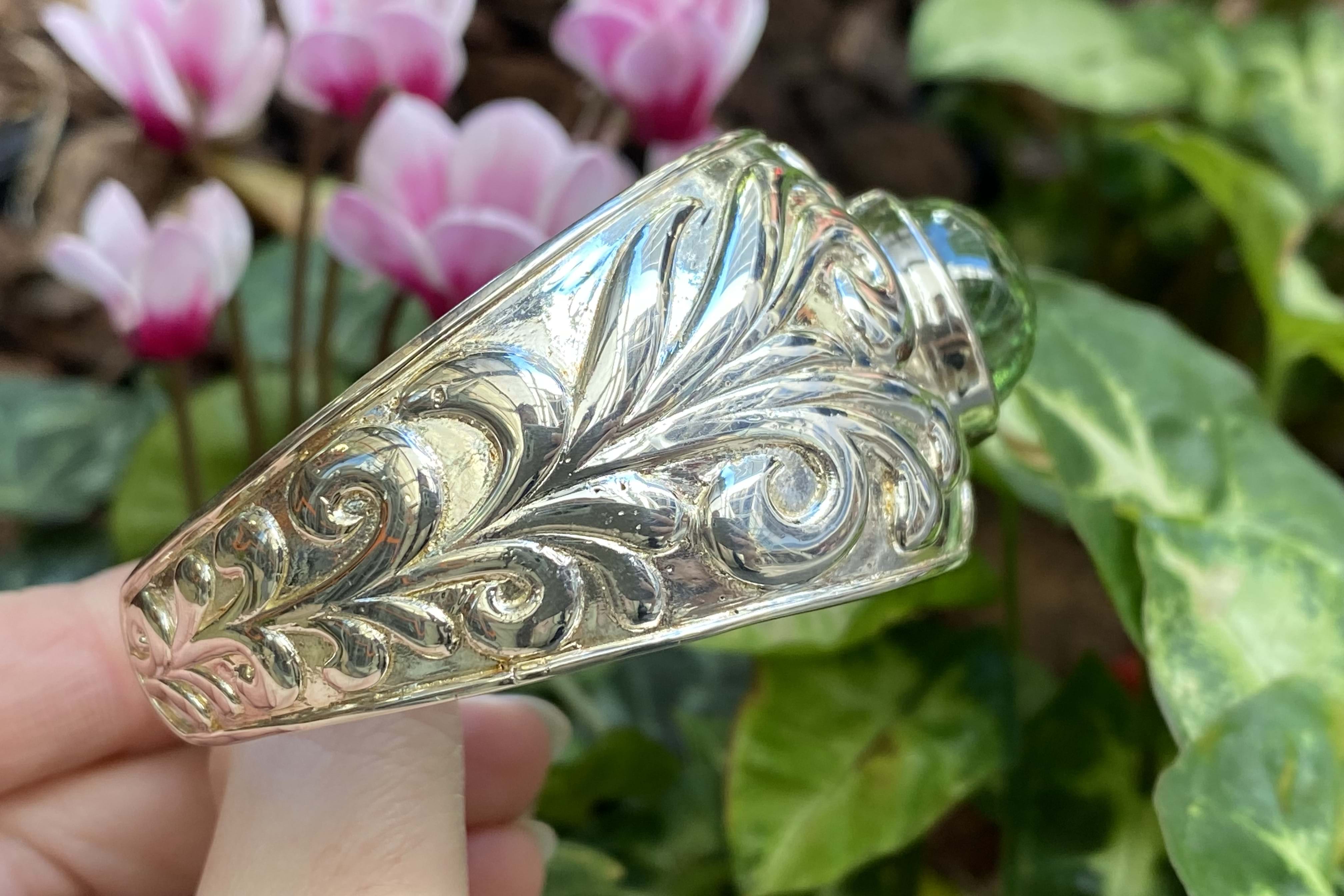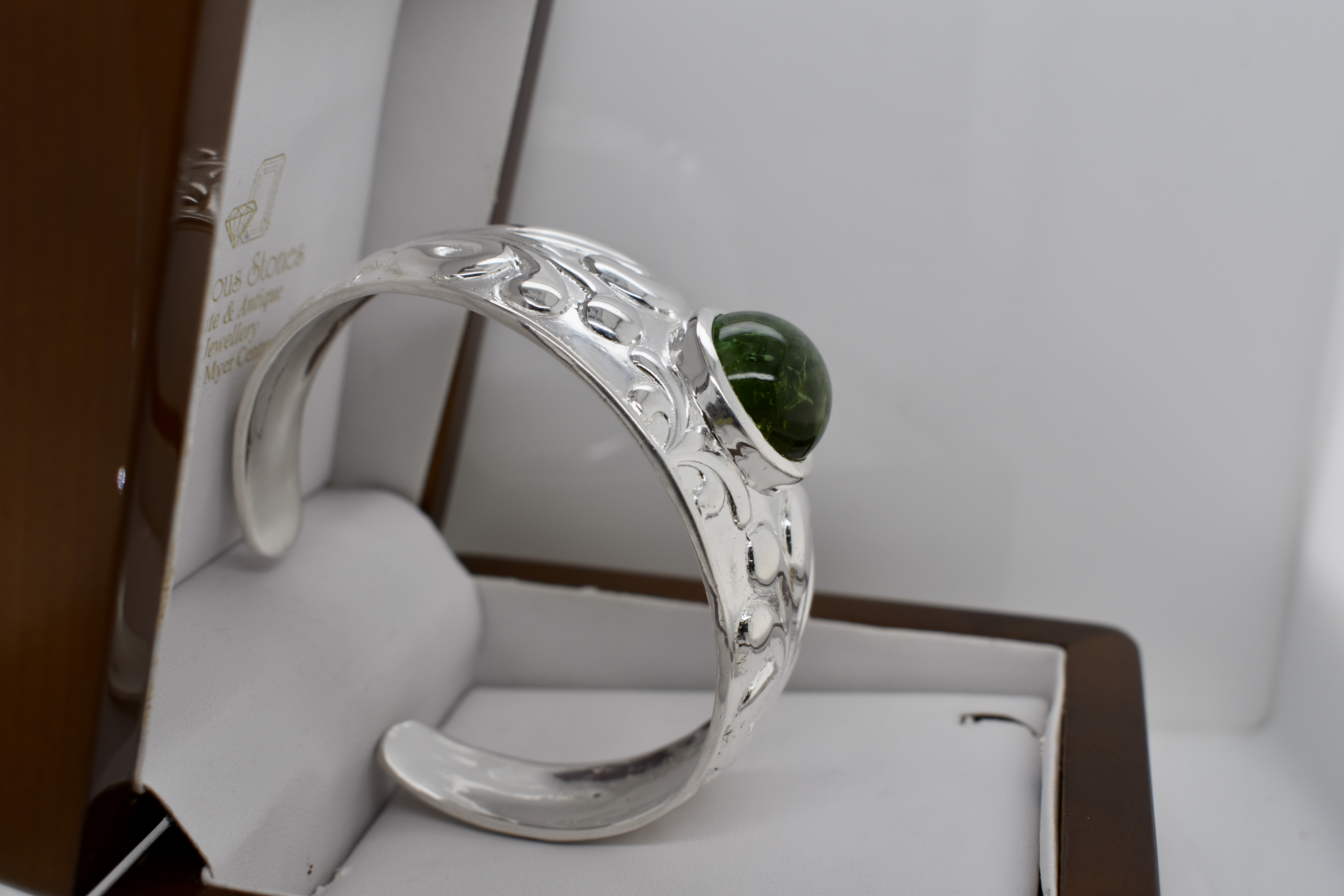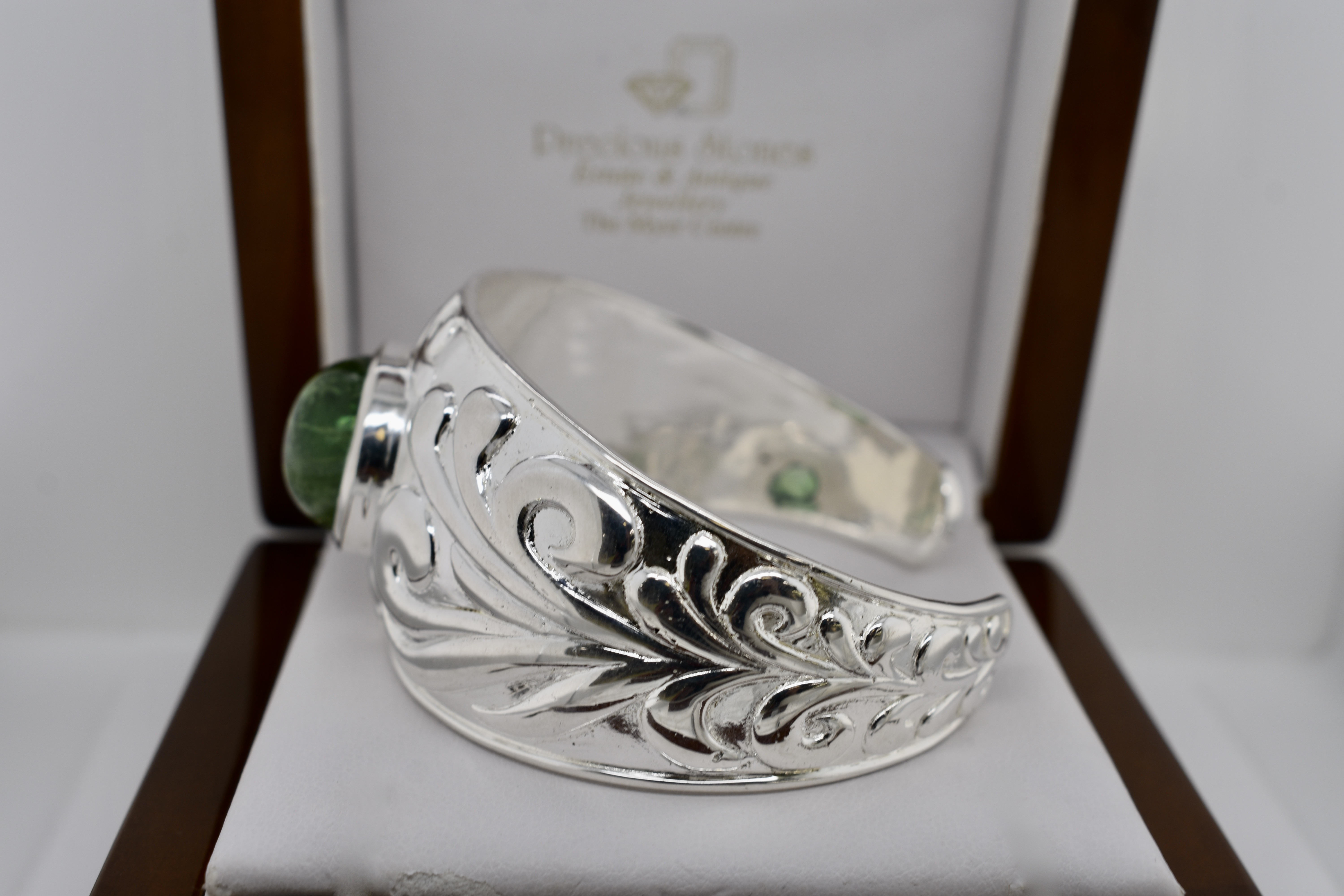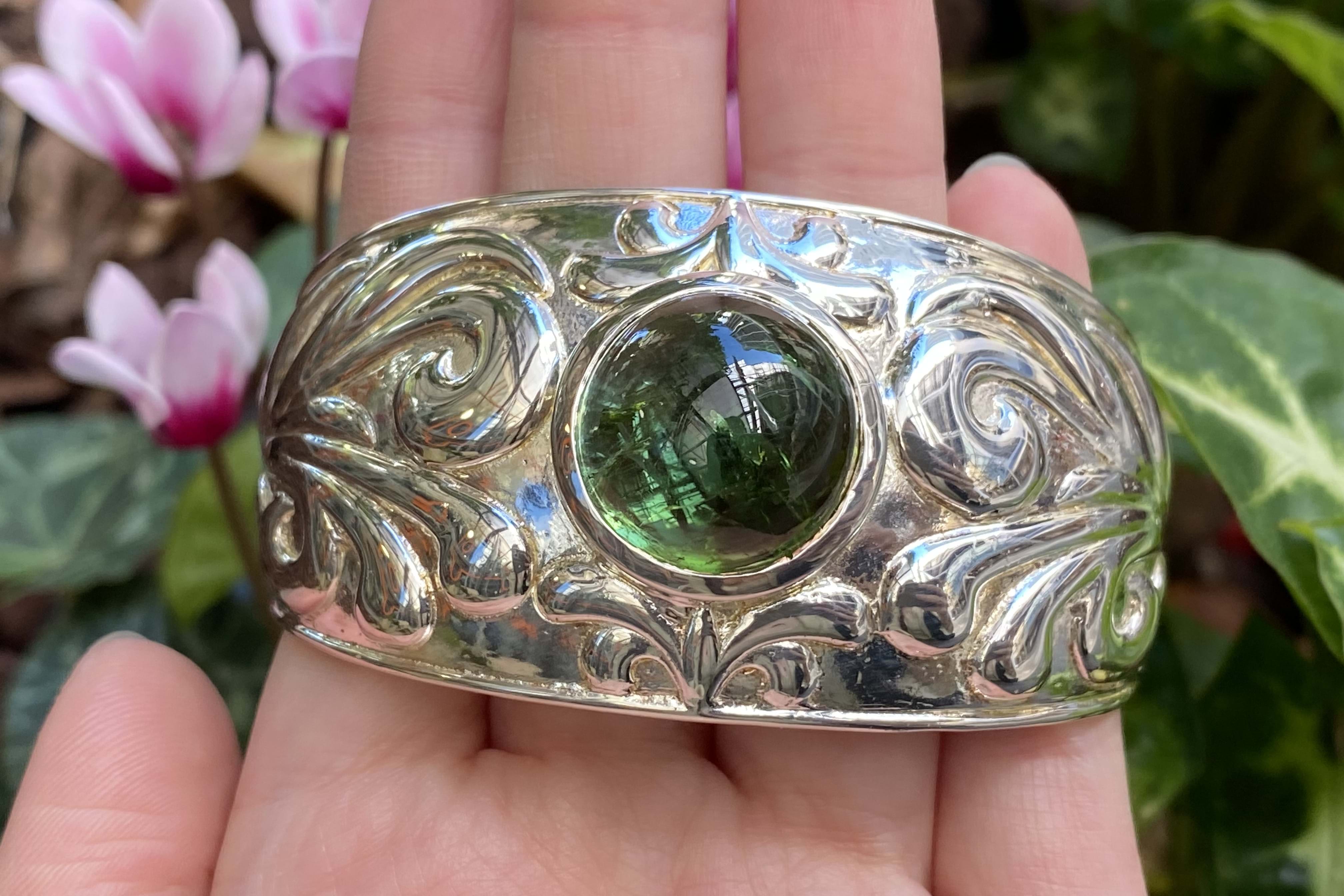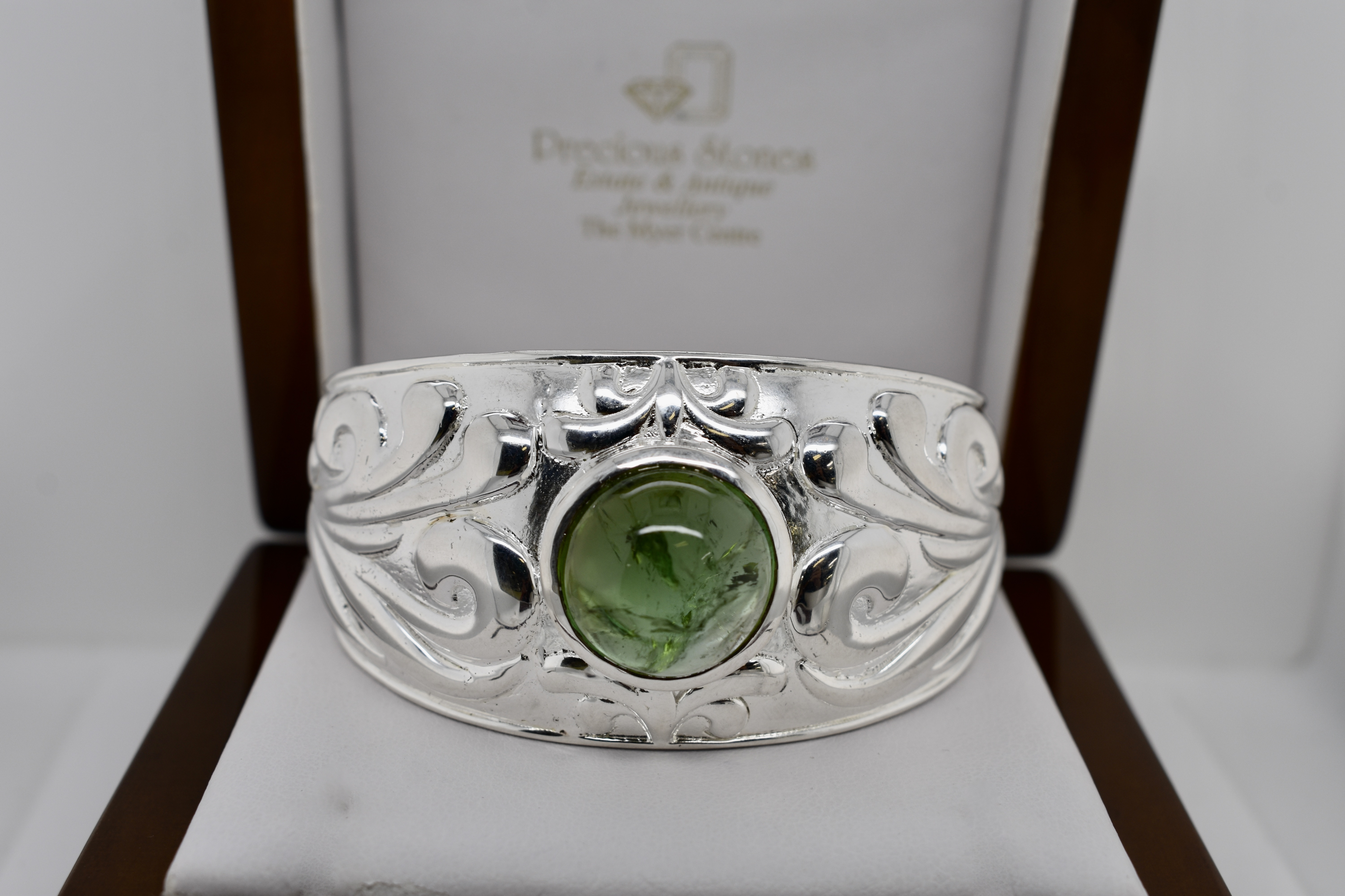 This striking bohemian cuff bangle is made of sterling silver and features one round 17mm cabochon lime green tourmaline in the centre of an embossed scroll cuff. Measuring 35-12mm with an open back.