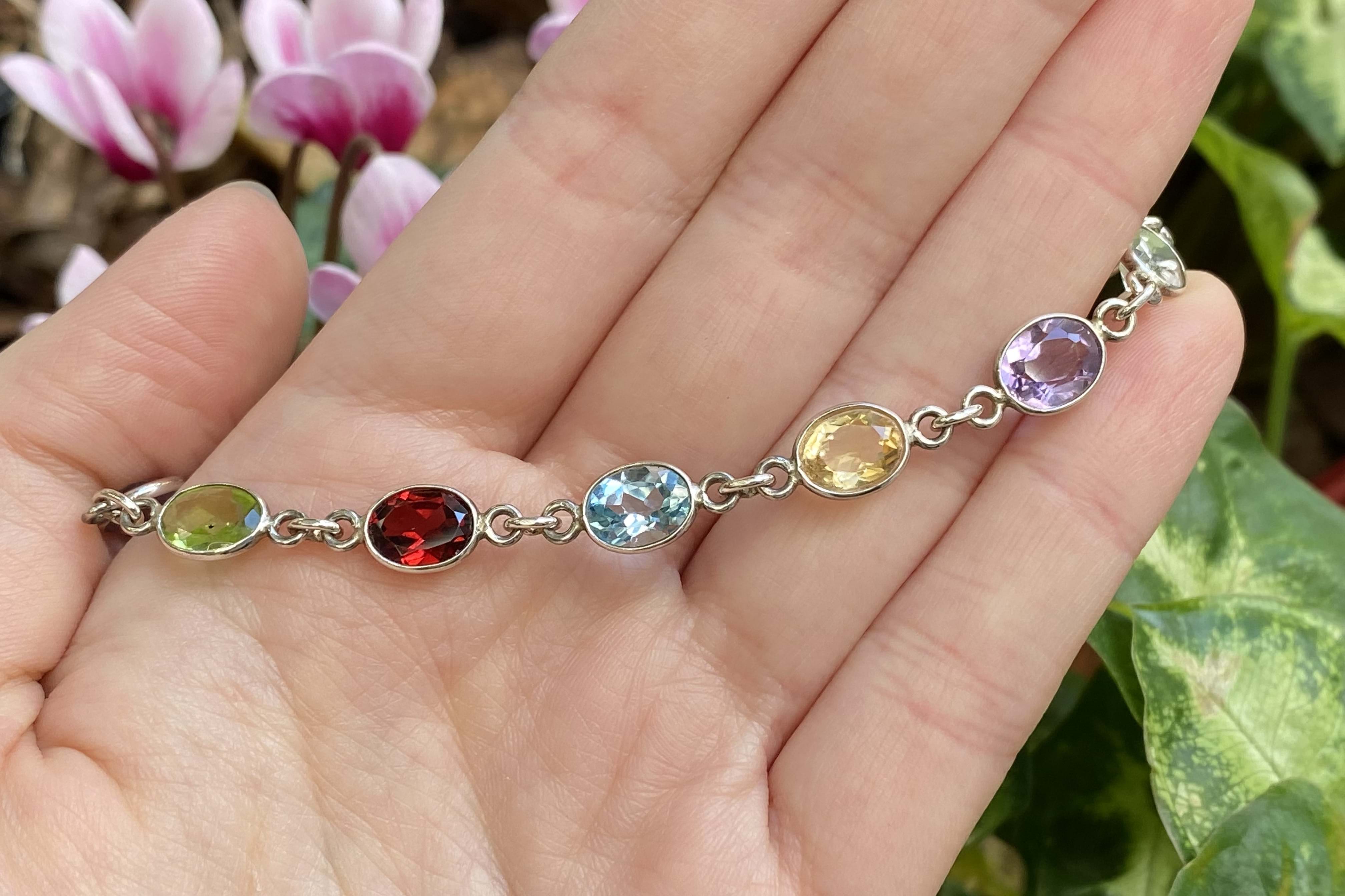 This lovely and colourful bracelet features multiple semi precious gemstones including blue topaz, citrine, amethyst, peridot and garnet, all bezel set in sterling silver. Stones measure approx. 9 x 2mm each, bracelet length is 19.5cm