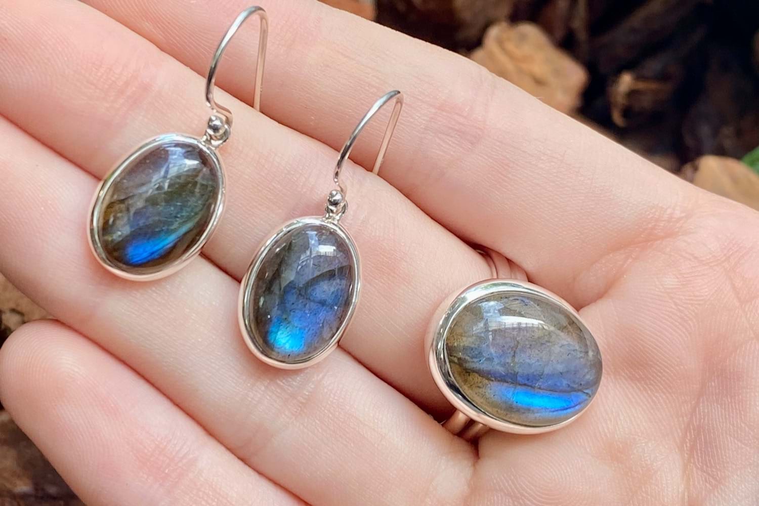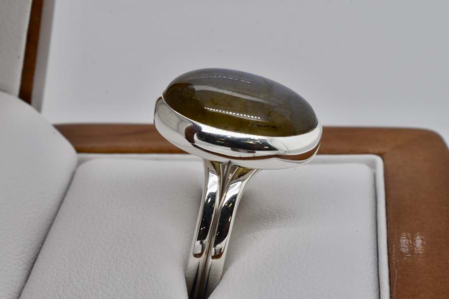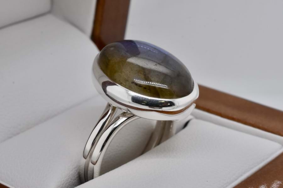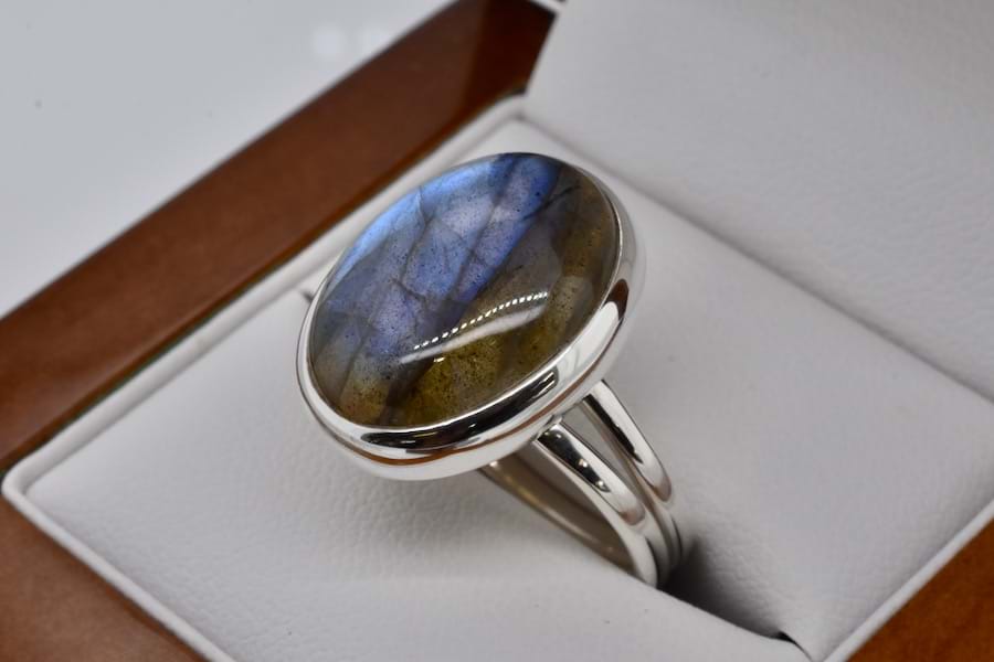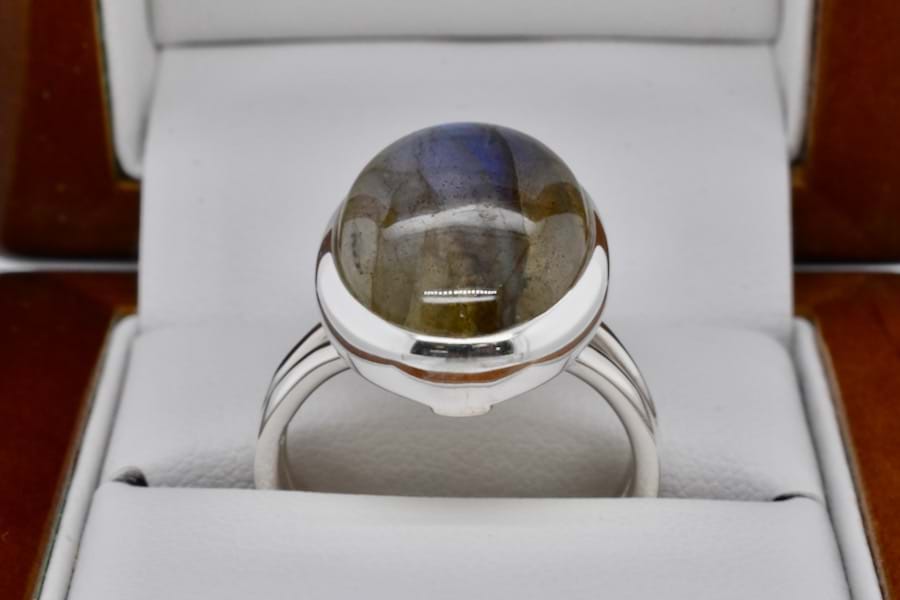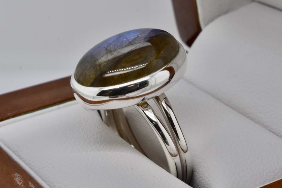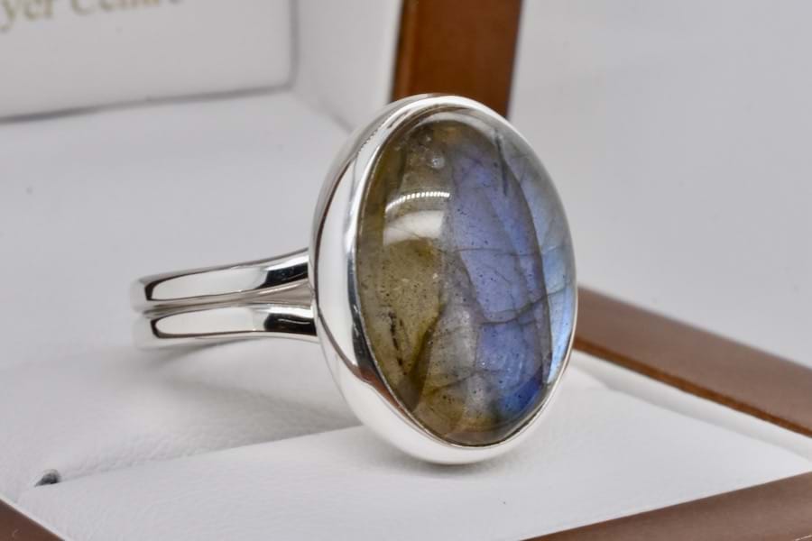 Handmade in sterling silver, this ring is set with an oval cabochon labradorite measuring approx. 20 x 15mm with a lovely blue labradorescence, bezel set with a plain band. Finger size J adjustable