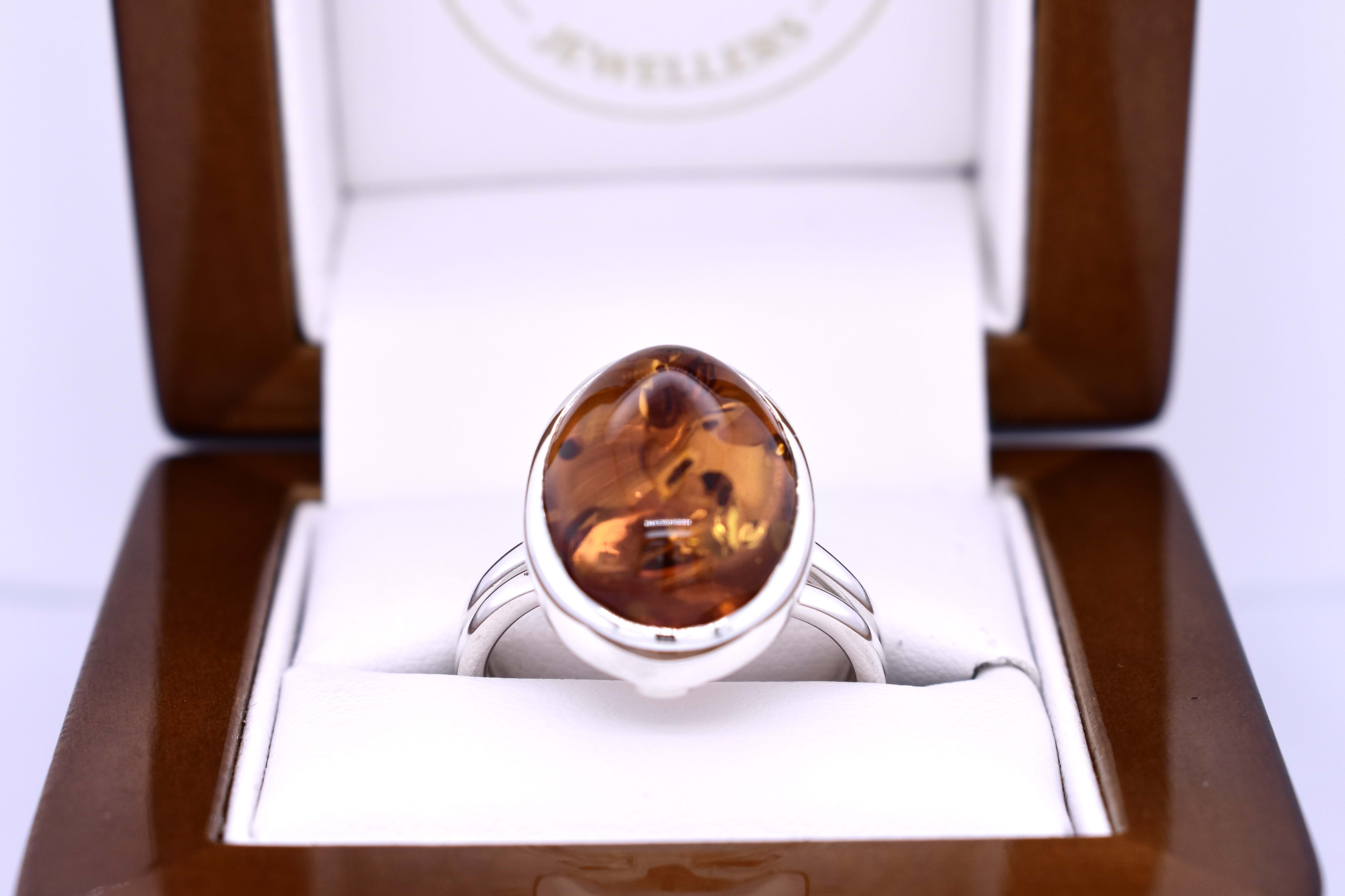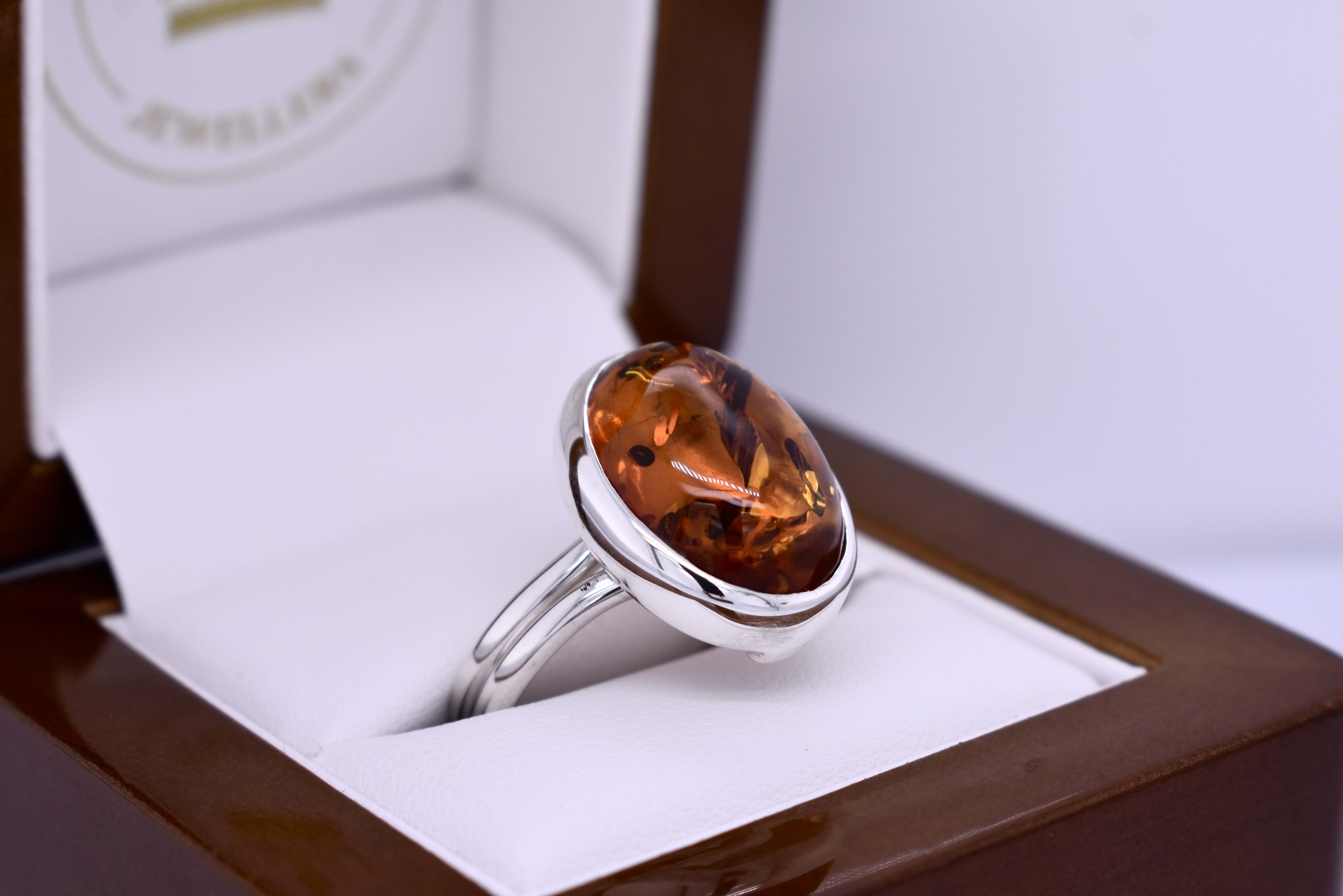 Fascinating oval amber cabochon ring, featuring a 19.6x14.8mm stone, hand crafted in sterling silver with a bezel setting. Completed on an adjustable band. Finger size S adjustable.