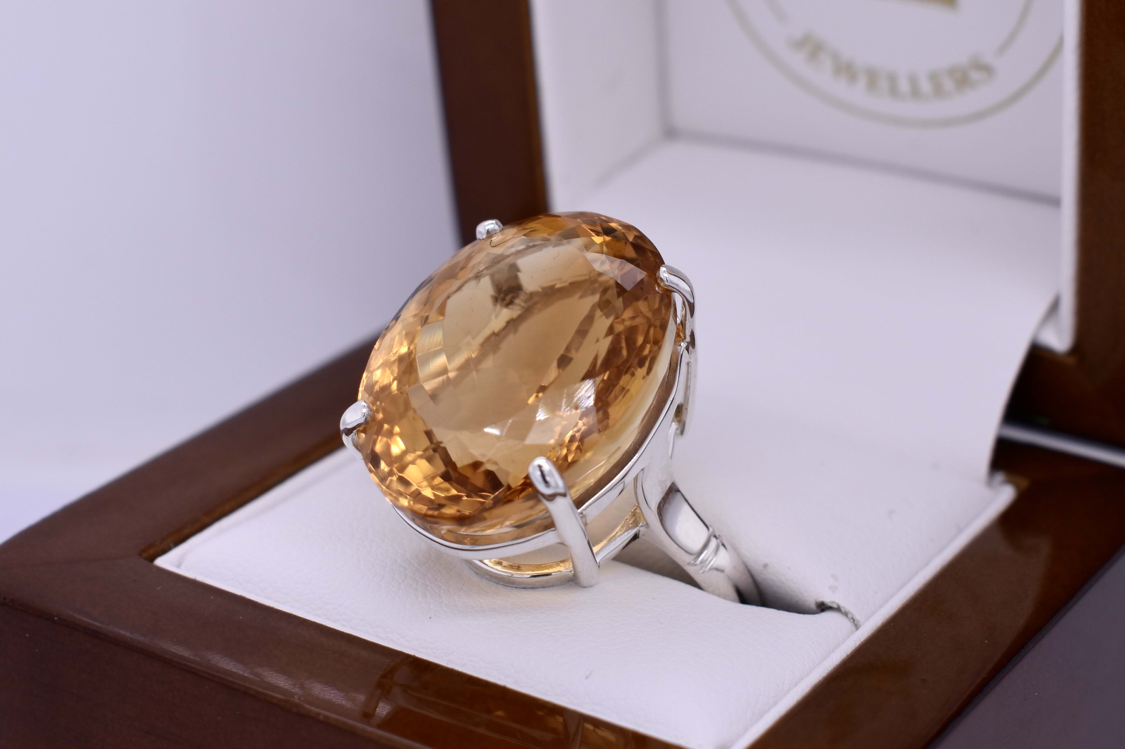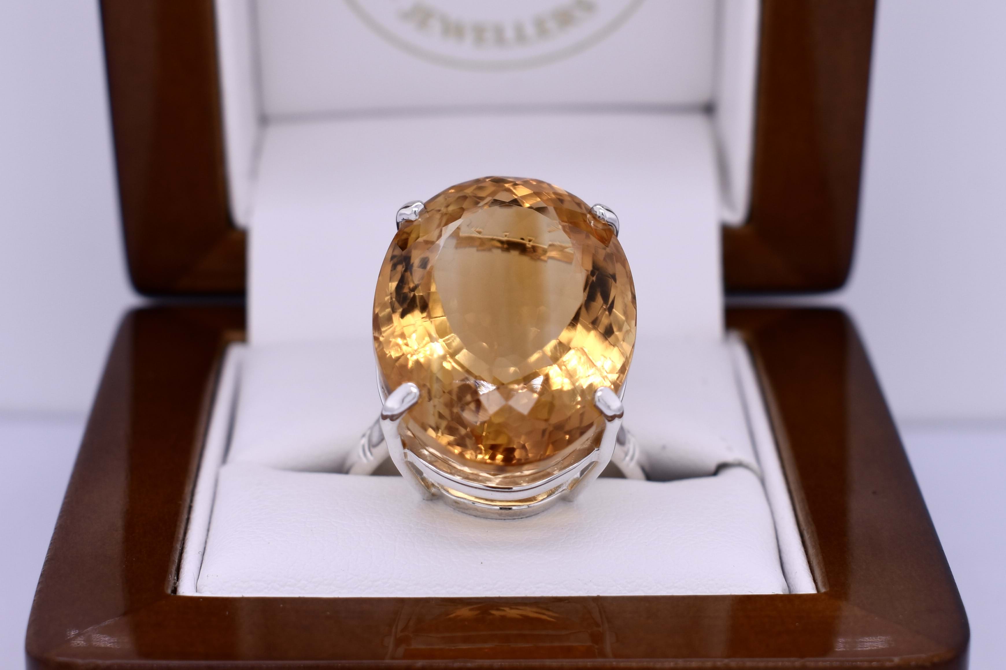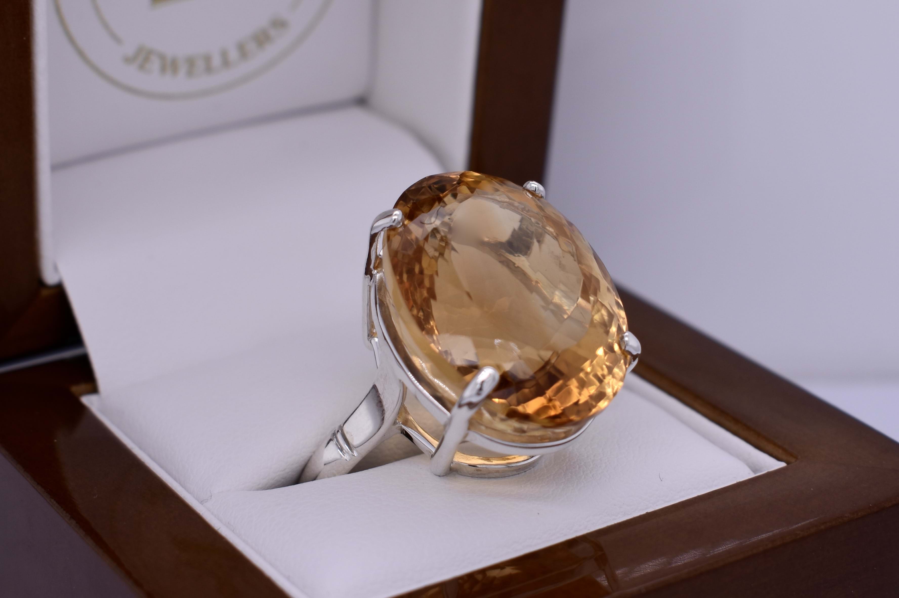 This simple yet eye catching citrine ring contains one vibrant citrine measuring approx. 23.8x18.0mm four claw set into a beautiful handmade sterling silver setting, finished with a plain band. Finger size U+